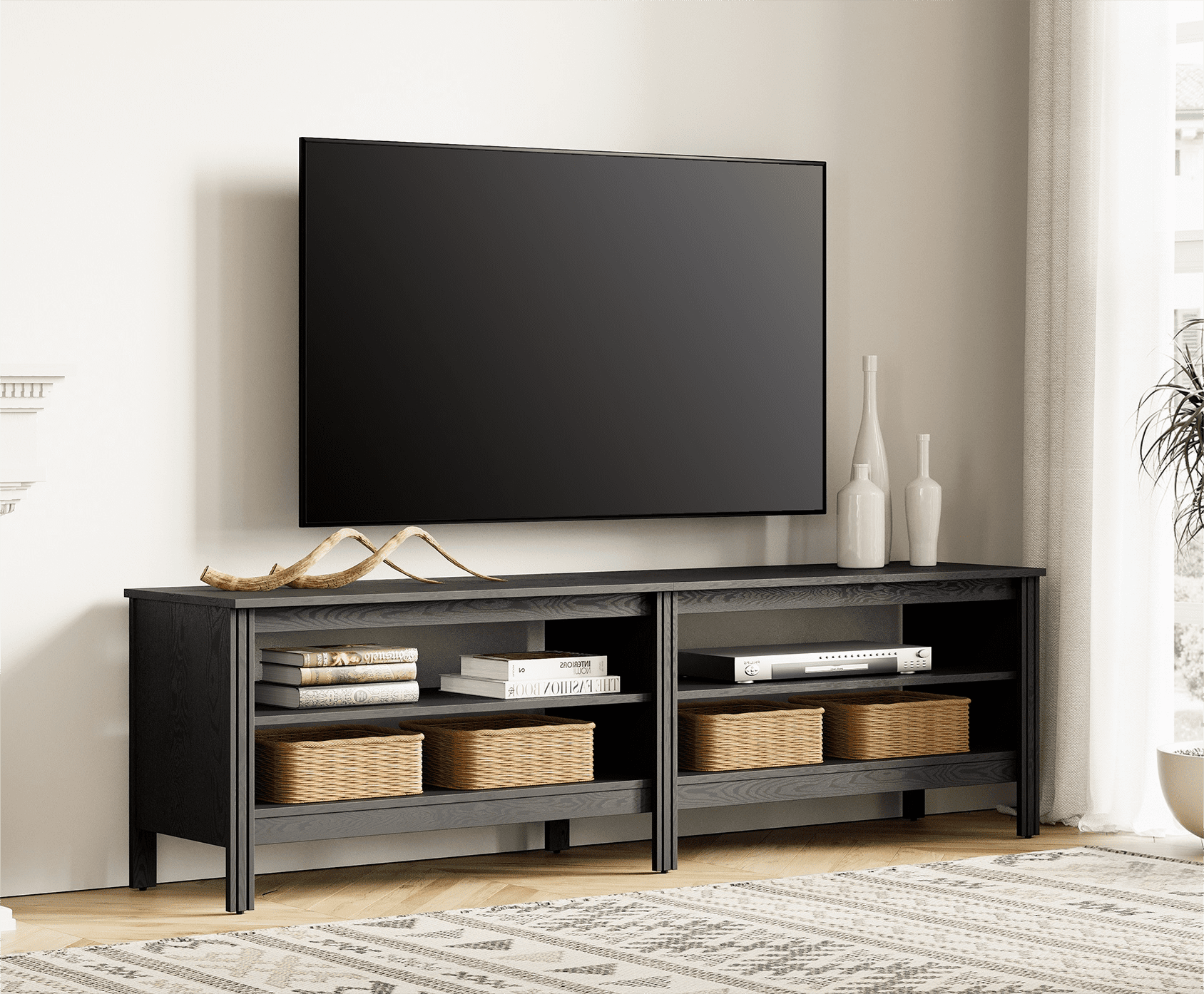 TV Cabinet / TV Table / Entertainment Center TV Unit: Farmhoues Design & Multifunction—The espresso wood grain and simple lines on this entertainment stand make it look classic and elegant. It can be not only used as TV stand, also perfect for sofa table, hallway Table, entry table, entertainment center, media stand, storage console table, etc. Large Capacity—This TV stand is perfect for TVs up to 65 inch TV.4 open shelves with big capacity allow you to storage the books, magazines, CDs and any other media or gaming devices. Stable Structure& Easy To Clean–Made from high-grade certified MDF for long-lasting construciton.Rich brown wood grain finish is easy to clean.And its smooth waterproof surface is easy to clean with a soft damp cloth to facilitate your daily cleaning work. Accessible for Robot Vacuum Cleaner—The tv table is 3.9 in high height off the ground which adequate for robot vacuum cleaner can passing freely. No more headaches from dust under the cabinet. Easy to Assemble & Dimension—With detailed instructions and all hardware delivered, the wood TV stand for 65 inch TV is effortless to assemble.Dimension:60″ L * 15.5″ W * 23.6″ H.Max load capacity: 175 lbs.