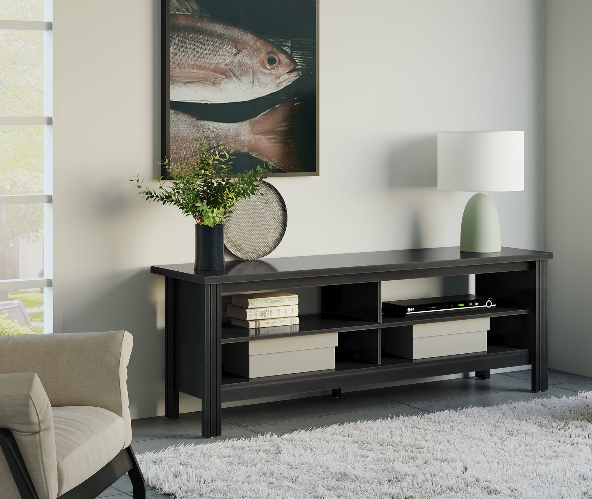 TV Cabinet / TV Table / Entertainment Center TV Unit: 【Farmhoues Design & Multifunction】The black wood grain and simple lines on this entertainment stand make it look classic and elegant. It can be not only used as TV stand, also perfect for sofa table, hallway Table, entry table, entertainment center, media stand, storage console table, etc. 【Large Capacity】This TV stand is perfect for TVs up to 65 inch TV.4 open shelves with big capacity allow you to storage the books, magazines, CDs and any other media or gaming devices. 【Stable Structure& Easy To Clean】Made from high-grade certified MDF for long-lasting construciton.Rich black wood grain finish is easy to clean.And its smooth waterproof surface is easy to clean with a soft damp cloth to facilitate your daily cleaning work. 【Accessible for Robot Vacuum Cleaner】The tv table is 3.9 in high height off the ground which adequate for robot vacuum cleaner can passing freely. No more headaches from dust under the cabinet. 【Easy to Assemble & Dimension】With detailed instructions and all hardware delivered, the wood TV stand for 65 inch TV is effortless to assemble.Dimension:60″ L * 15.5″ W * 20.9″ H.Max load capacity: 175 lbs. “