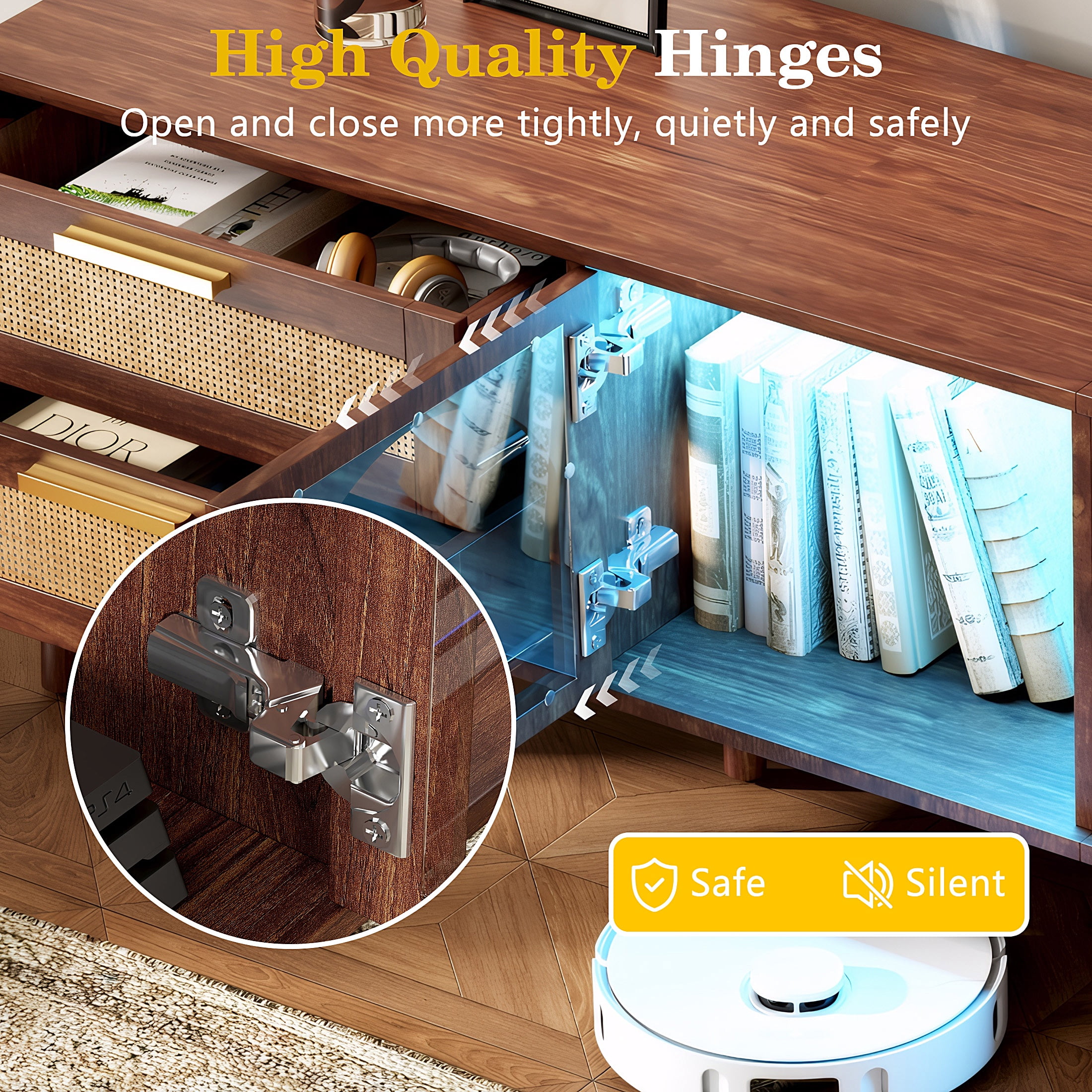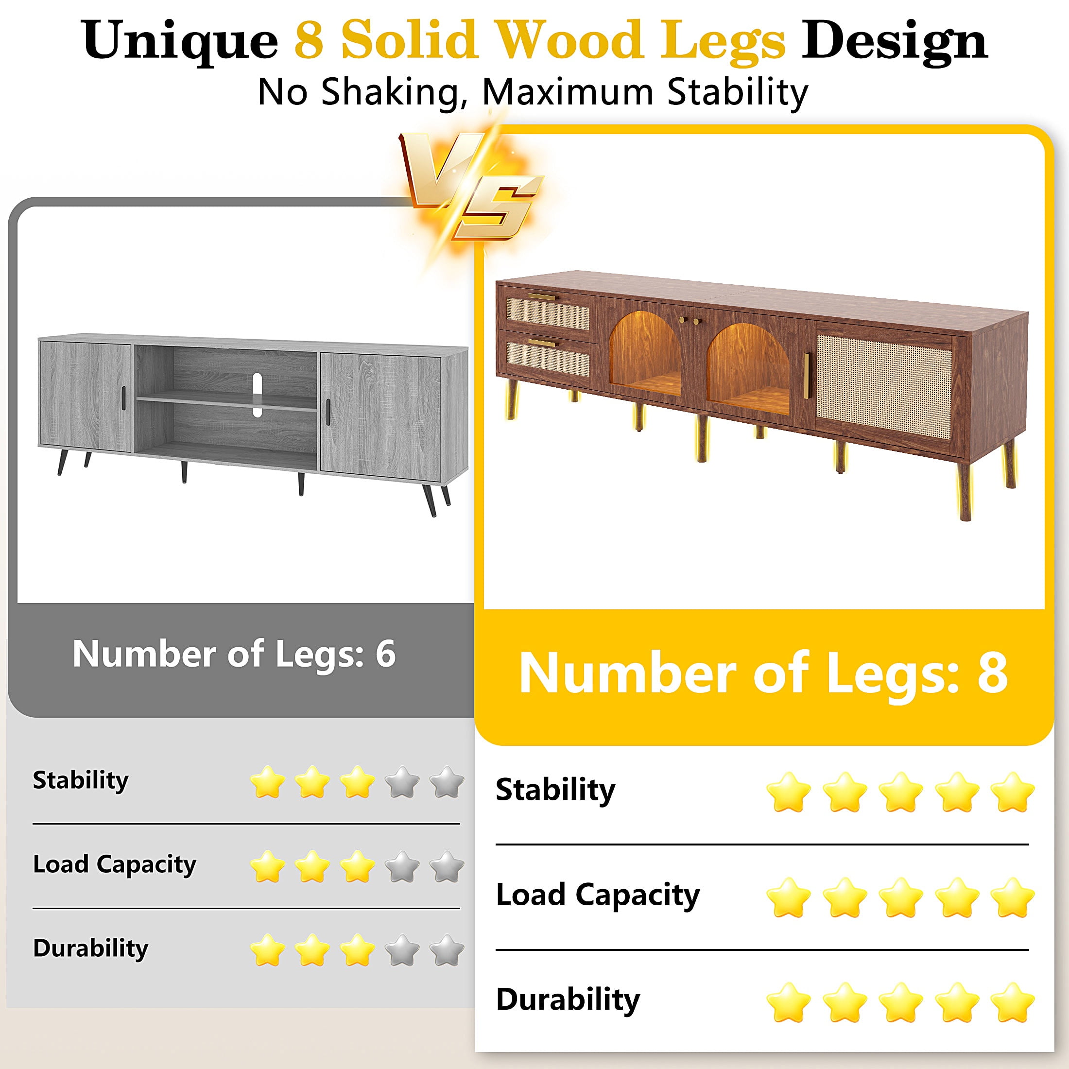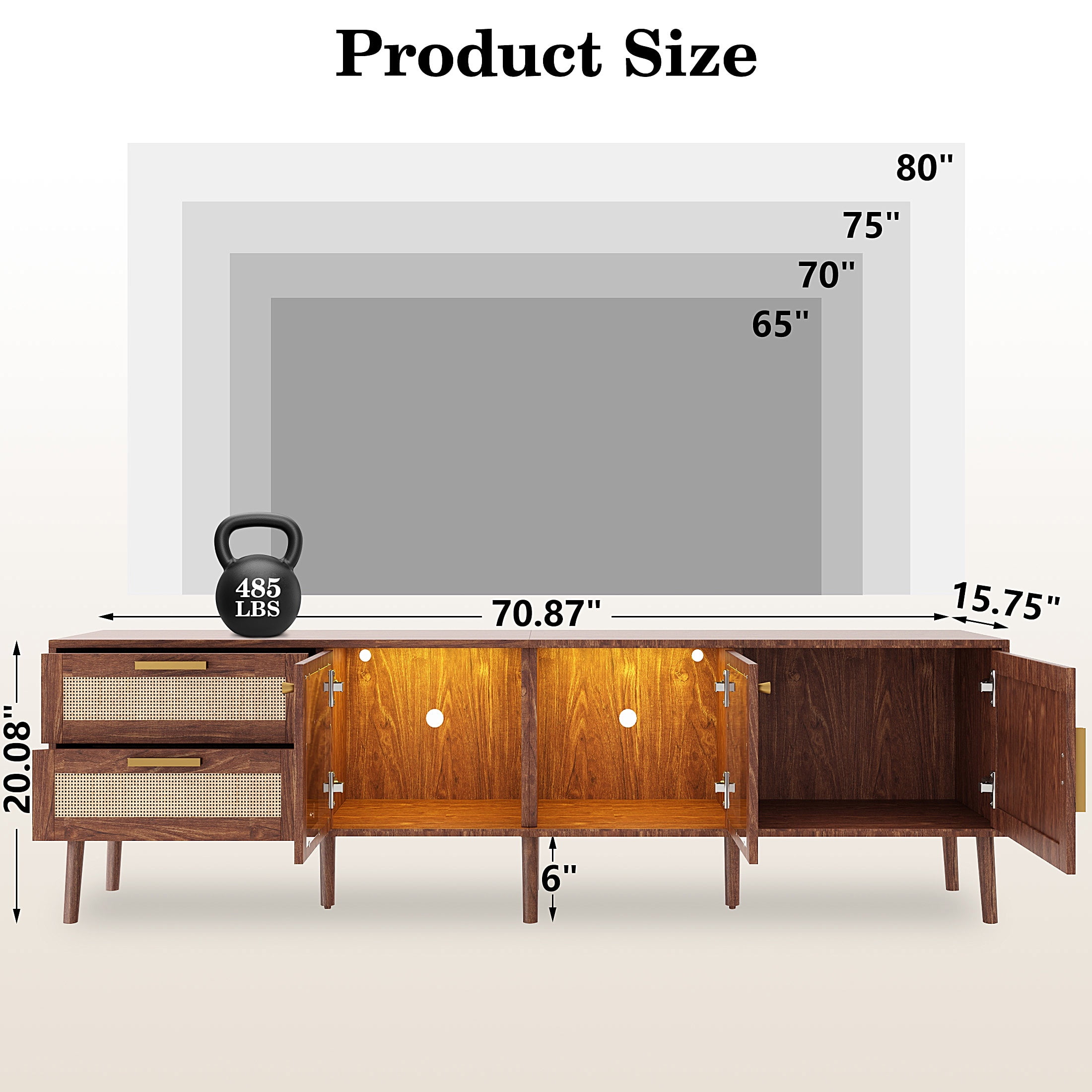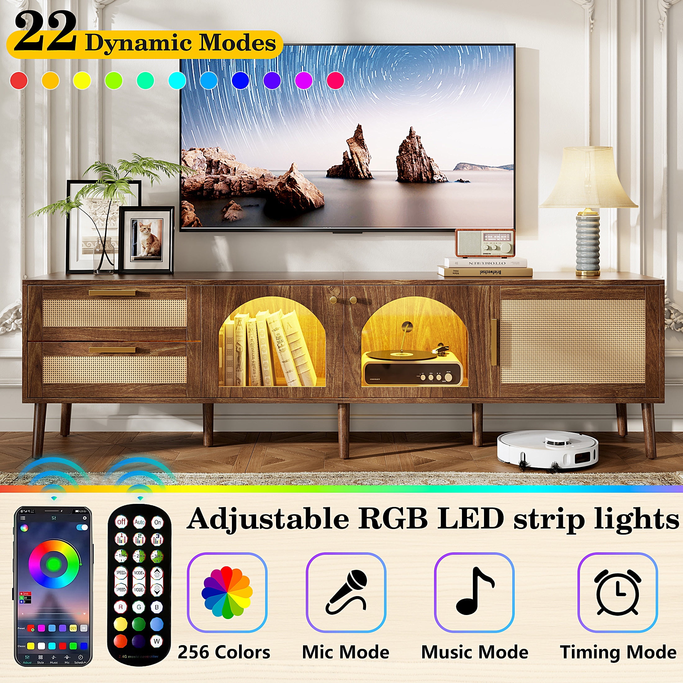 High-Gloss TV Stand for 75 Inch Screens – Designed specifically for 75-inch TVs, this high-gloss entertainment center features UV-coated scratch-resistant surfaces and a 110lb weight capacity. The modern low-profile design (19.68″H) complements flat-screen aesthetics while preventing neck strain. 16-Color LED Lighting with 4 Effects – Elevate movie nights with customizable 16-color LED backlighting (remote included). Choose from 4 modes: Romantic Ambiance/Gaming Vibes/Party Mode/Theater Dimming. Energy-efficient lights last 50,000+ hours – perfect for gaming setups or home theaters. Smart Storage & Cord Management – The TV stand includes two spacious drawers and open shelves for organizing media devices, game consoles, magazines, remote controls, and decorative items, helping you keep your living area neat and clutter-free. E1 Safe & Sturdy Construction – Certified E1 emission standard particleboard (15mm thick) + 3mm reinforced MDF back, this TV stand is designed for durability and can support up to 110 lbs, ensuring it can handle your TV and entertainment gear with ease. Easy Assembly & Customer Support – Simple assembly instructions ensure a quick setup. If you encounter any issues, our customer service team is available to provide fast and helpful solutions.