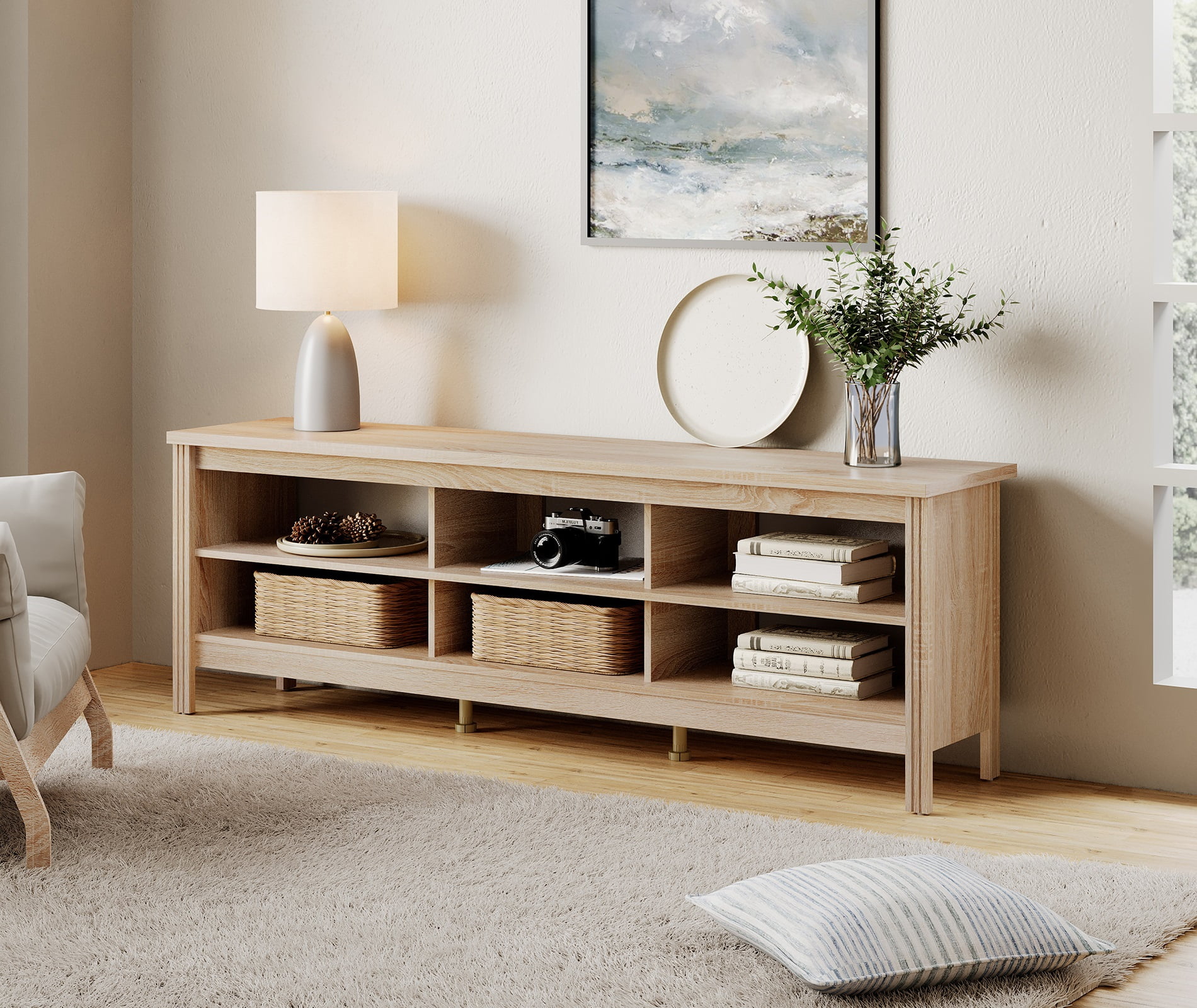 The oak wood grain and simple lines on this tv stand make it look classic and elegant. It can be not only used as televison stands, also perfect for sofa table, entertainment center, media stand, storage console table, tv console etc. This TV stand is perfect for TVs up to 75 inch TV.6 open shelves with big capacity allow you to storage the books, magazines, CDs and any other media or gaming devices. The media console table made of high quality MDF which is durable and sturdy enough to be used for a long time. Plus, four wooden legs further enhance stability, preventing the TV stand from wobbling. Max load capacity: 260 lbs. The oak entertainmen center for 75 inch tv with smooth surface is waterproof and easy to keep clean with a damp cloth. The tv table is 3.9 in high height off the ground which adequate for robot vacuum cleaner can passing freely. No more headaches from dust under the cabinet.