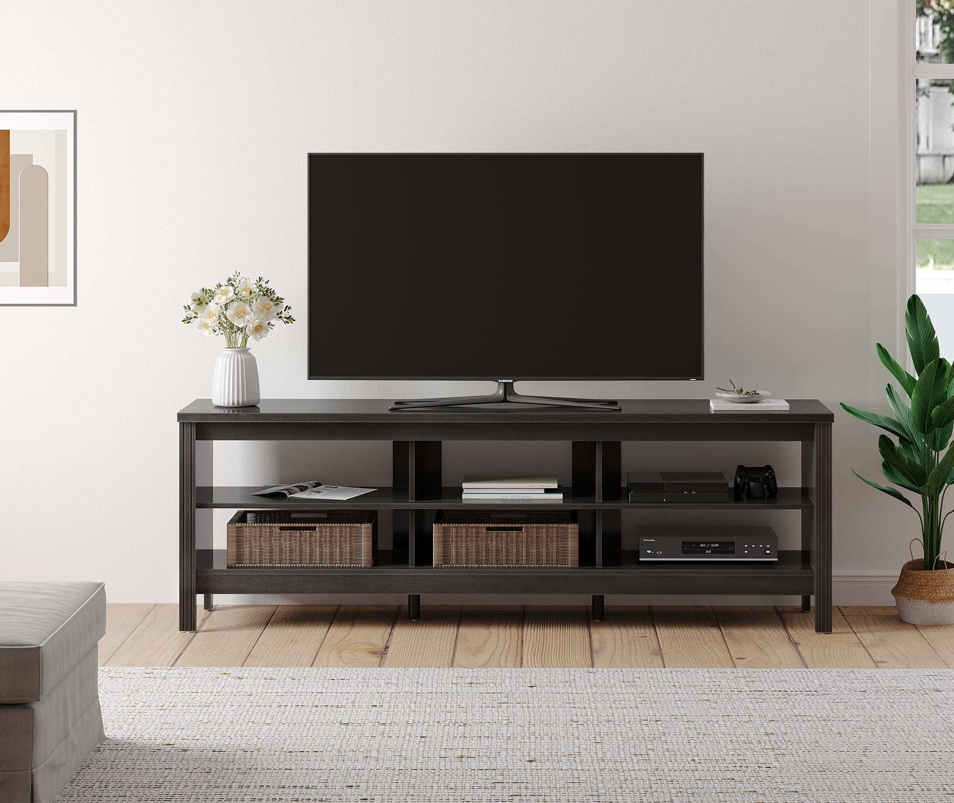 Display your TV in style with this 70-inch TV stand. Crafted from high-grade MDF for a rich, textured surface, this storage console features two open shelves on both sides for anything from your electronics to your home decor. This entertainment center mixes a traditional style with the on-trend rustic farmhouse look with its simple design and will be a classic piece to your living room. This media stand will accommodate most flat-panel TVs up to 75 inches.