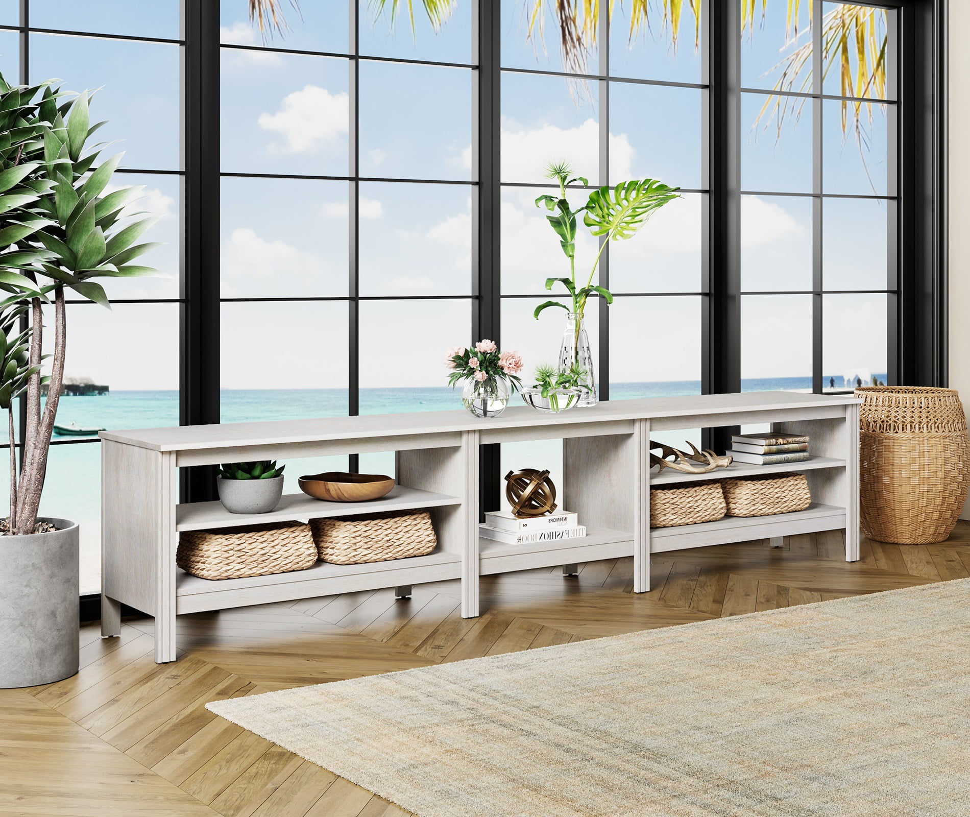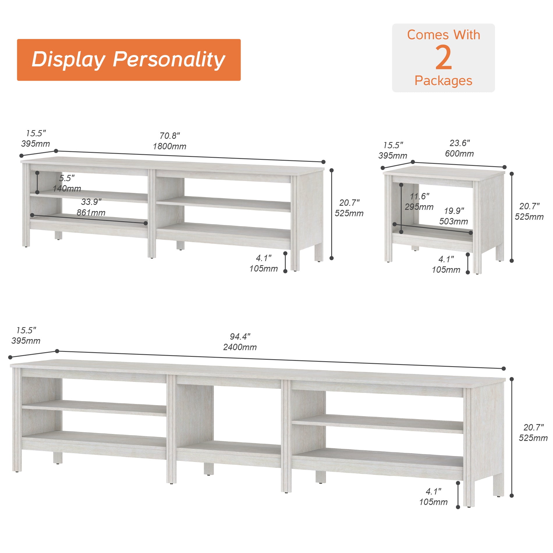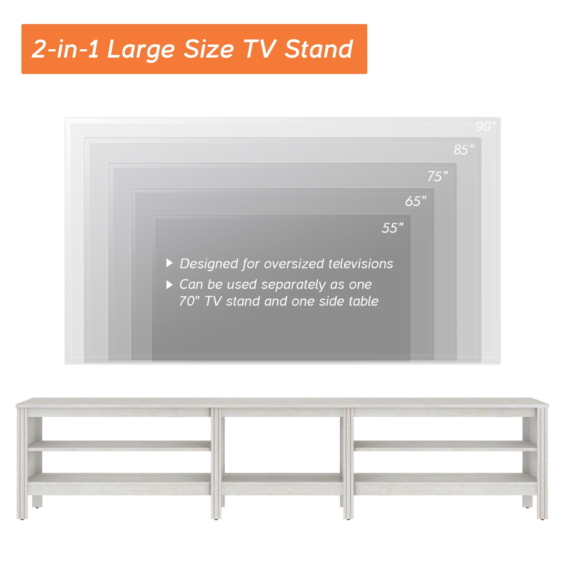 Note:This TV cabinet is sent in two packages,so you may receive them at different times.Designed with wide tabletop and 6 Storages to meet your storage requirements.Fits most 75 80 85 90 95 100 Inch TV screens.And it also can be used separately as 1 TV console which fit for 75 inch TV and 1end table .Dimensions: 94.5″ L x 15.6” W x 23.6” H. Weight limit of top board is 270 lbs.Note:This TV cabinet is sent in two packages,so you may receive them at different times.Designed with wide tabletop and 6 Storages to meet your storage requirements.Fits most 75 80 85 90 95 100 Inch TV screens.And it also can be used separately as 1 TV console which fit for 75 inch TV and 1end table .Dimensions: 94.5″ L x 15.6” W x 23.6” H. Weight limit of top board is 270 lbs.