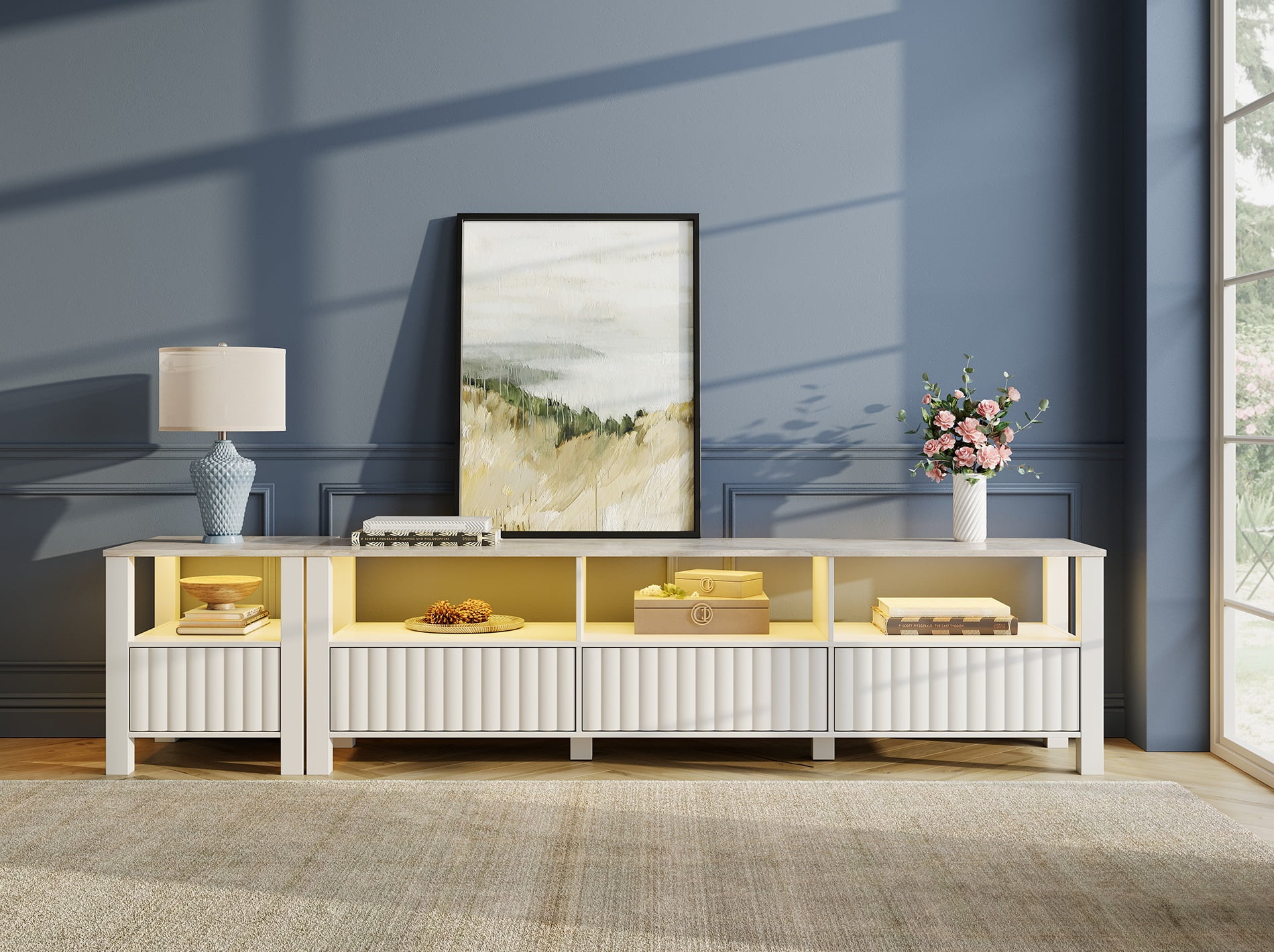 【LED TV Stand】Featuring custom stone pattern tabletop and handmade fluted wood door, the elegant tv cabinet will be the most eye-catching piece of furniture in the room. Coming with a warm white LED light strip will create amazing lighting effect and warm atmosphere to your room. 【2-In-1 Large TV Stand】The tv stand can be used together as a large tv stand for 85+ inch tv. And it also can be used separately as one 70 inch tv stand and one small side table suitable for living room, bedroom, lounge, office and many other places.Overall Dimension: 87.6”×15.6”×19.7”(L×W×H) 【Ample 8 storage Space】Designed with 4 open shelves and 4 storage cabinets offer ample storage space to you. And the cabinet door is equipped with hydraulic door closer for smoother and quieter user experience. 【Premium Material】Made of high quality P2 MDF material without any smell and no harm to human body, the tv console provides a long service life. Four thickened legs and two extra legs in the middle ensure overall stability and durability.Weight Capacity of TV Stand: 280 lbs. Weight Capacity of Side Table: 70 lbs. 【2 Packages & One-Year Warranty 】This TV table is sent in two packages, so you may receive them at different times. With detailed instruction, the tv console is easy to assemble.