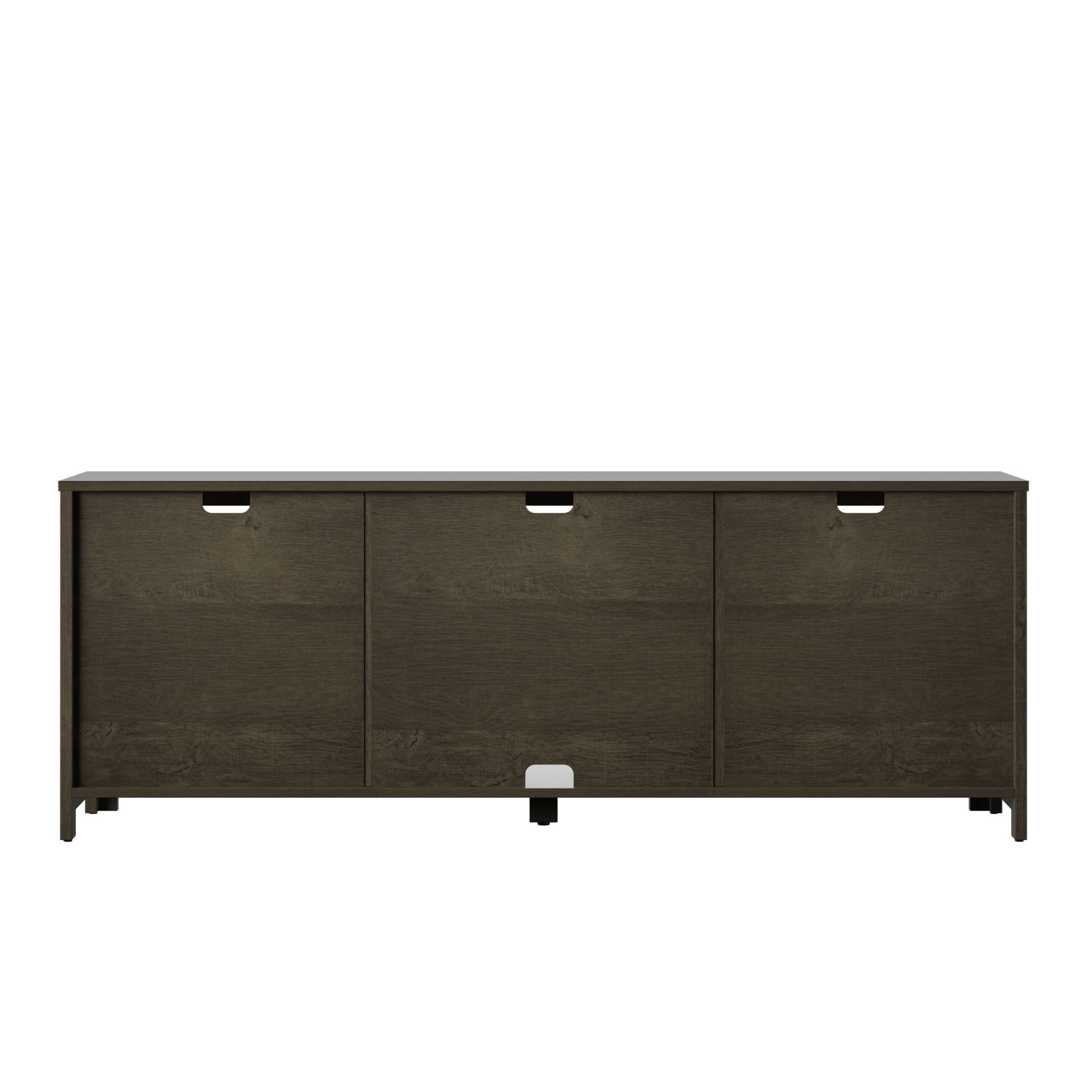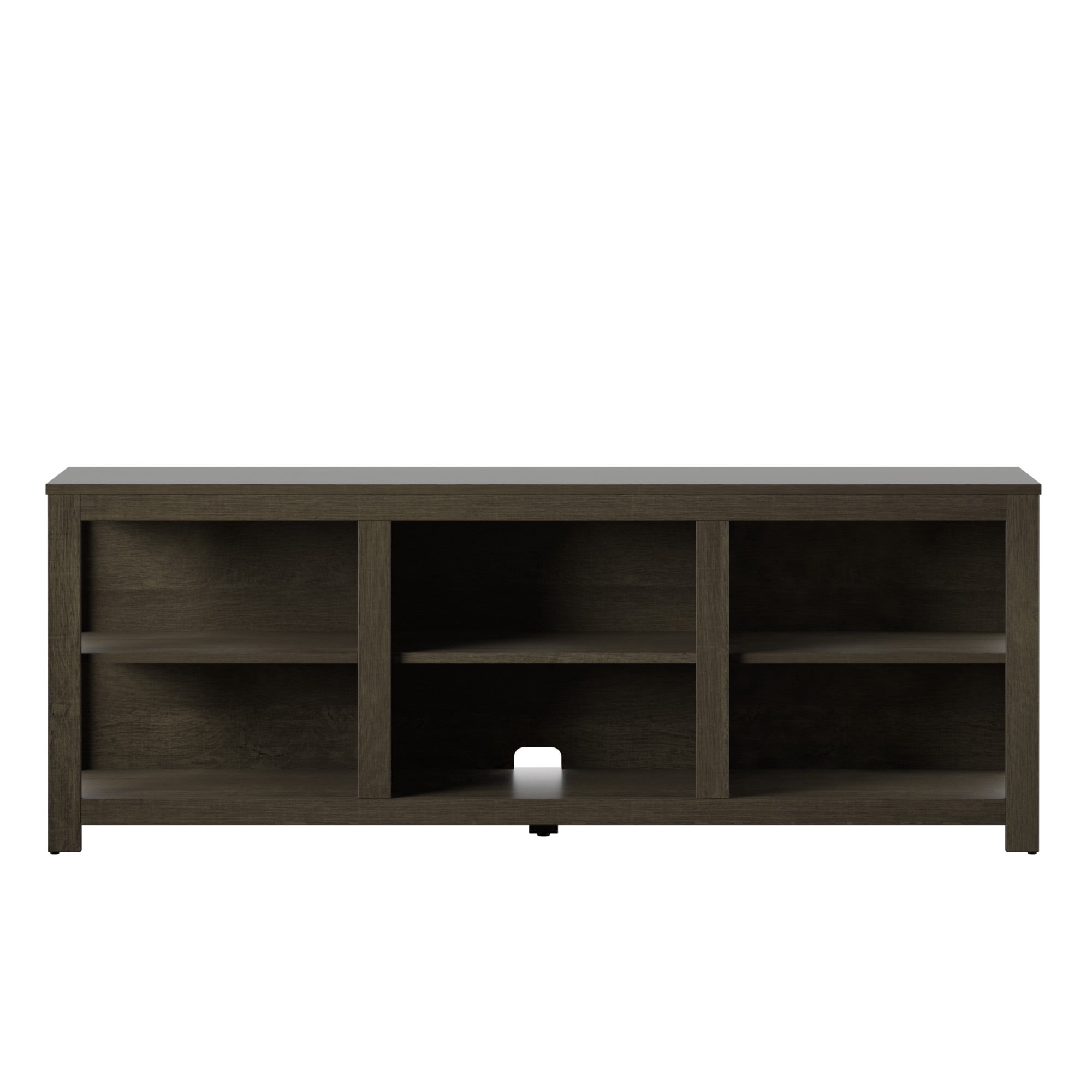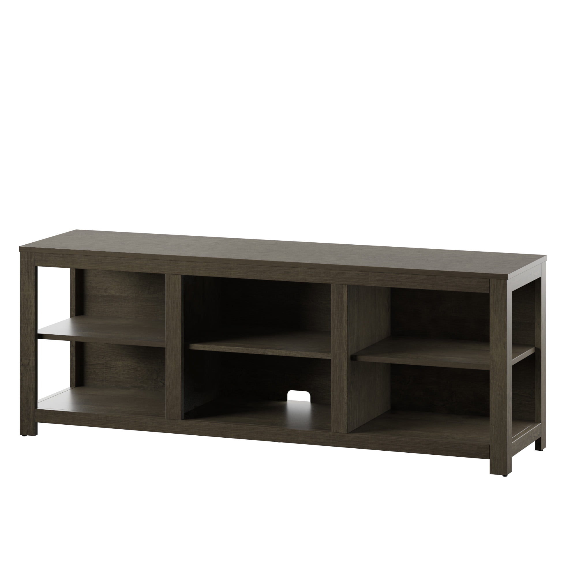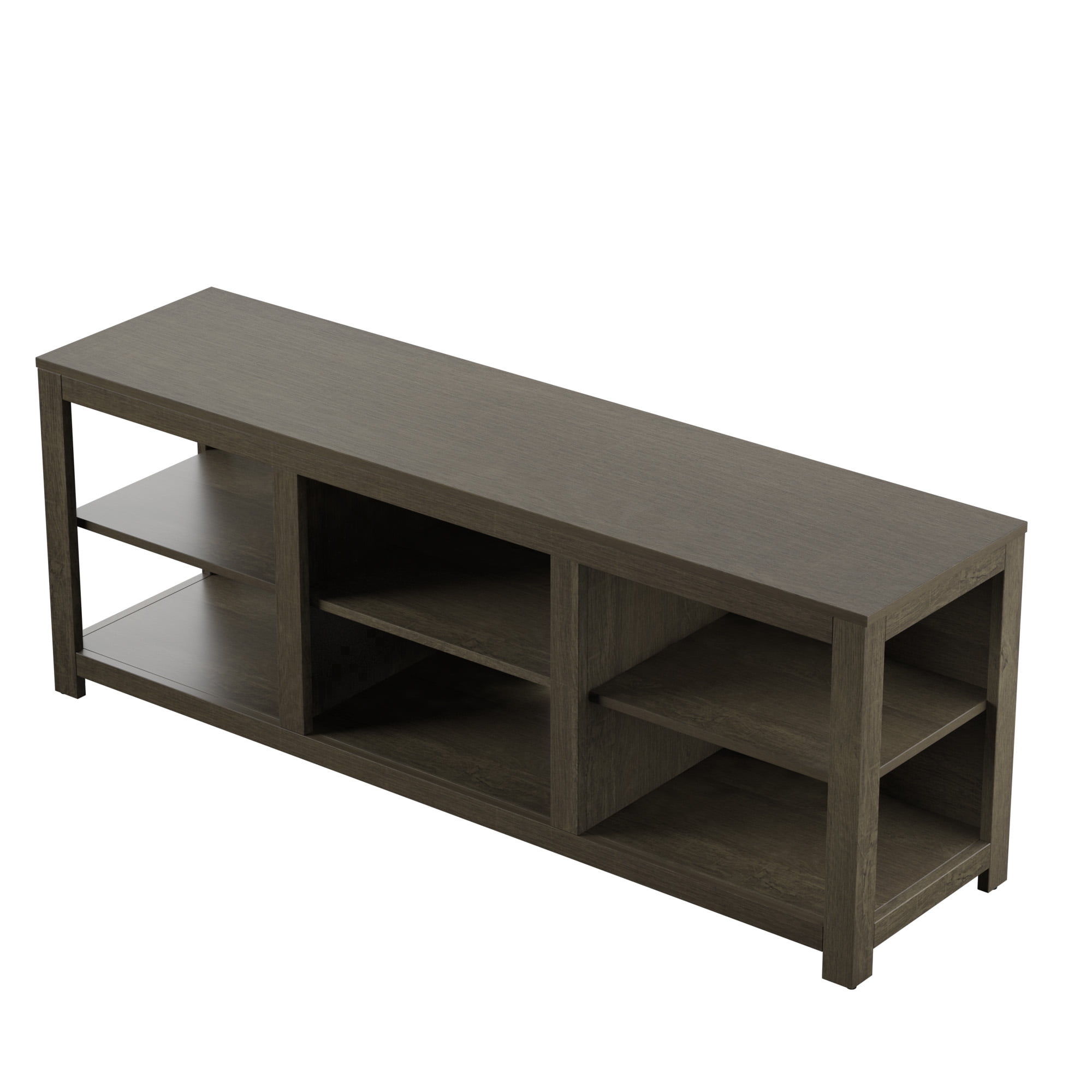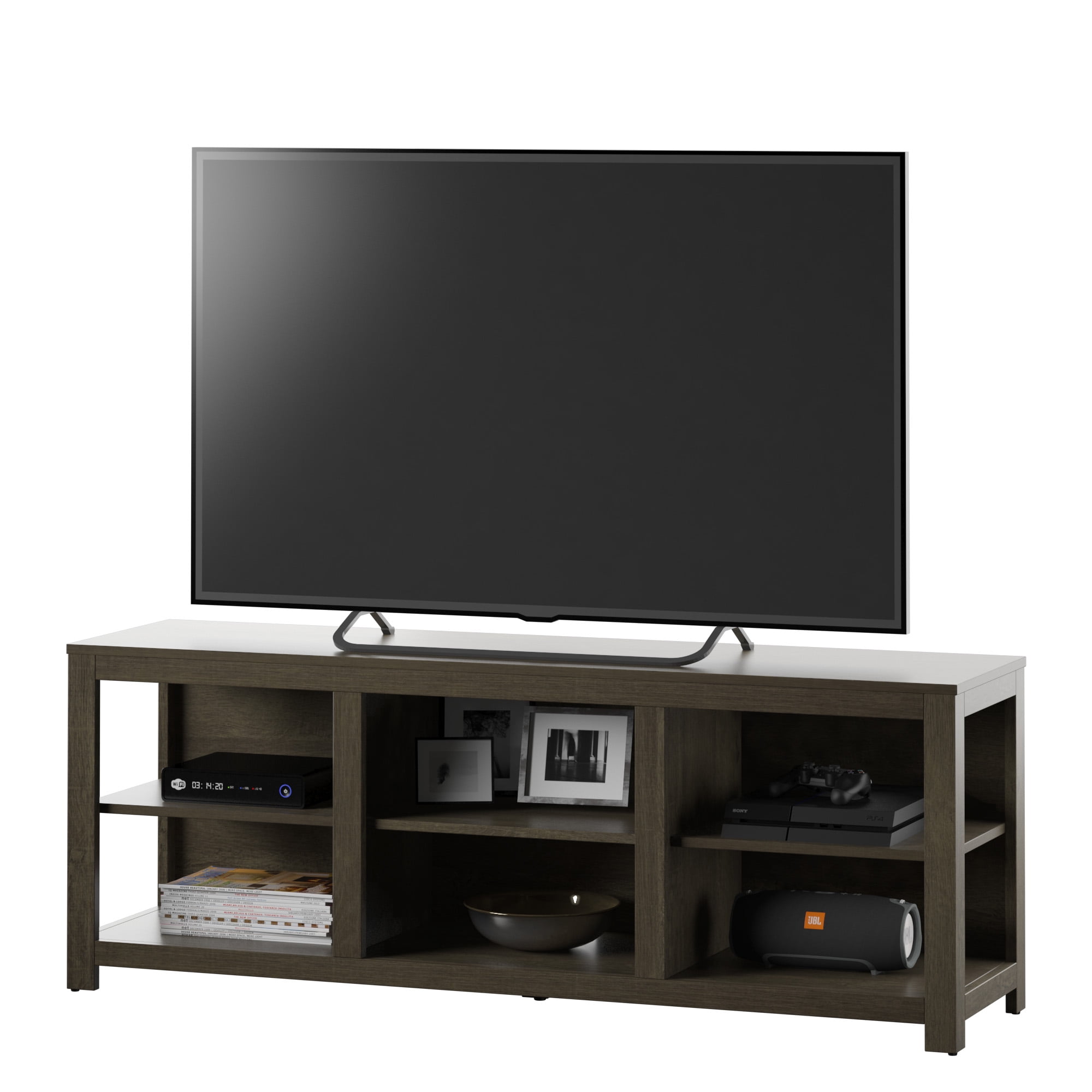 This TV stand holds most TVs up to 65 inches and 60 pounds and offers plenty of storage for your living. Open shelves with one adjustable shelf on each side give you the opportunity to showcase family photos, display your favorite home accents, or store all of your electronic components for entertainment. Back panel cutouts route cables neatly behind the stand to avoid tangles.