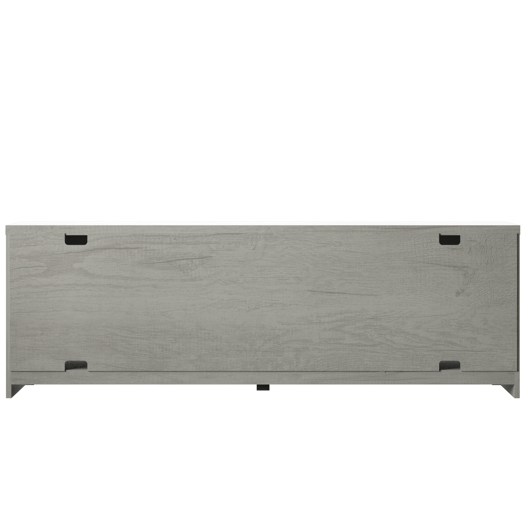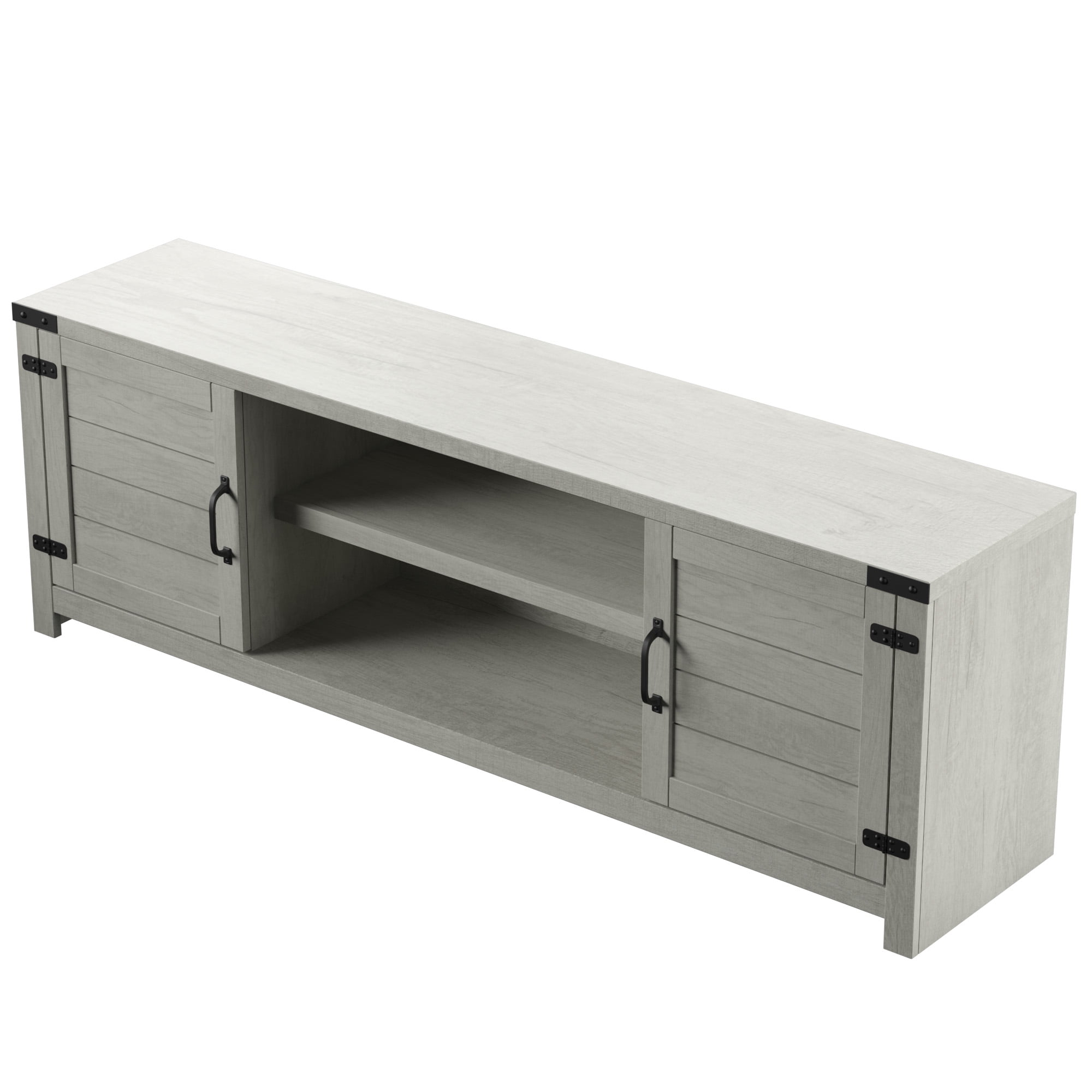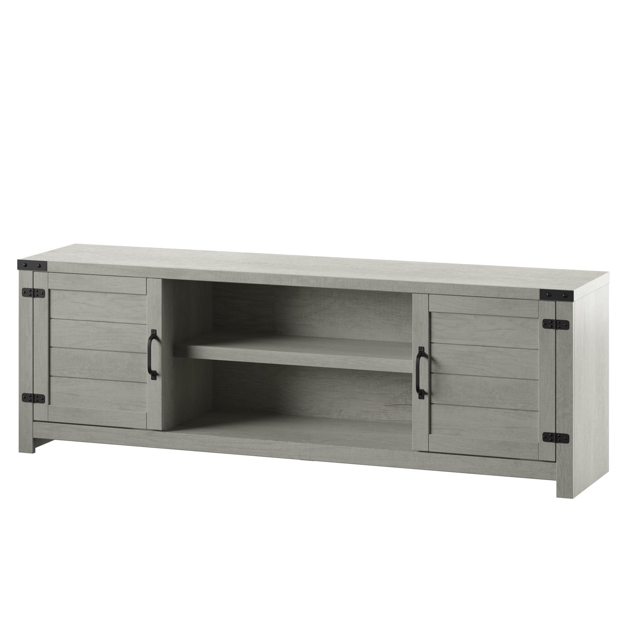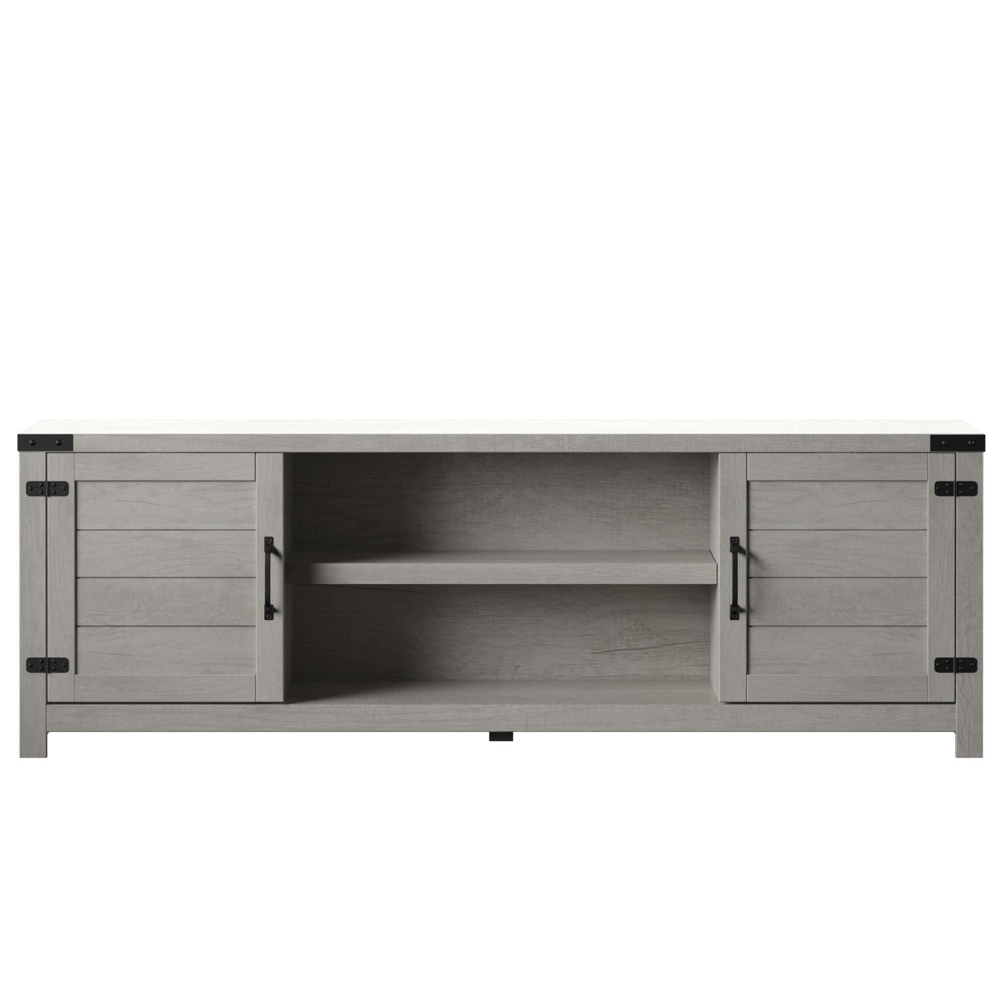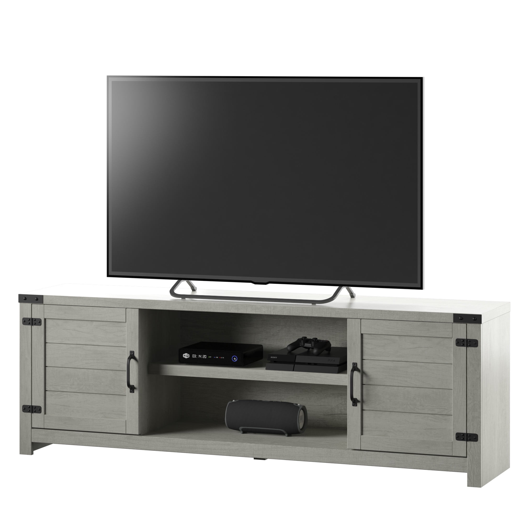 Accommodates most flat-screen TVs up to 80″ and 90 lb. Two side cabinets with one adjustable shelf within each One adjustable center shelf provides customizable open storage Cabinet doors feature a plank design and accent hinges for a chic modern farmhouse style Pass-through cutouts on the back panel provide cord management and allow easy component storage Magnet latches offer a soft, secure close for cabinet doors Tip-restraint hardware included