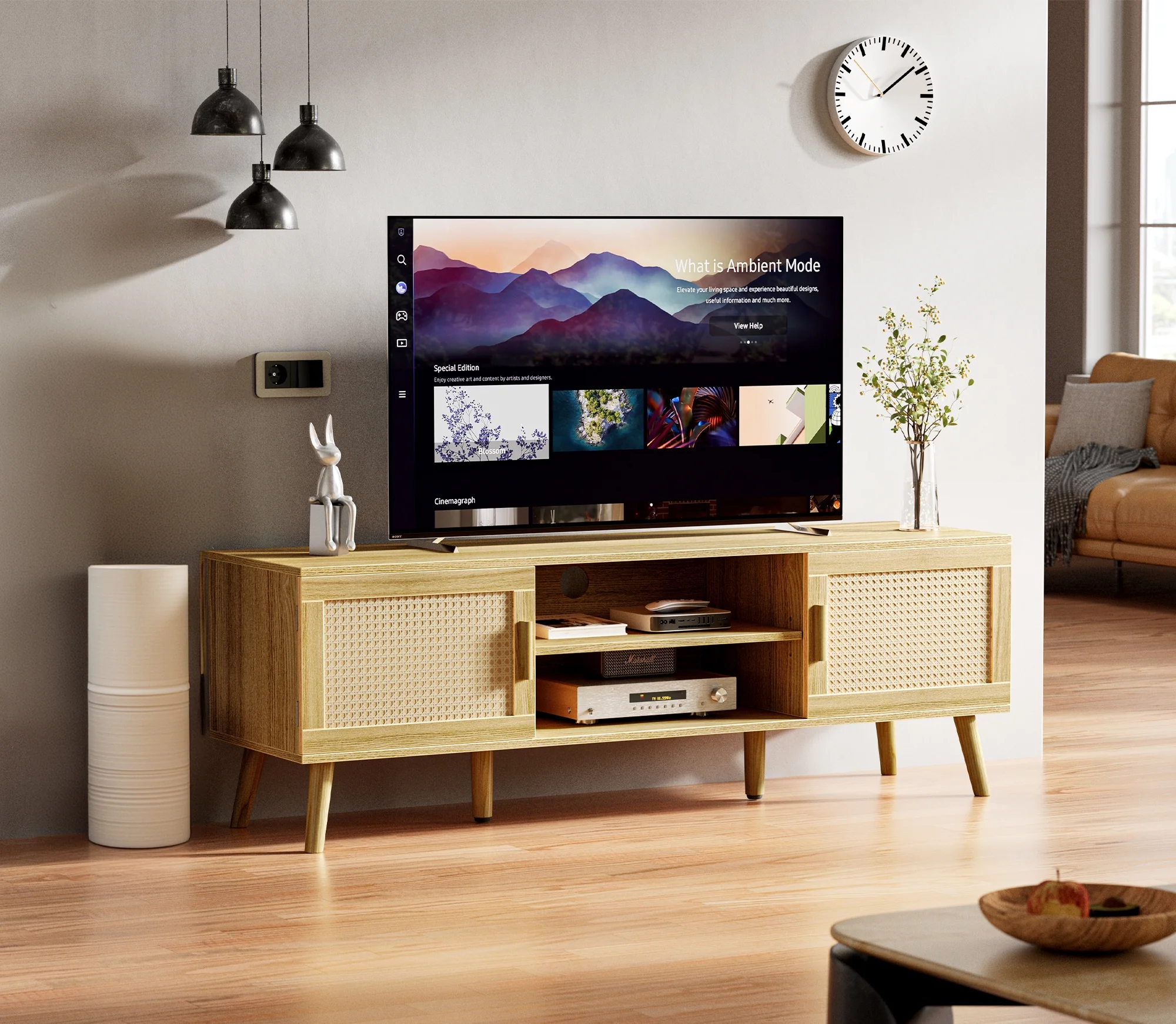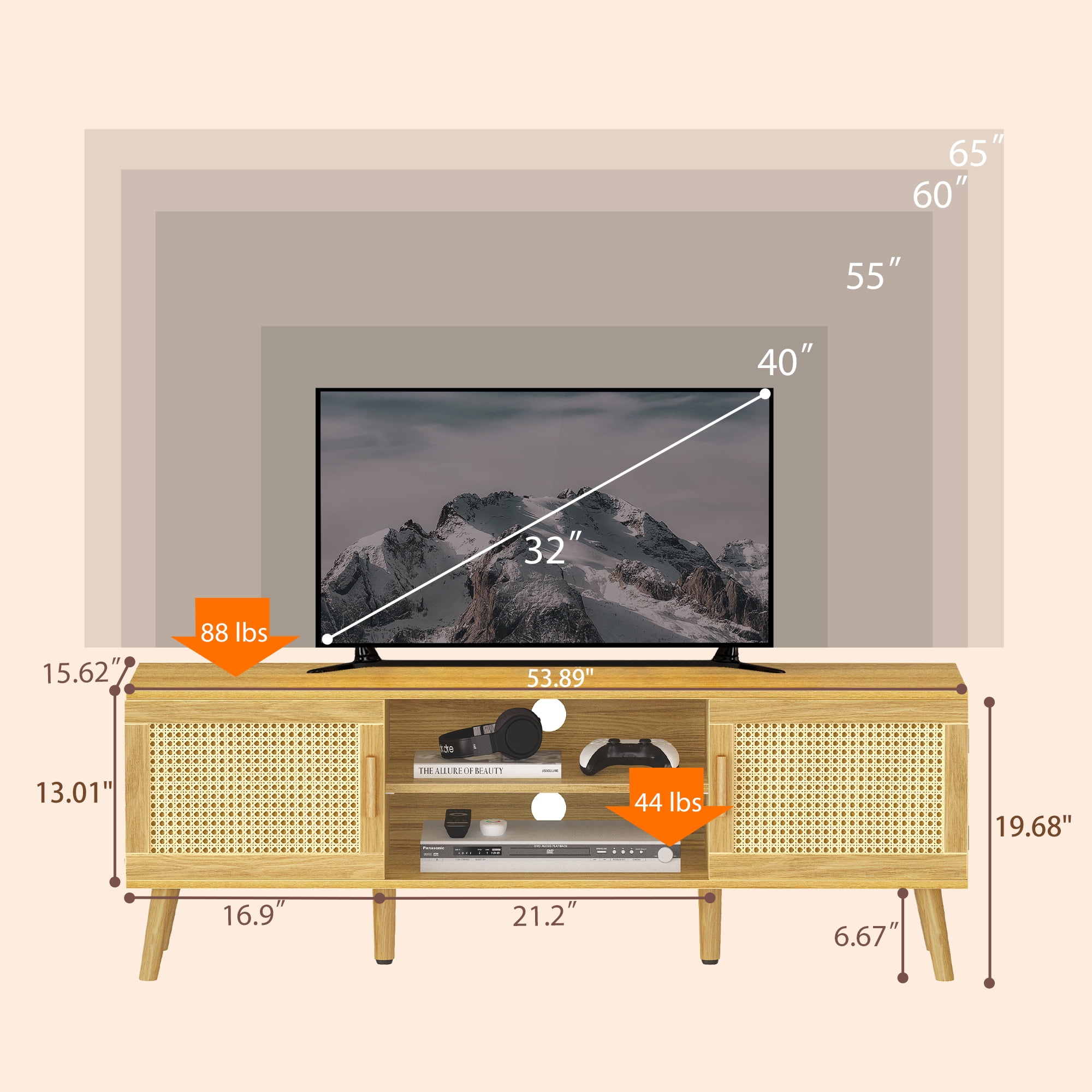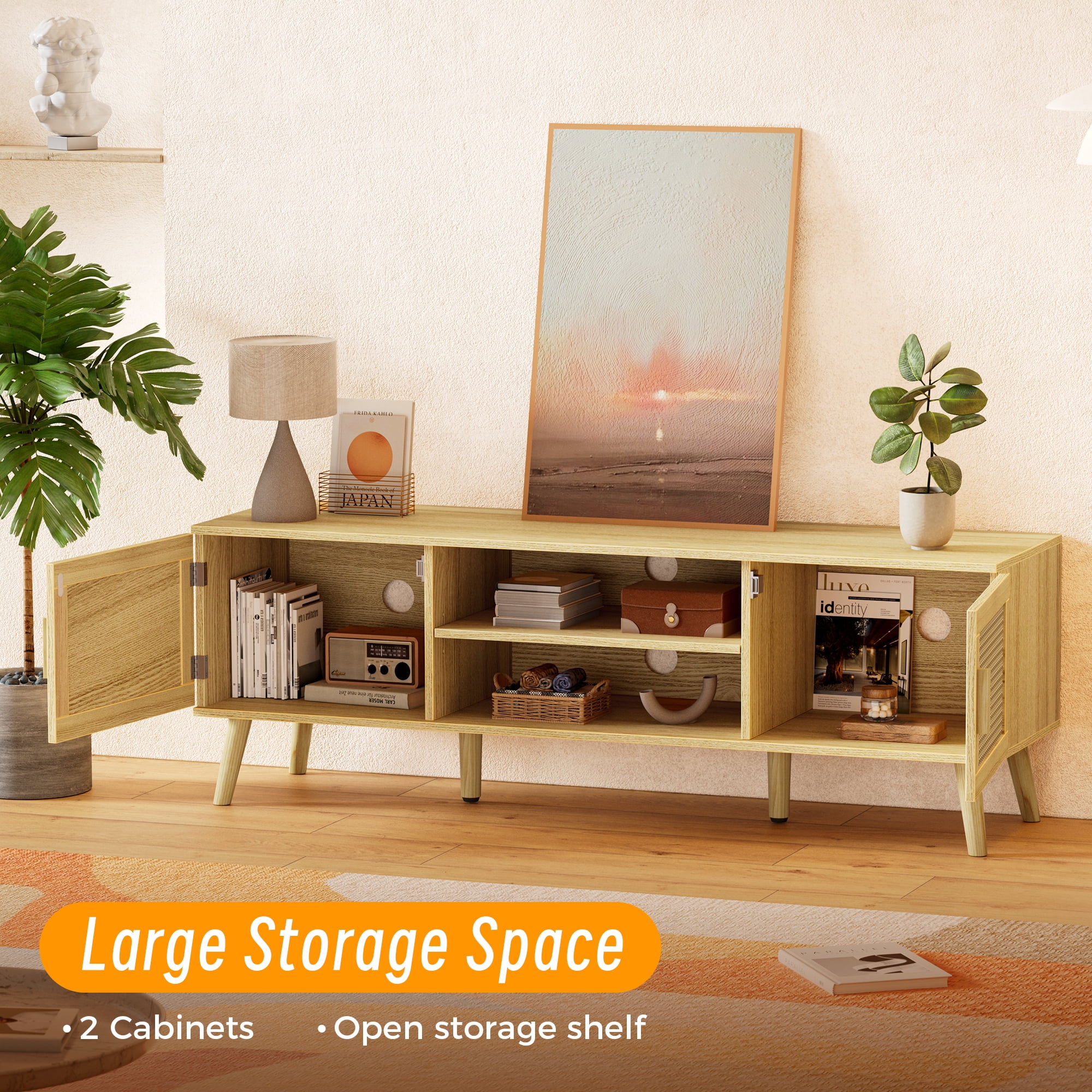 TV Stand Modern TV Console for TVs up to 60″, Media Console Table Entertainment Center with PE Rattan and Open Shelf, for Bedroom Living Room