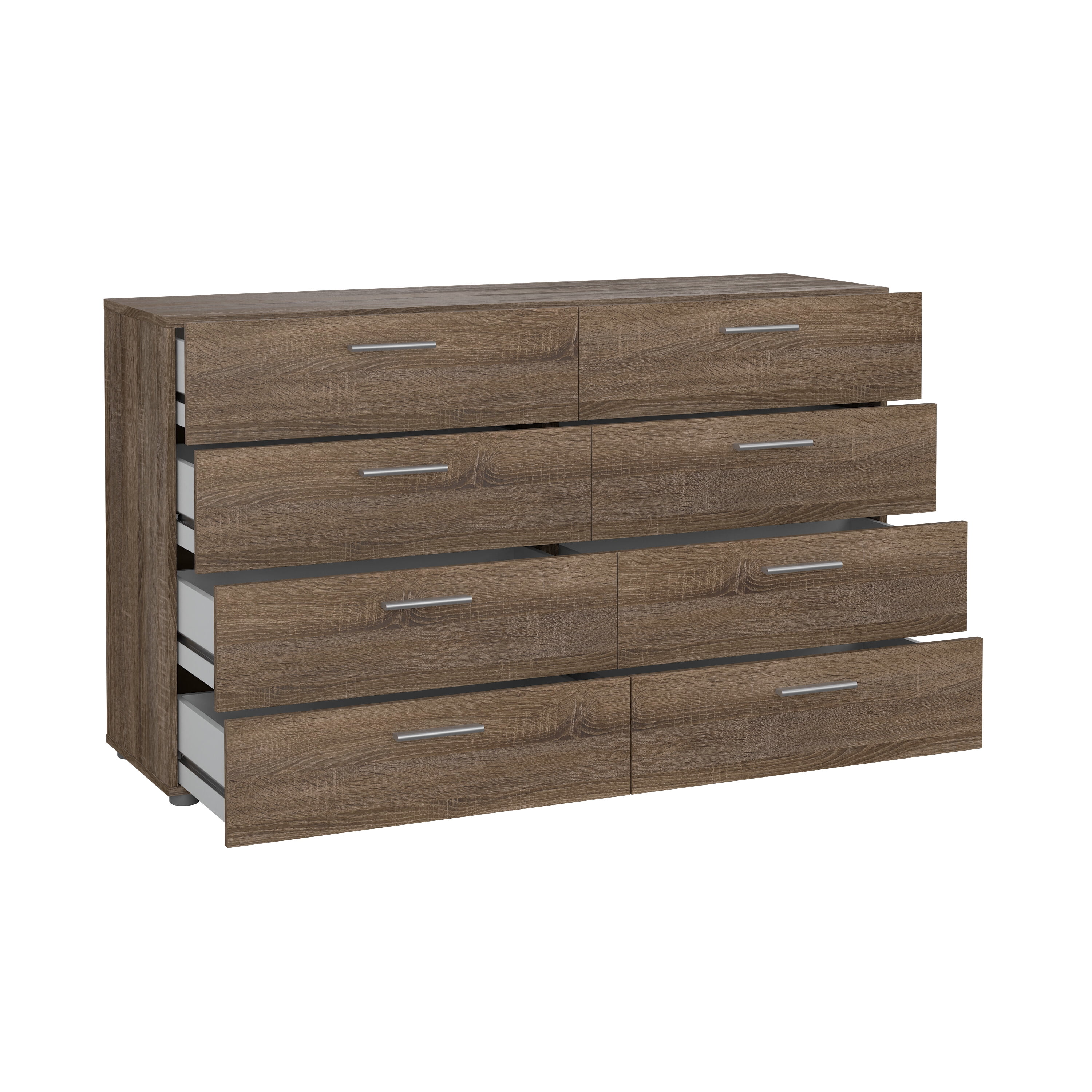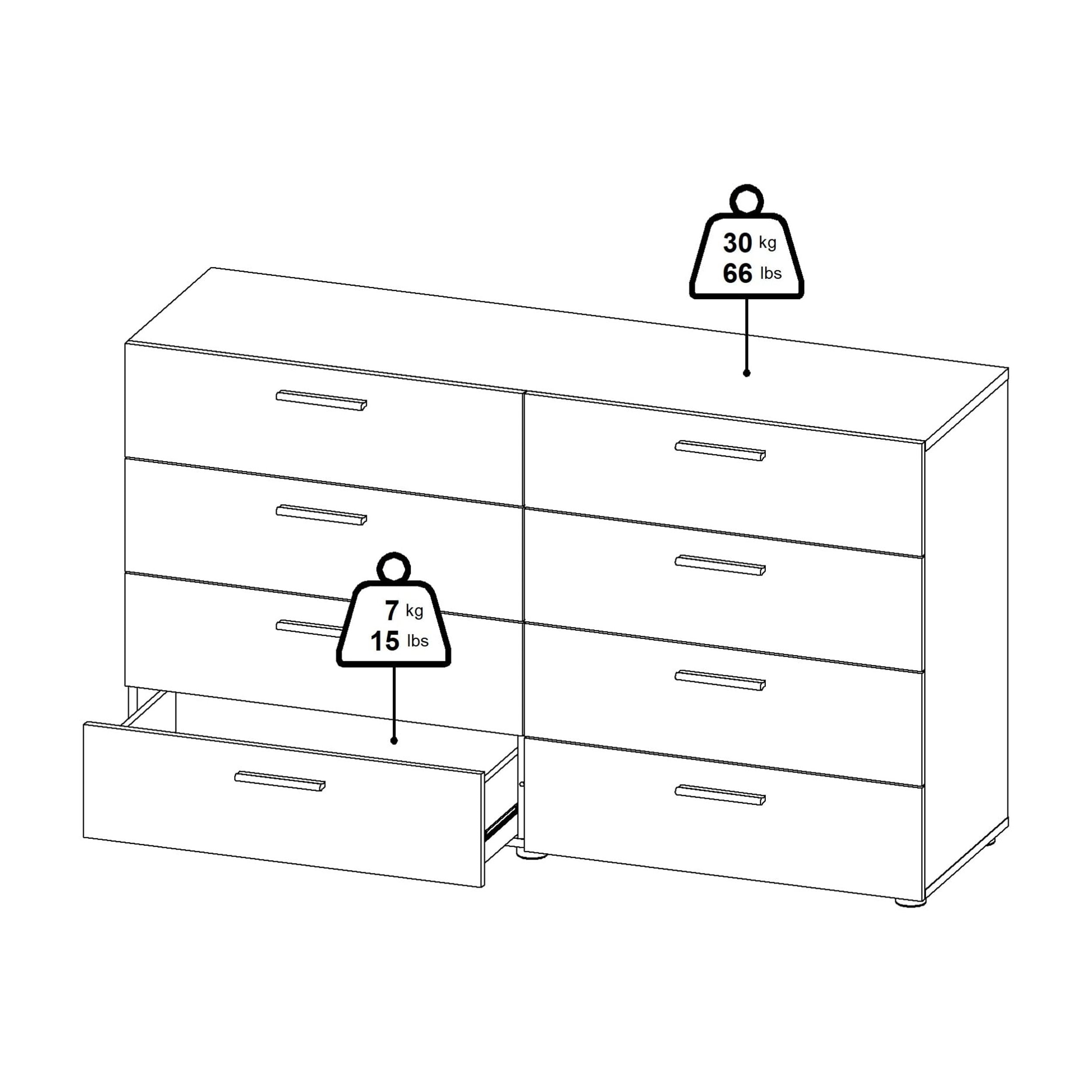 Suitable for small rooms Dimensions: 55.12W x 15.75D x 32.17H inches Euro modern dresser made in Denmark Modern plastic silver color bar handles and plastic feet Eight large drawers for multi-purpose storage Drawers retract smoothly on metal glides Features easy-to-clean foil surface 3D Interactive assembly through BILT: Instructions for this product are available through the free BILT app. Find a revolutionary way to assemble & install product with voice, text, & interactive animated images Age Group: Adult Product is shipped in 2 boxes Suggested number of people for assembly is 2 Includes assembly manual and all necessary hardware and fasteners. Components are pre-drilled and pre-cut ready for easy assembly. FSC Certified Sustainable engineered wood construction