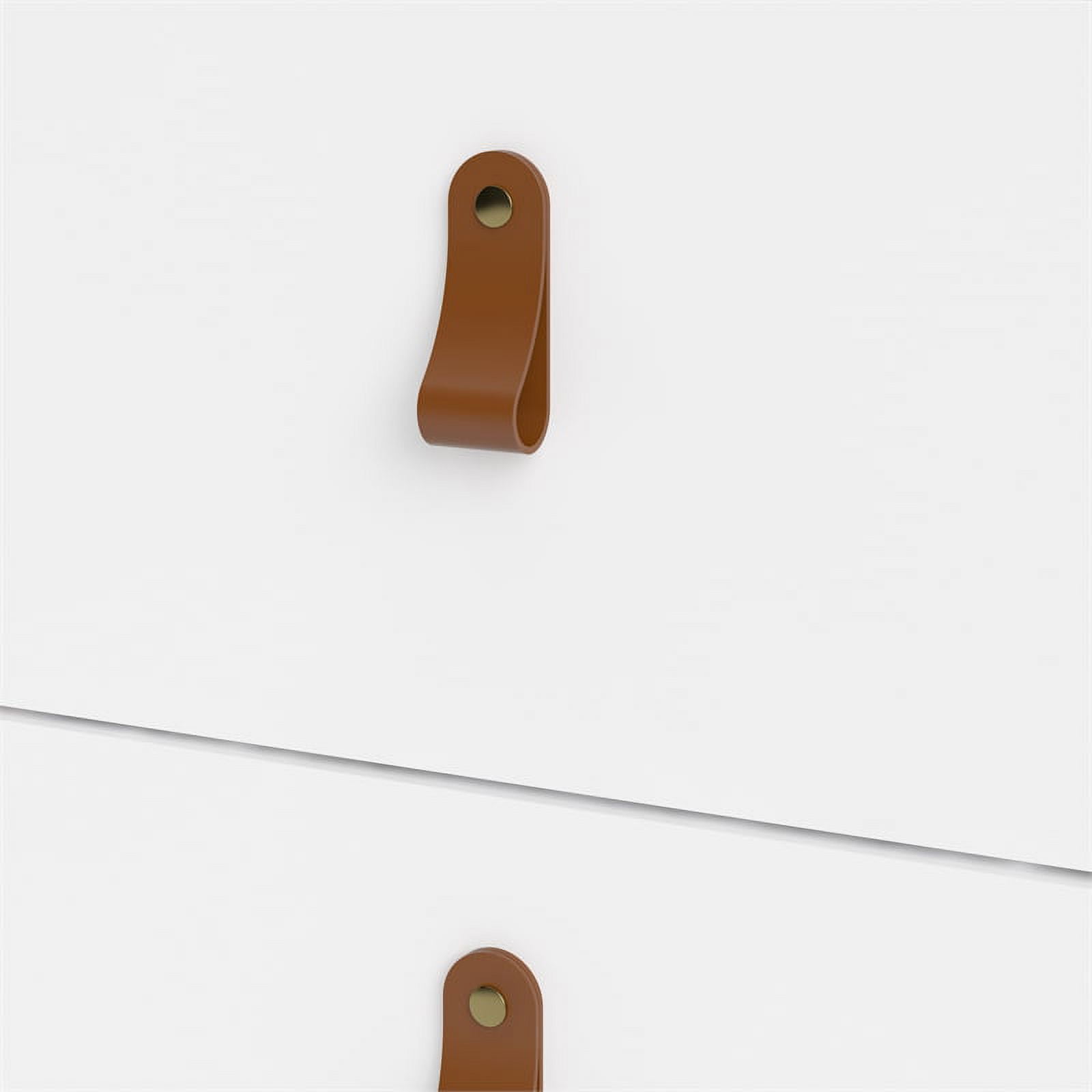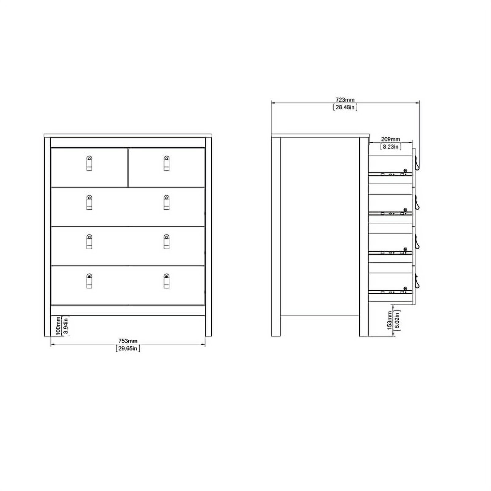 Dimensions: 32.40W x 18.90D x 38.94H inches Modern-Traditional Style Two small top drawers and three large bottom drawers provide ample storage Steel brackets add support to bottom of the large drawers Comes with two types of handles: grey knobs and brown leather handles Drawers retract smoothly on metal glides with built-in safety stops Suitable for small rooms Product is shipped in 2 boxes Made from engineered wood Made in Denmark Scandinavian look and design Assembly Required-Includes assembly manual and all necessary hardware and fasteners. Components are pre-drilled and pre-cut ready for easy assembly Suggested number of people for assembly is 2 Age Group: Adults