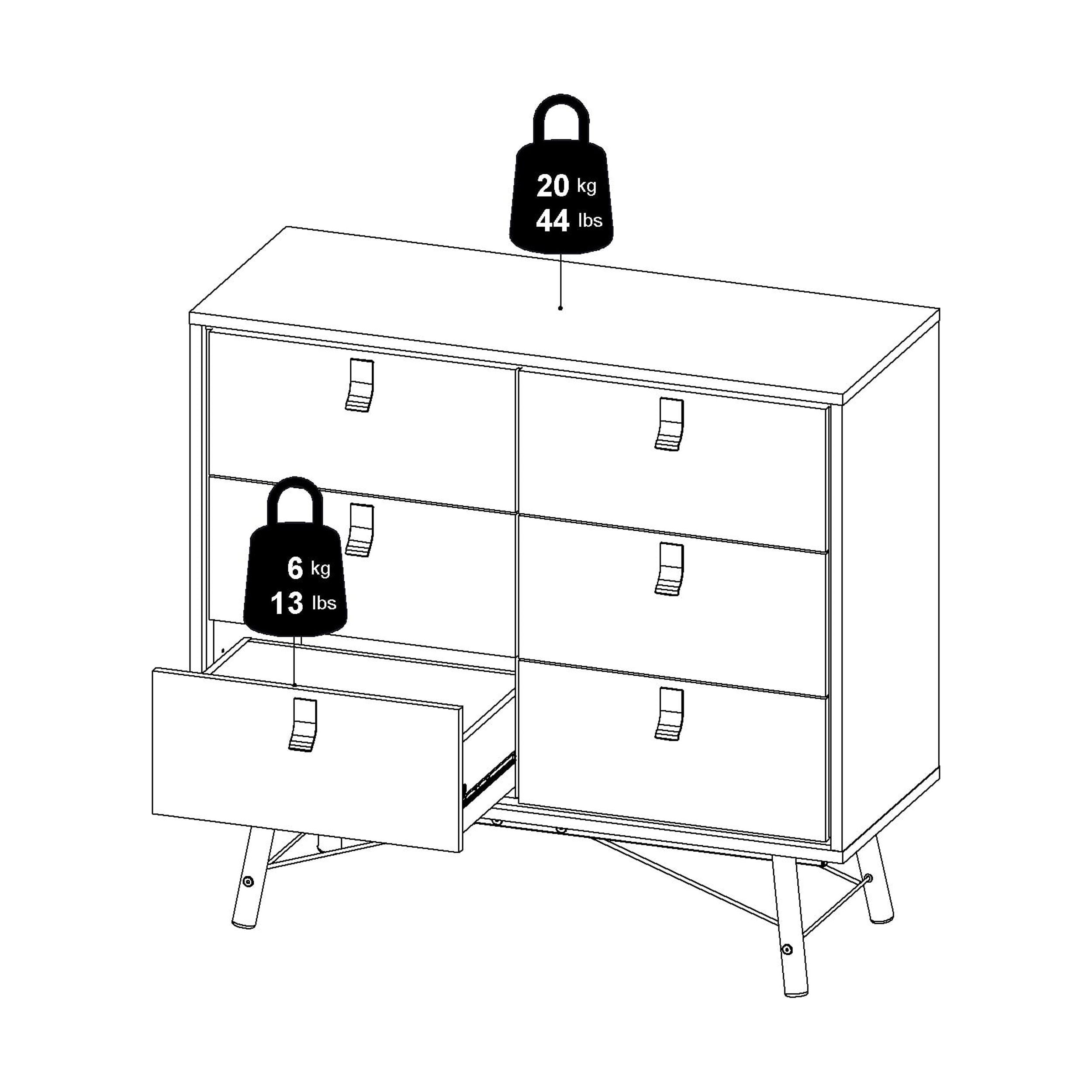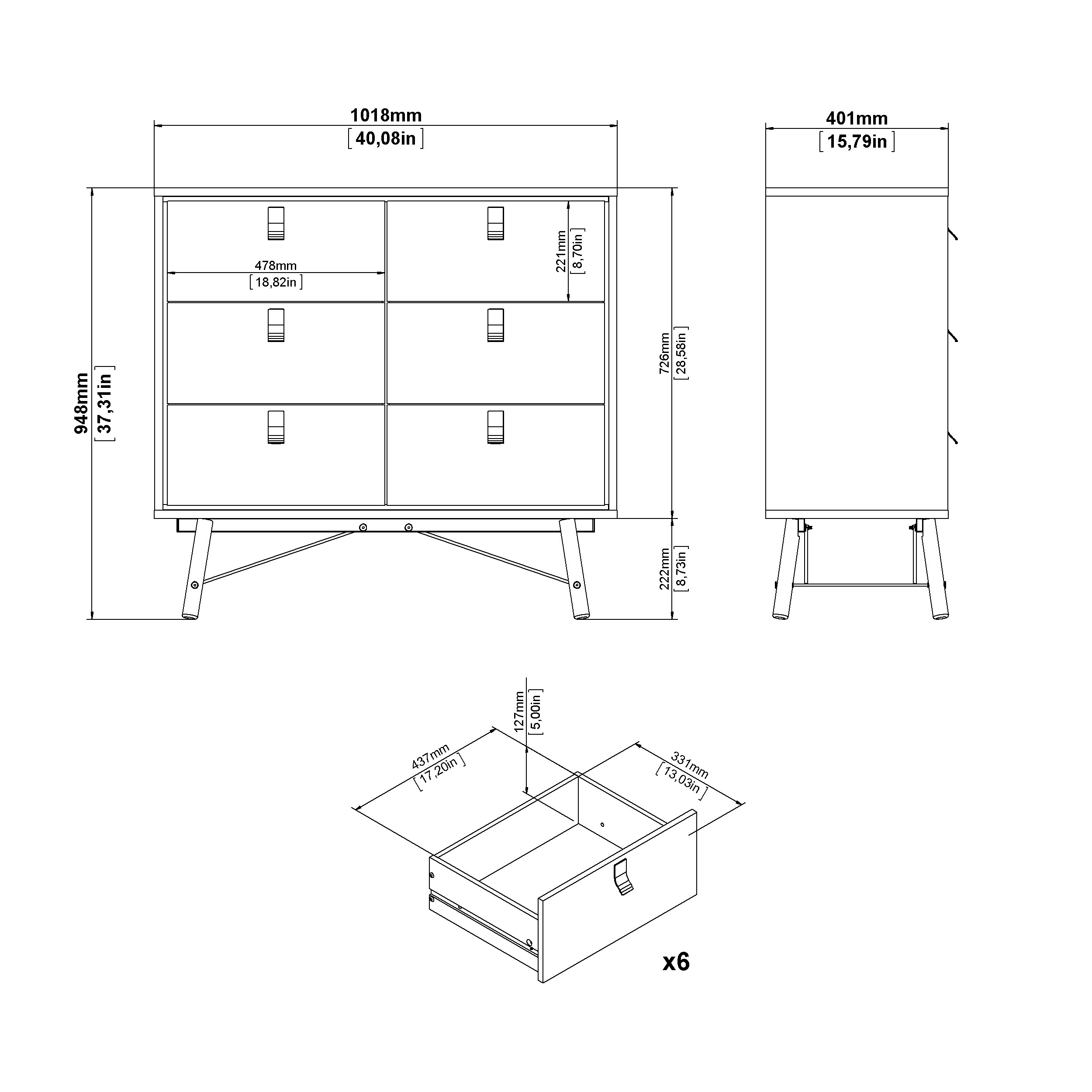 Dimensions: 40.08W x 15.79D x 37.32H in. Contemporary style Two-tone finish combination Six drawers for storage Drawers retract smoothly on metal glides Solid wood legs, Black metal handles Product is shipped in 2 boxes Made from engineered wood Made in Denmark Scandinavian look and design Assembly Required-Includes assembly manual and all necessary hardware and fasteners. Components are pre-drilled and pre-cut ready for easy assembly Suggested number of people for assembly is 2 Age Group: Adults