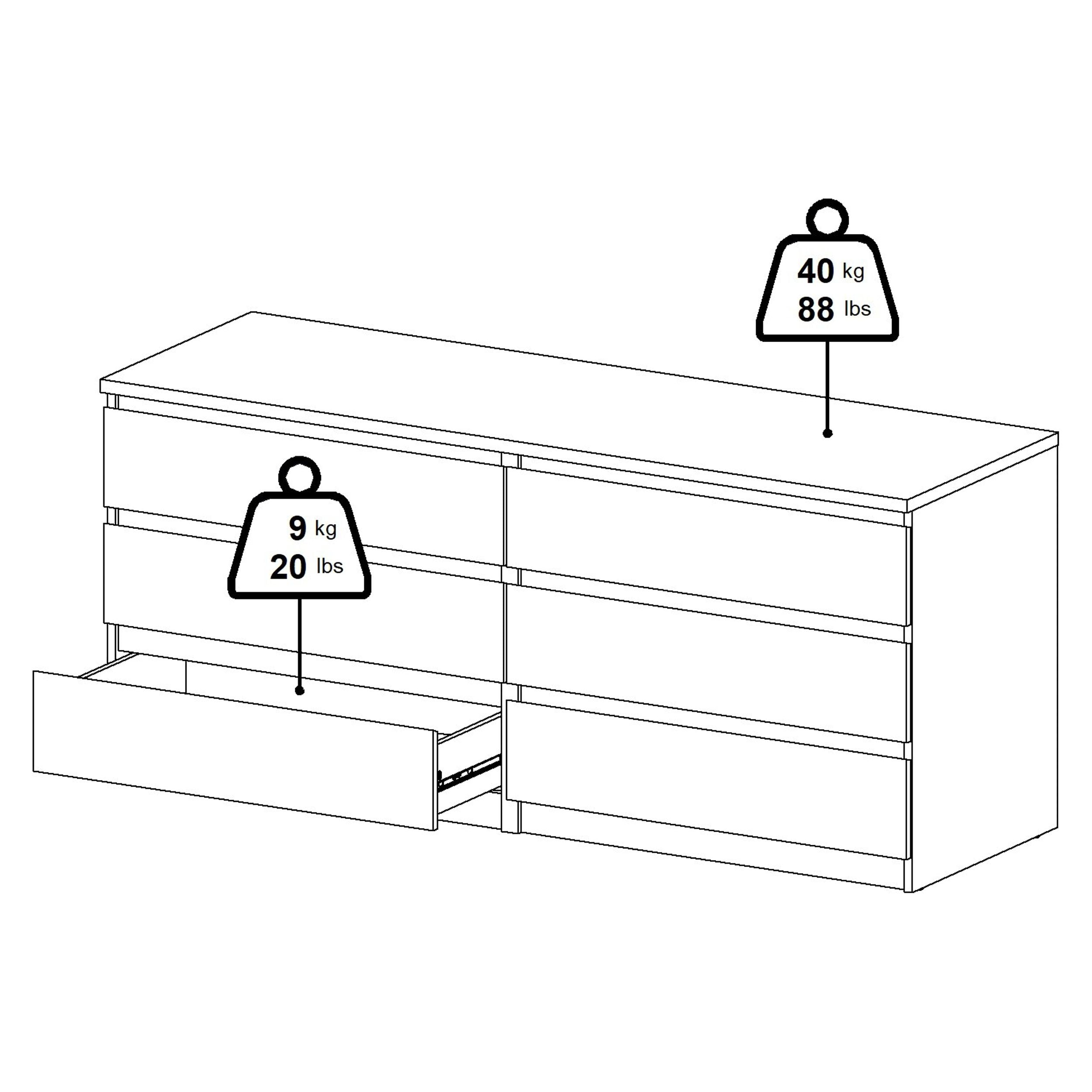 Includes: One (1) dresser Six (6) drawers retract smoothly on metal glides with built-in safety stops Extra high drawer sides with good extensions to ensure spaciousness and functionality Handle-free drawers 3D Interactive assembly through BILT: Instructions for this product are available through the free BILT app. Find a revolutionary way to assemble & install product with voice, text, & interactive animated images Paper foil laminate finish Assembly Required Made from engineered wood Includes assembly manual and all necessary hardware and fasteners Components are pre-drilled and pre-cut ready for easy assembly Product is shipped in 2 boxes Scandinavian look and design Assembly Required : Yes Frame Material : Wood Material : Engineered Wood Target Audience : Adult (18 Years and Up) Product Dimensions : 60.55 in. W x 19.69 In. D x 26.77in. H Drawer Dimensions : 27.71 in. W x 17.16 in. D x 4.21 in. H Product Weight : 118.39 Drawer Weight Capacity : 20 LBS Number of Drawers : 6 Dresser Type : Double Dresser