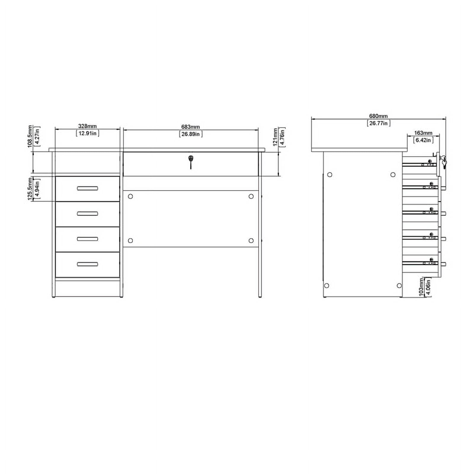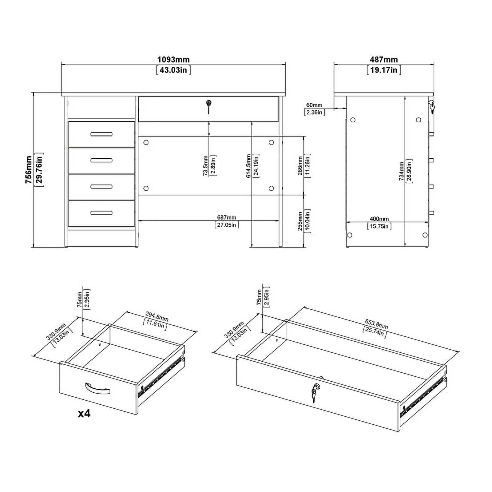 Dimensions: 43.03W x 19.09D x 29.76H in. Adds function and style to your living room or home office Four small drawers, one large drawer and one fixed open shelf Large drawer is lockable with key Modesty panel 3D Interactive assembly through BILT: Instructions for this product are available through the free BILT app. Find a revolutionary way to assemble & install product with voice, text, & interactive animated images Drawers retract smoothly on metal glides Plastic curved handles on small drawers Product is shipped in 1 box Suggested number of people for assembly is 2 Made from engineered wood Made in Denmark Assembly Required-Includes assembly manual and all necessary hardware and fasteners. Components are pre-drilled and pre-cut ready for easy assembly. Age Group: Adults