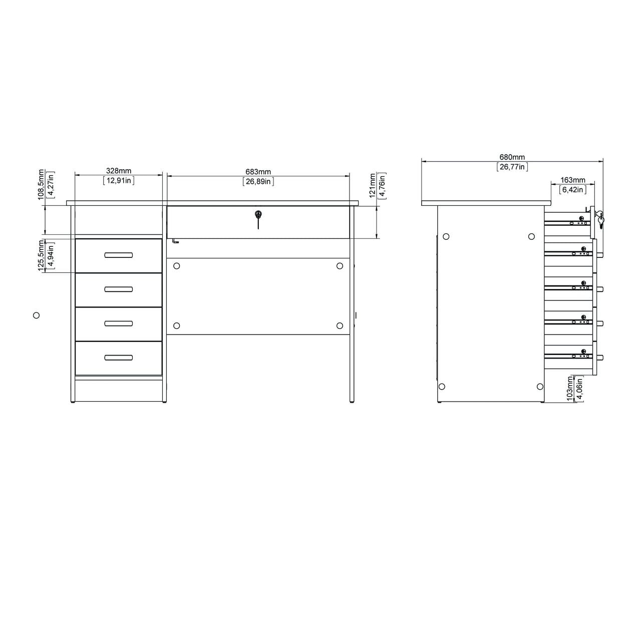 Dimensions: 43.03W x 19.09D x 29.76H in. Adds function and style to your living room or home office Four small drawers, one large drawer and one fixed open shelf Large drawer is lockable with key Modesty panel 3D Interactive assembly through BILT: Instructions for this product are available through the free BILT app. Find a revolutionary way to assemble & install product with voice, text, & interactive animated images Drawers retract smoothly on metal glides Plastic curved handles on small drawers Product is shipped in 1 box Suggested number of people for assembly is 2 Made from engineered wood Made in Denmark Assembly Required-Includes assembly manual and all necessary hardware and fasteners. Components are pre-drilled and pre-cut ready for easy assembly. Age Group: Adults