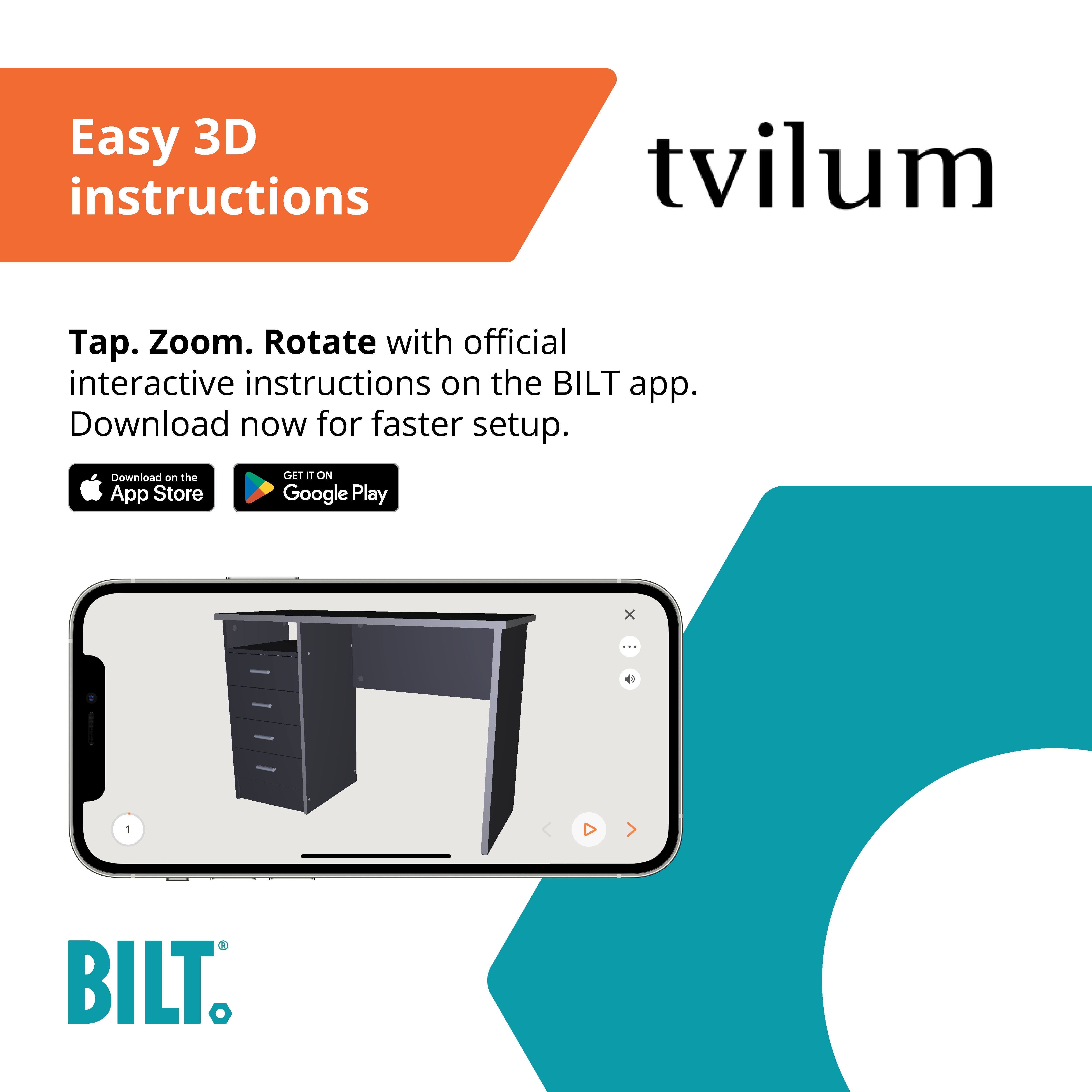 Dimensions: 43.31W x 19.09D x 29.92H in. Adds function and style to your living room or home office Four drawers and one fixed open shelf Modesty panel Drawers retract smoothly on metal glides Aluminum bar handles 3D Interactive assembly through BILT: Instructions for this product are available through the free BILT app. Find a revolutionary way to assemble & install product with voice, text, & interactive animated images Product is shipped in 1 box Suggested number of people for assembly is 2 Made from engineered wood Made in Denmark Scandinavian look and design. Assembly Required-Includes assembly manual and all necessary hardware and fasteners. Components are pre-drilled and pre-cut ready for easy assembly. Age Group: Adults