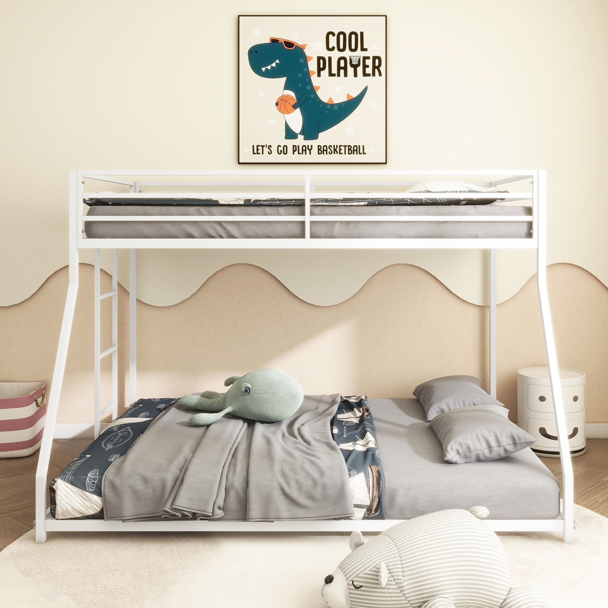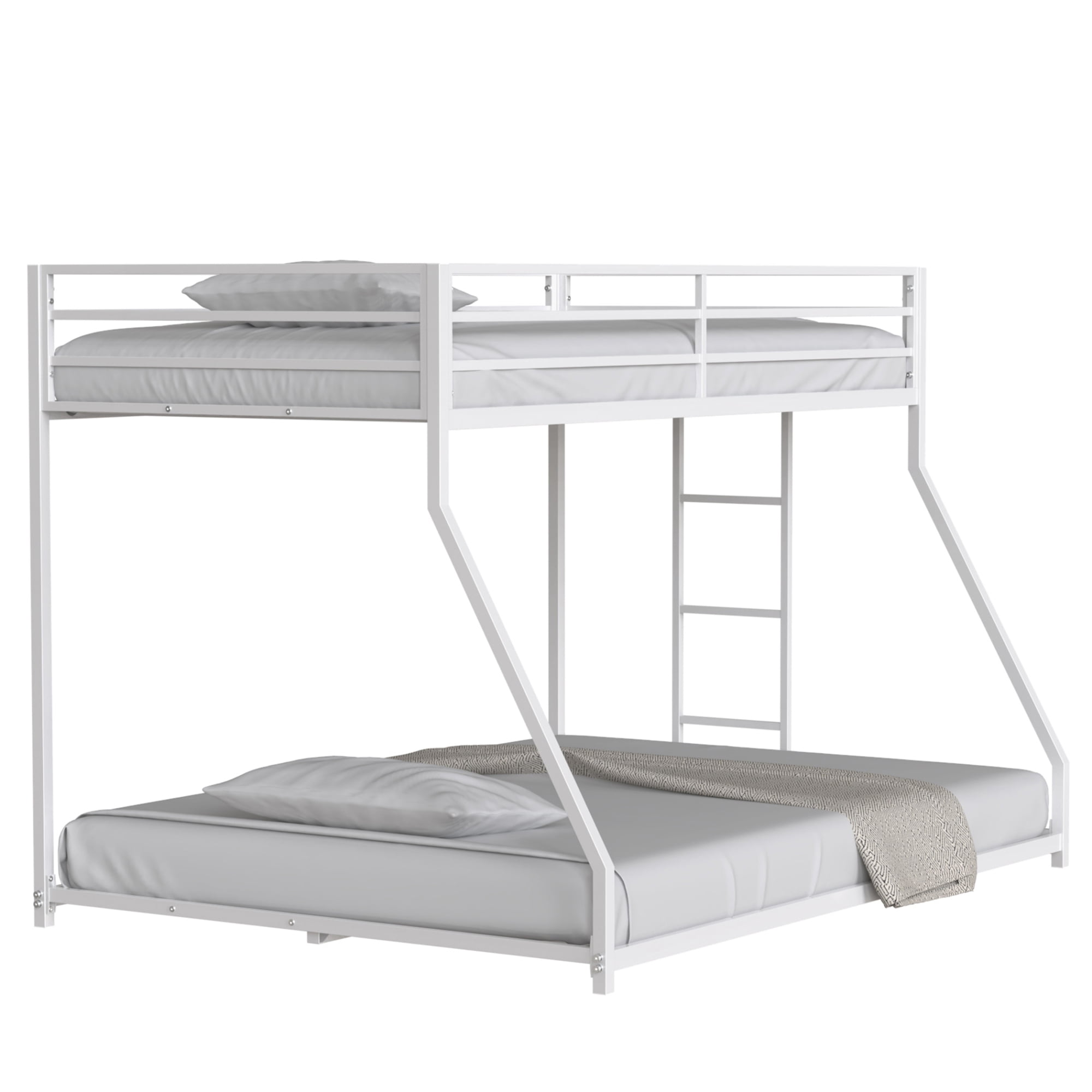 [CLASSIC & TIMELESS DESIGN] This Twin over Full metal bunk bed features timeless styling with durability that will last for years. Suitable for any sleeping area, such as children’s bedrooms, college dorms, vacation rentals, and institutions. A perfect bunk bed for kids, teens, and even adults. [UNMATCHED DURABILITY] Our sturdy square tube bed frame provides maximum support for users up to a weight capacity of upper bed 350lbs and lower bed 500lbs, ensuring safety and stability for a great night’s sleep. [SAFETY MEASURES] The top bunk is constructed with reinforced guardrails to reassure safety first. A convenient ladder with comfortable steps makes it easy for children to climb up and down with peace of mind. [INTERCHANGEABLE LADDER] The ladder can be installed on either side of the bed, ensuring versatility for every home. [NO BOX SPRING REQUIRED] With 22 superior metal slats, our Adam bunk bed is ready to support mattresses without box springs. [EASY ASSEMBLY] Assembly time should take 2 adults 45-60 mins to assemble. [RECOMMENDED MATTRESS SIZES] For safety, use only mattresses that are 74″-75″ long and 37.5″-38.5″ wide for the upper bunk and 74″-75″ long and 53-54″ wide for the lower bunk. Ensure mattress thickness does not exceed 6″. The top of the mattress must be at least 5″ (127mm) below the upper rim of the guardrails. For comfort, we suggest a minimum mattress thickness of 4″.