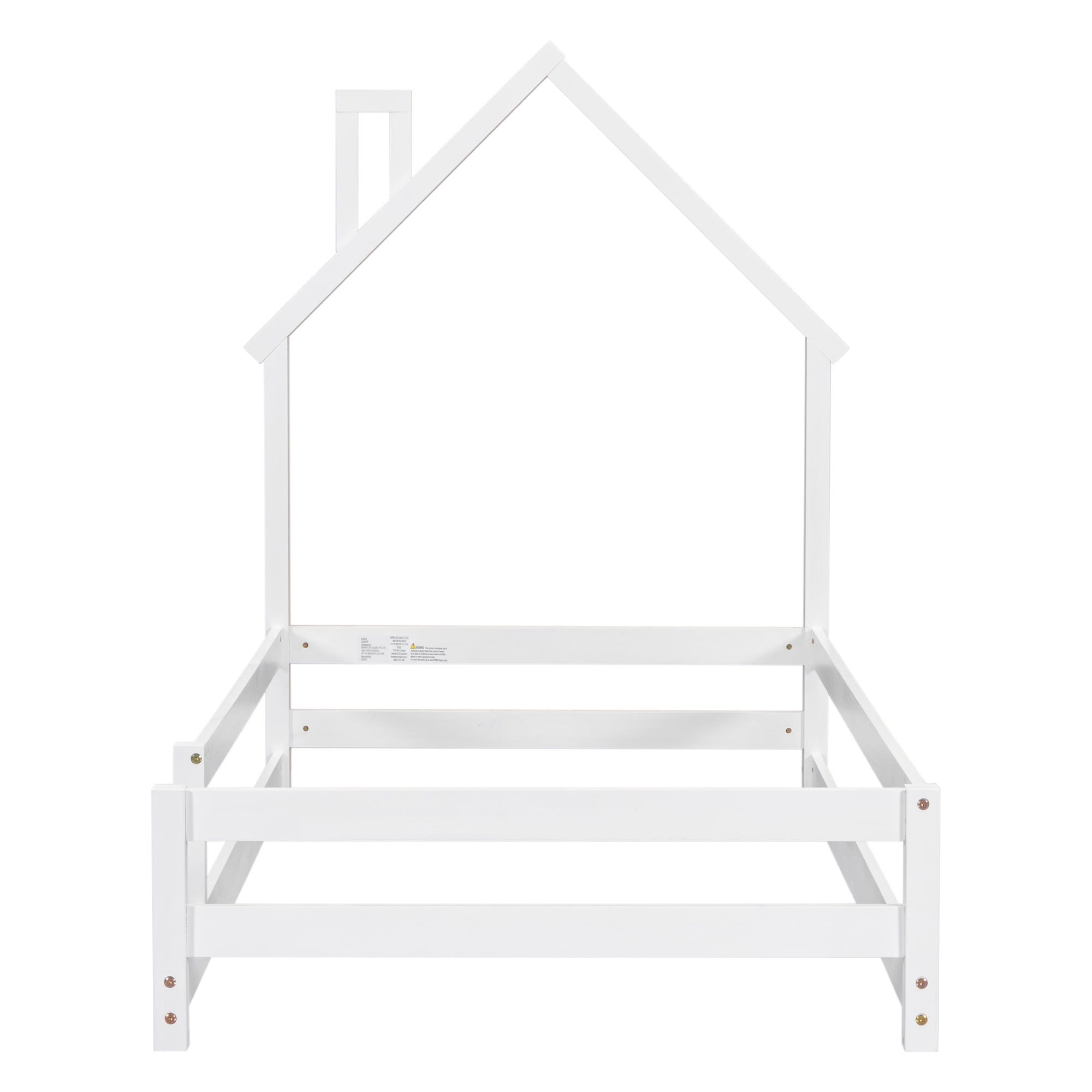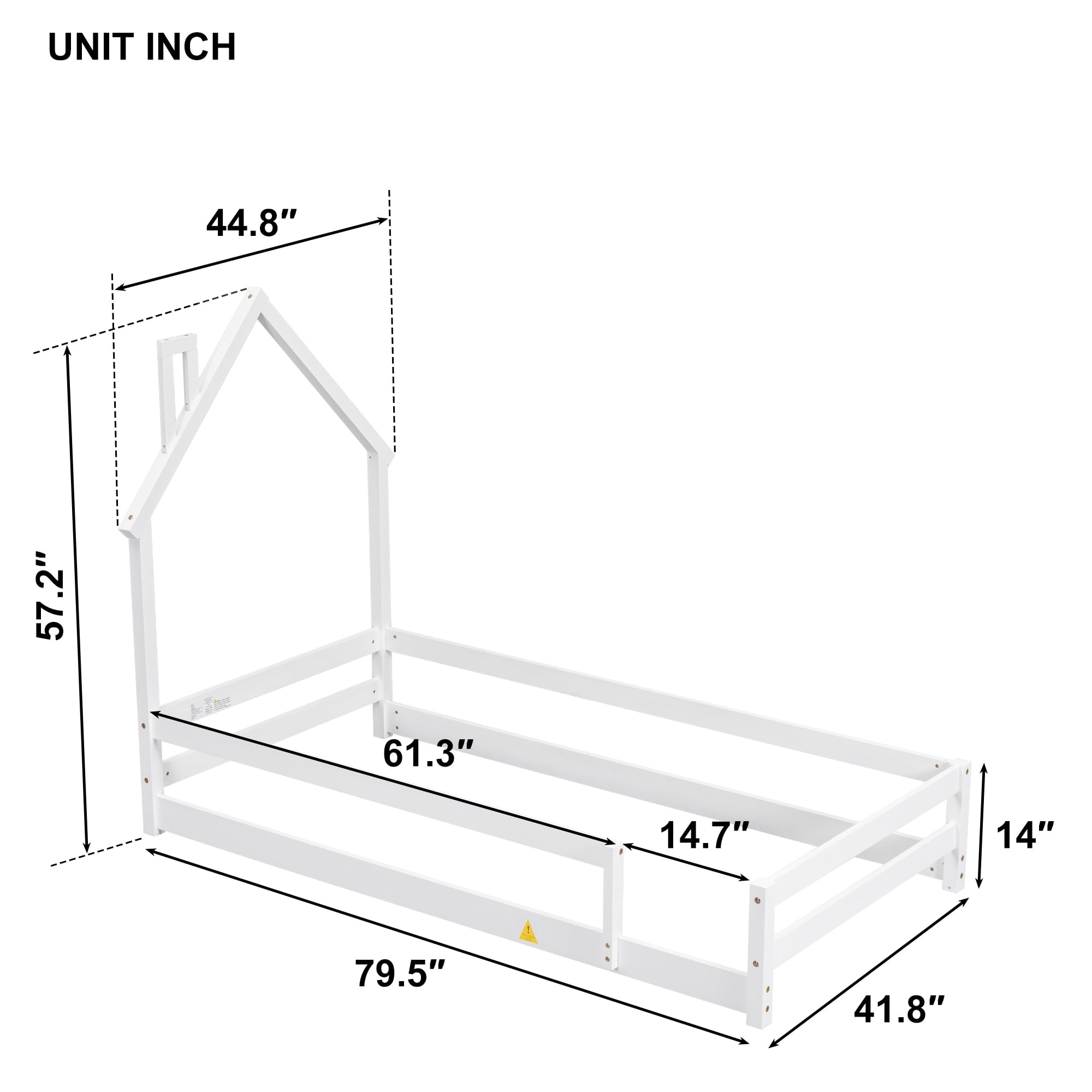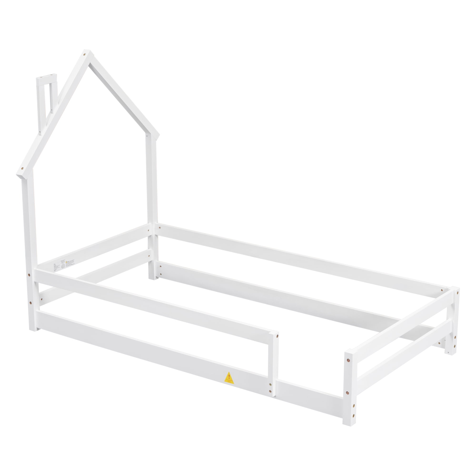 Twin Size Floor Bed with House-Shaped Headboard,Wooden Montessori Floor Bed with Fence Guardrails,Wood House Platform Bed for Girls and Boys, No Weight Limit,White