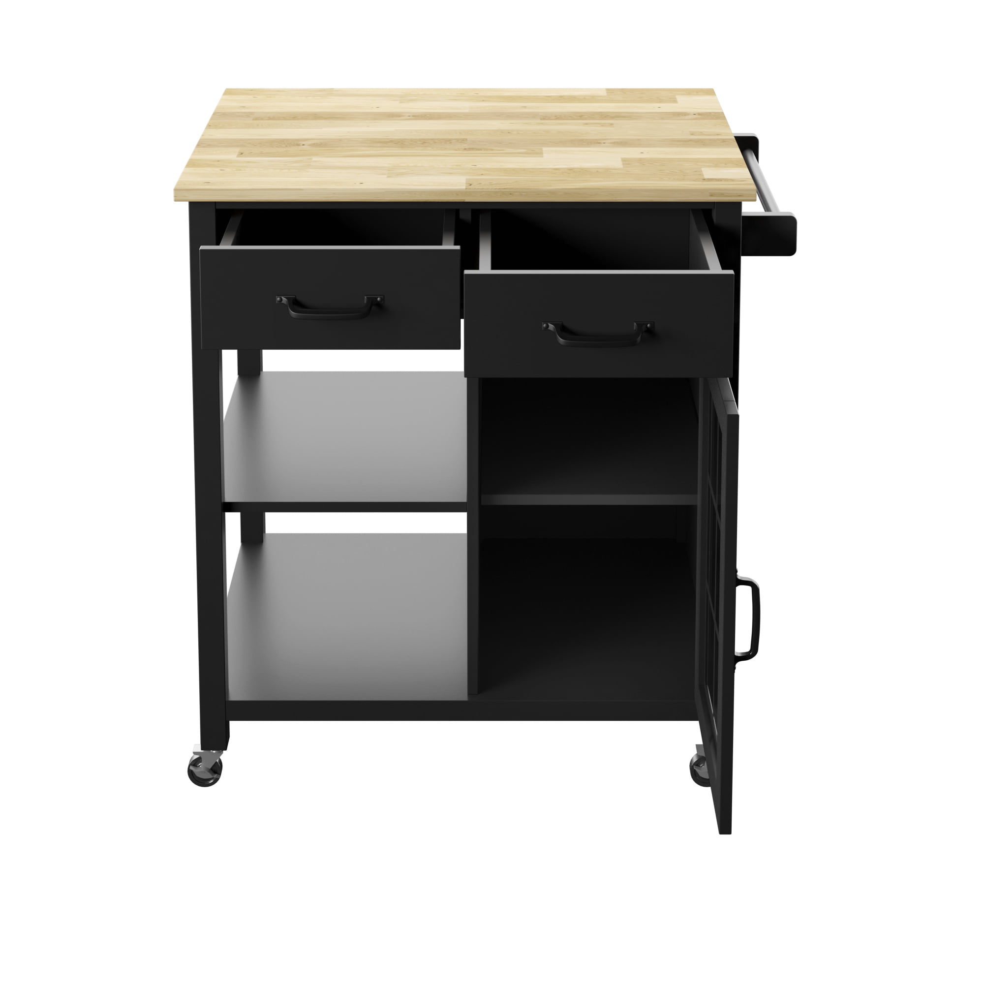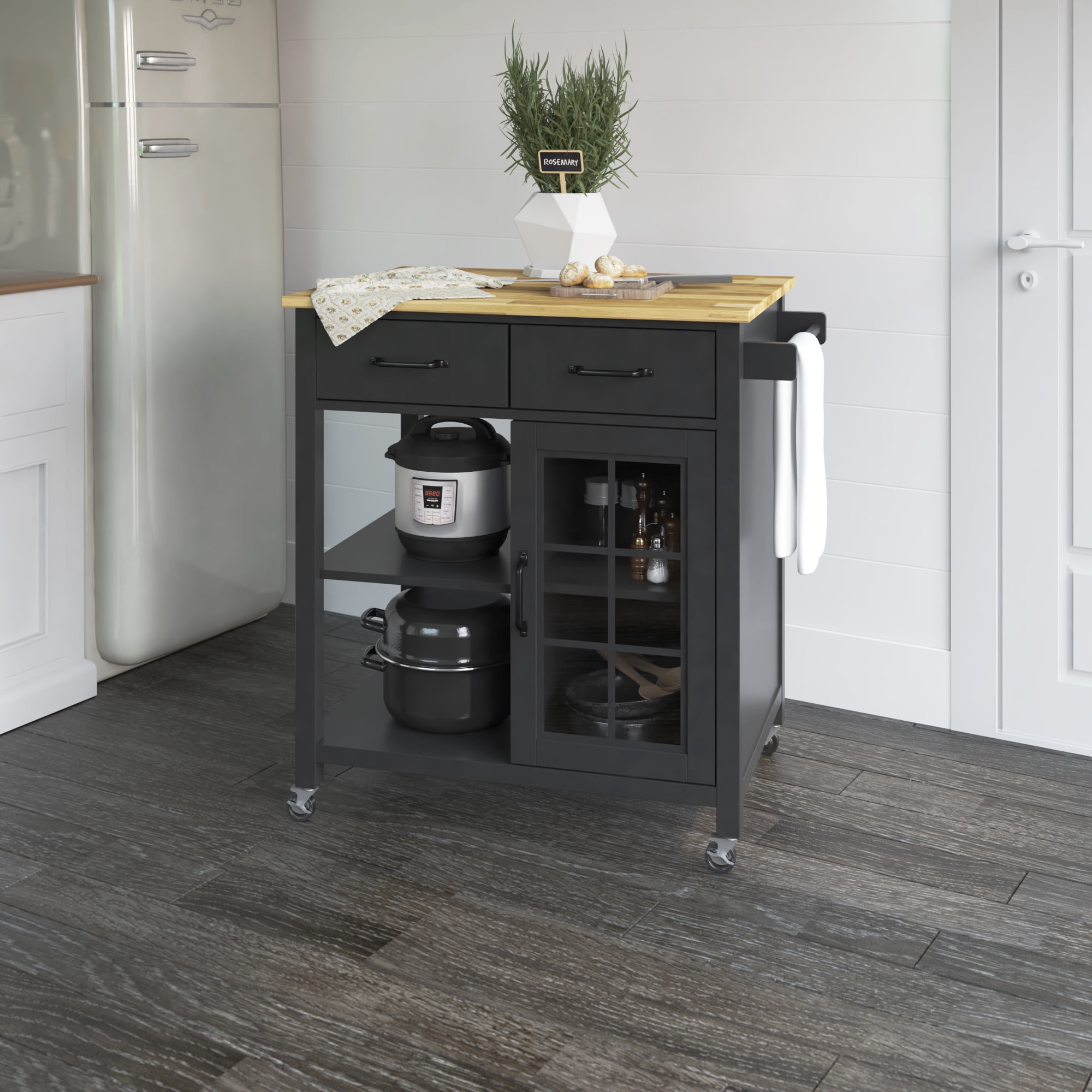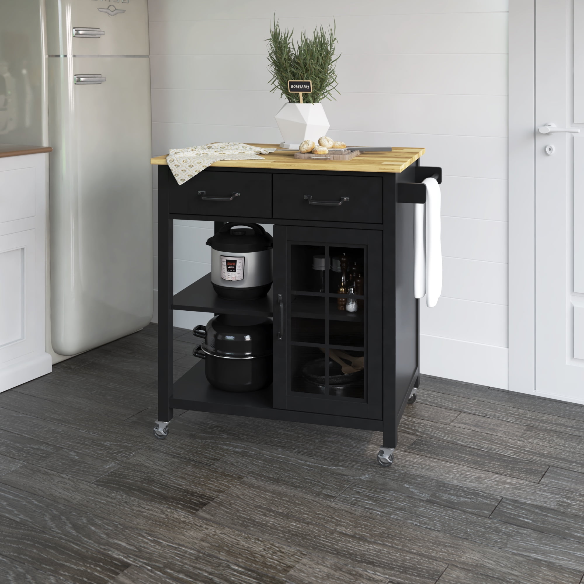 Whether you have a small kitchen or simply need more space to prep, serve, and stow, this rolling kitchen cart with modern farmhouse style was made to do it all. An open counter top sets the stage for a beautiful and functional work space while an attached towel rack helps to keep clean up simple. Two drawers and a cabinet allow you to store everything from dry ingredients to utensils and appliances. The two open shelves offer larger real estate for things like that multi cooker you just can’t seem to fit anywhere. With a four-wheel rolling base, the kitchen cart provides versatile use when and where you need it.