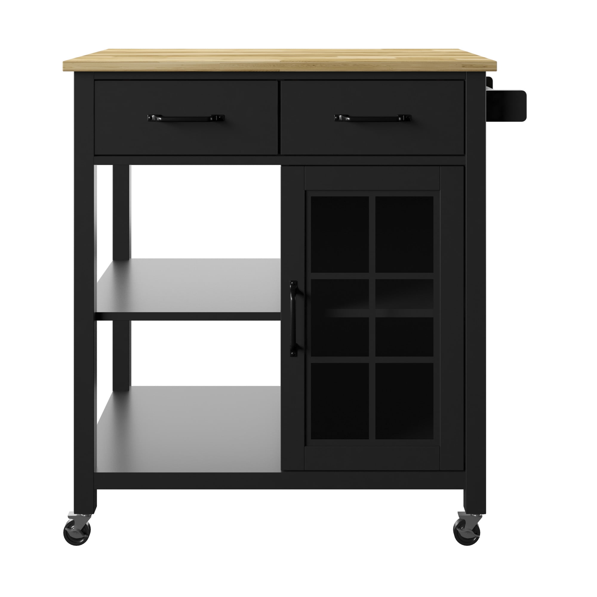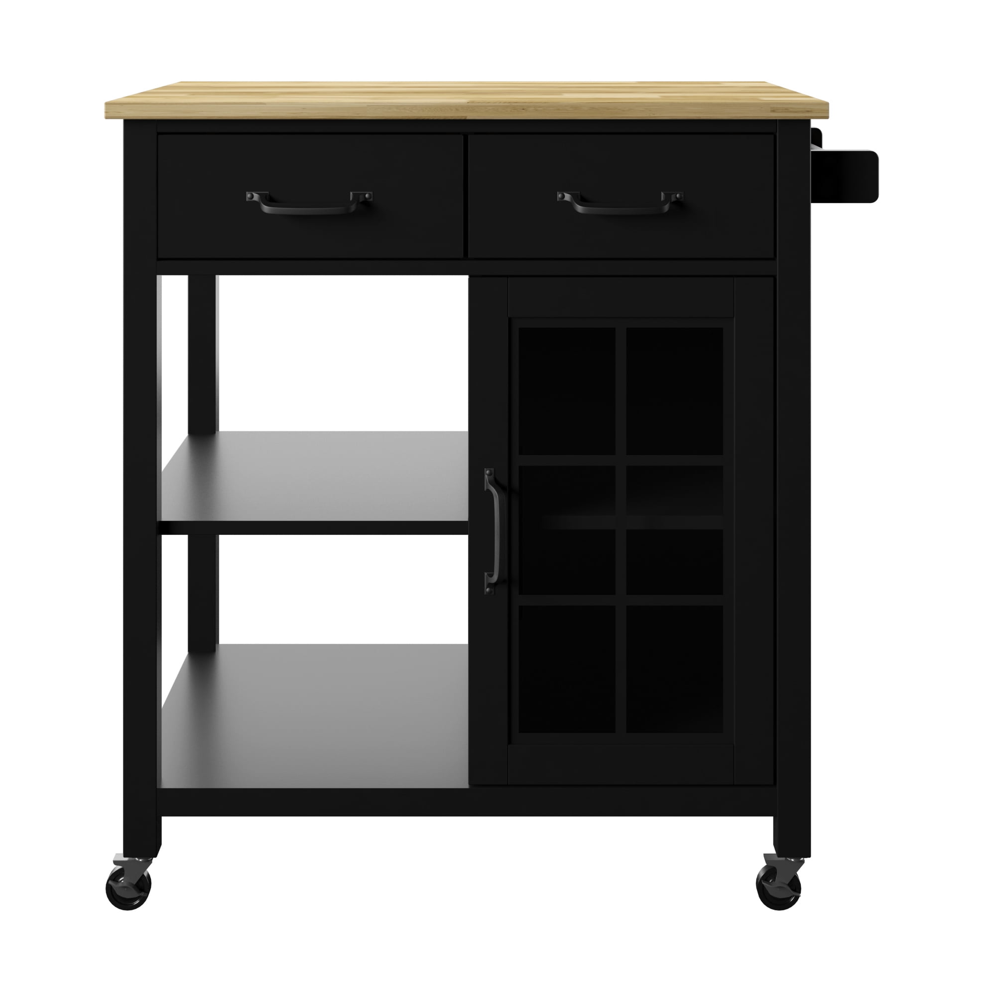 Four-wheeled base with locking casters for convenient and safe mobility Two upper drawers for added storage of smaller items Attached towel rack for quick clean up One interior shelf that can be adjusted to three height levels Glass cabinet door features black screen-printed mullion for easy cleaning Two open shelves large enough for a multi cooker or other cooking appliances Large open workspace for mealtime planning Brand: Twin Star Home Dimensions: 23.12 in. D x 33.7 in. W x 36 in. H Product Weight: 90.42 lbs.