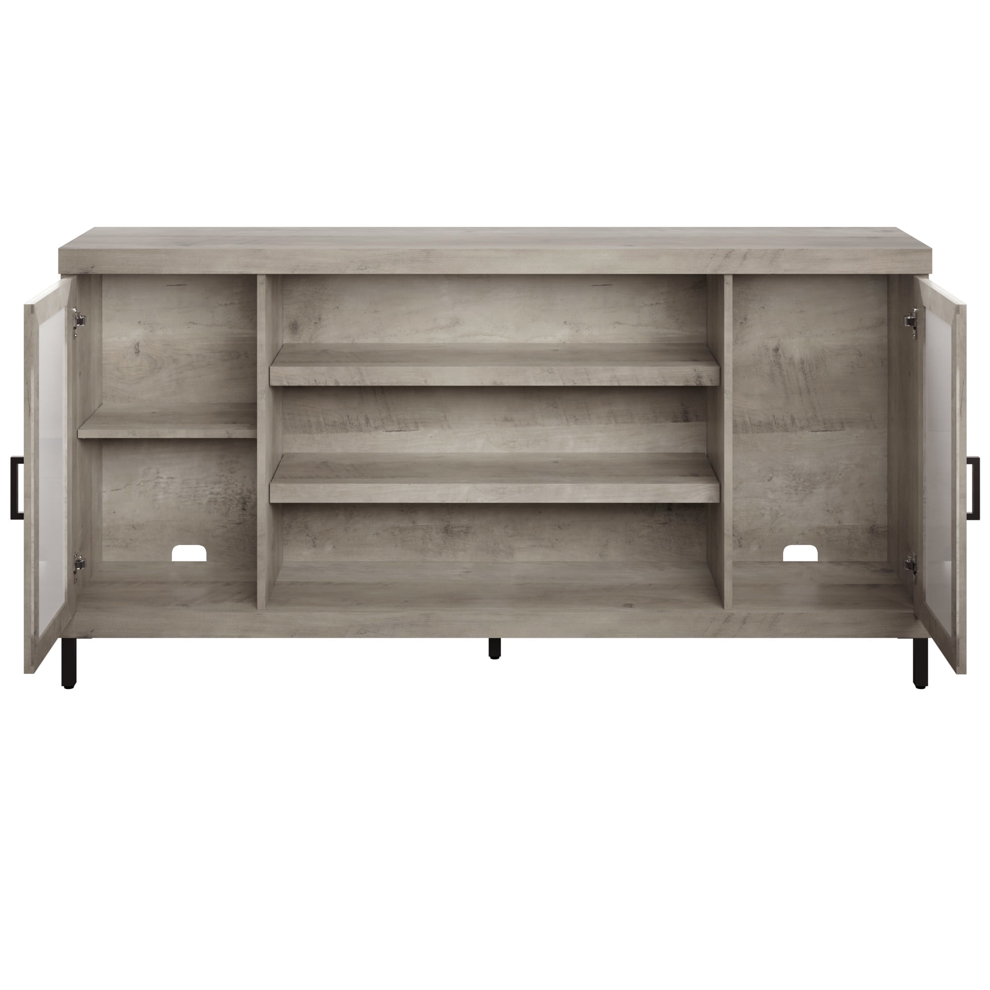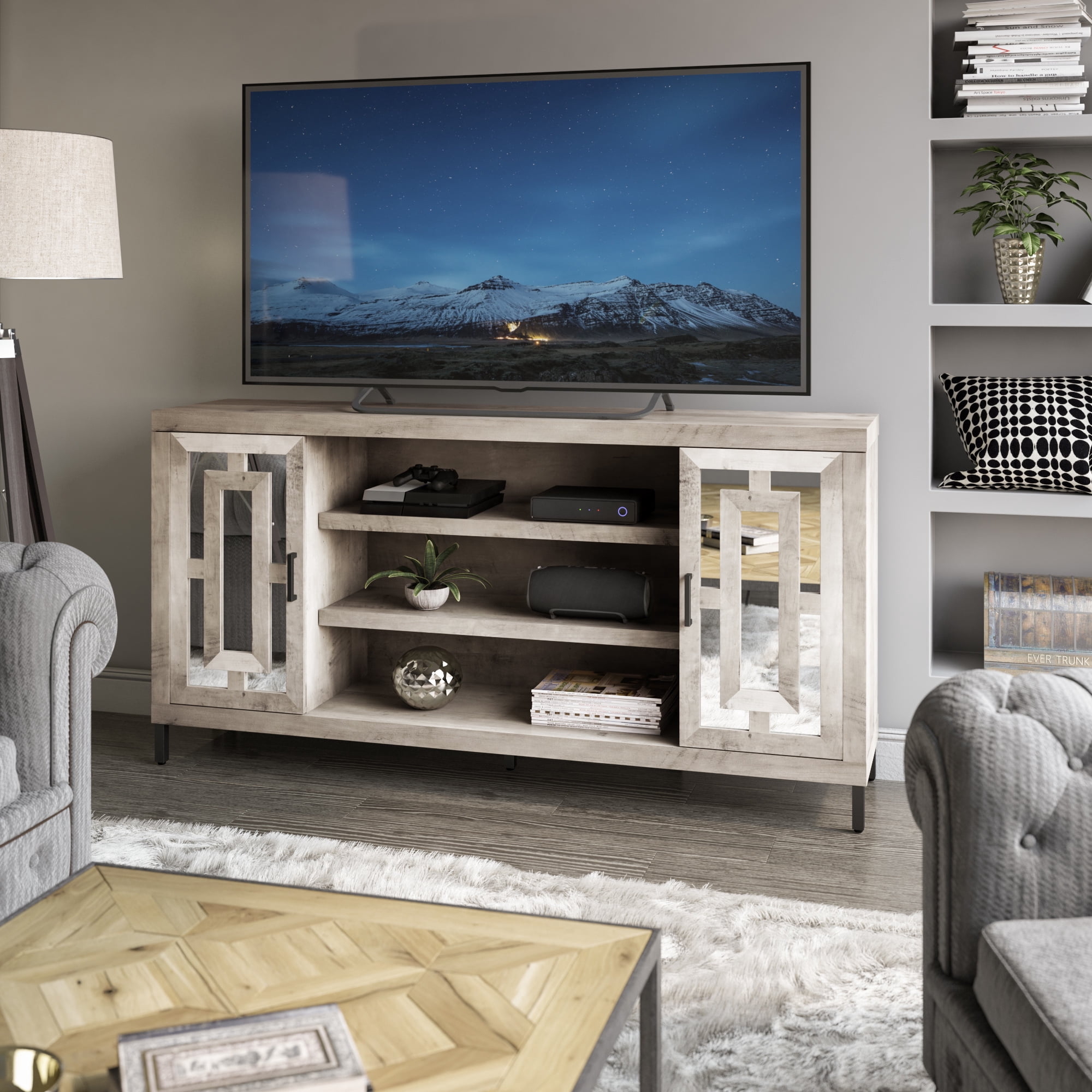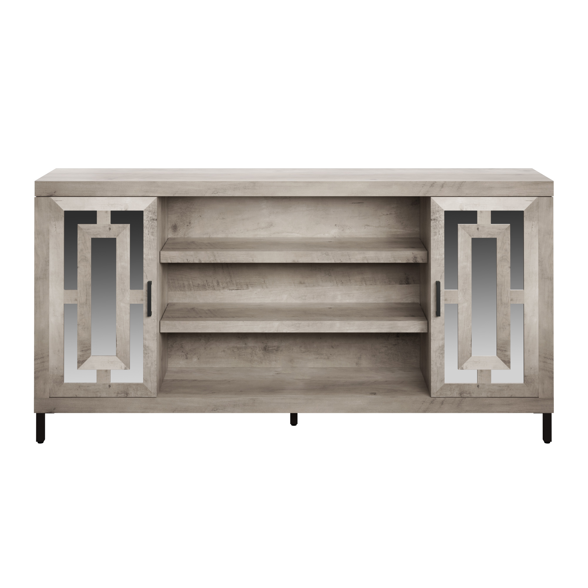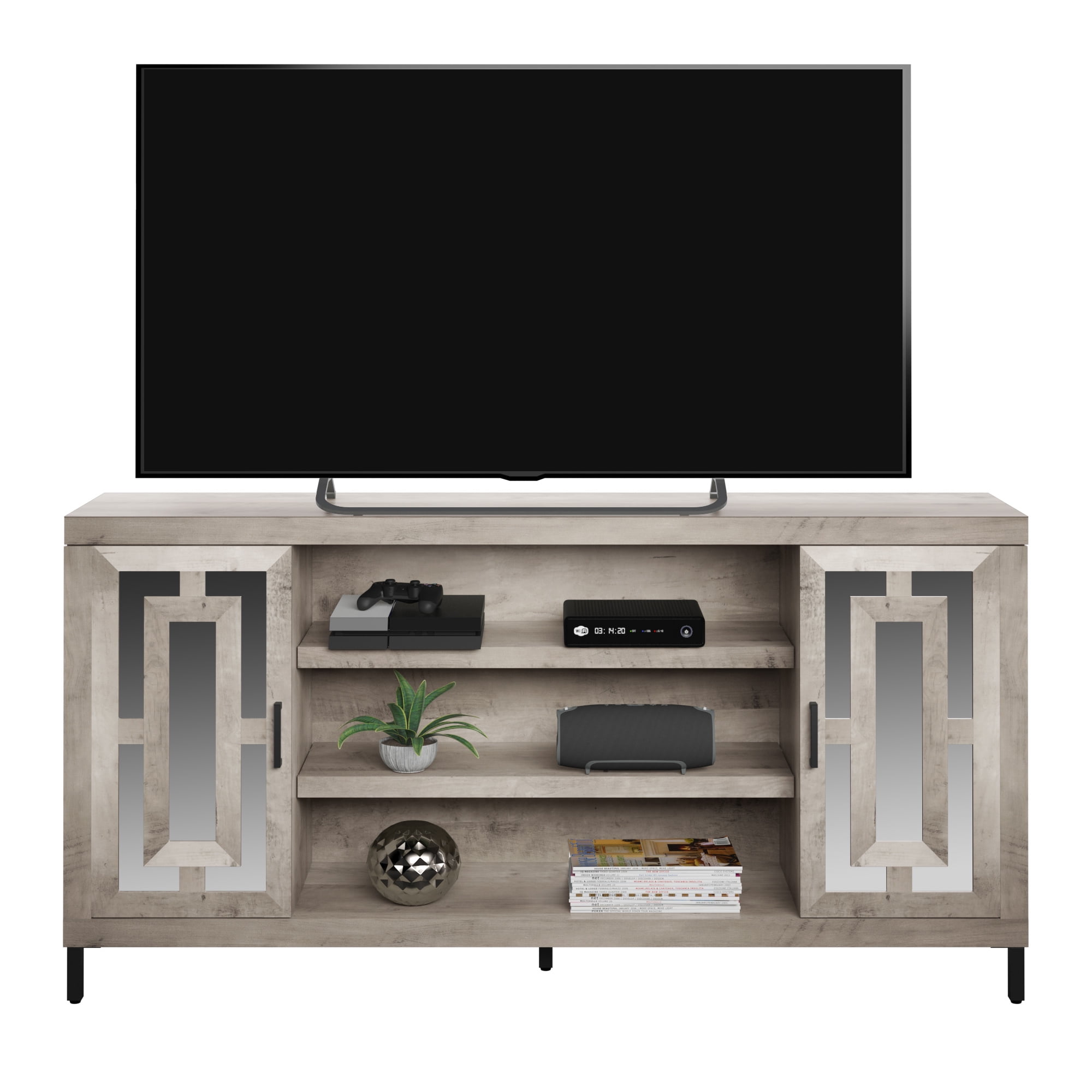Add a glamorous look to your home with this beautiful TV stand Holds most flat screen TVs up to 70 inches Decorative mullions add subtle depth and texture Mirrored doors provide style and elegance while you entertain friends and family Adjustable shelves allow you to customize your exact storage needs Complete the look with matching pieces from this collection Simple assembly required, with easy-to-follow instructions included