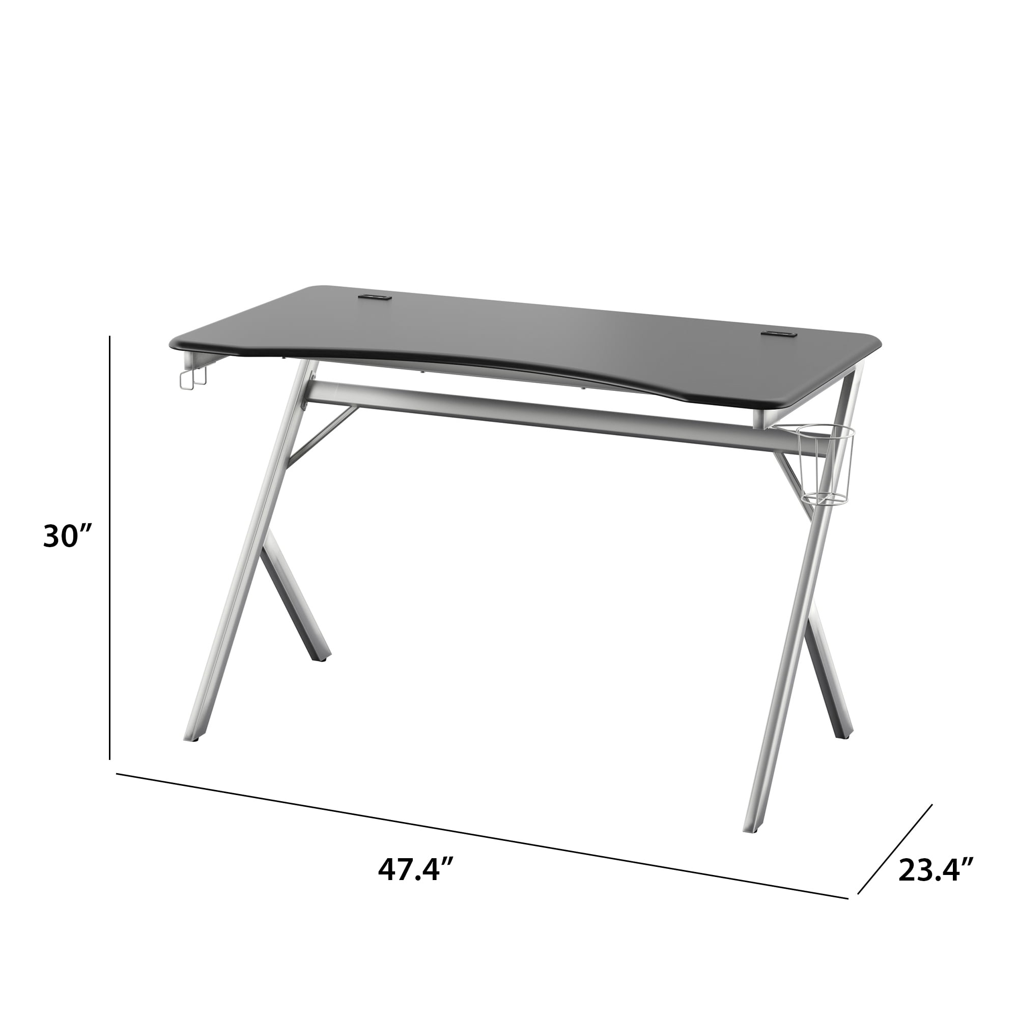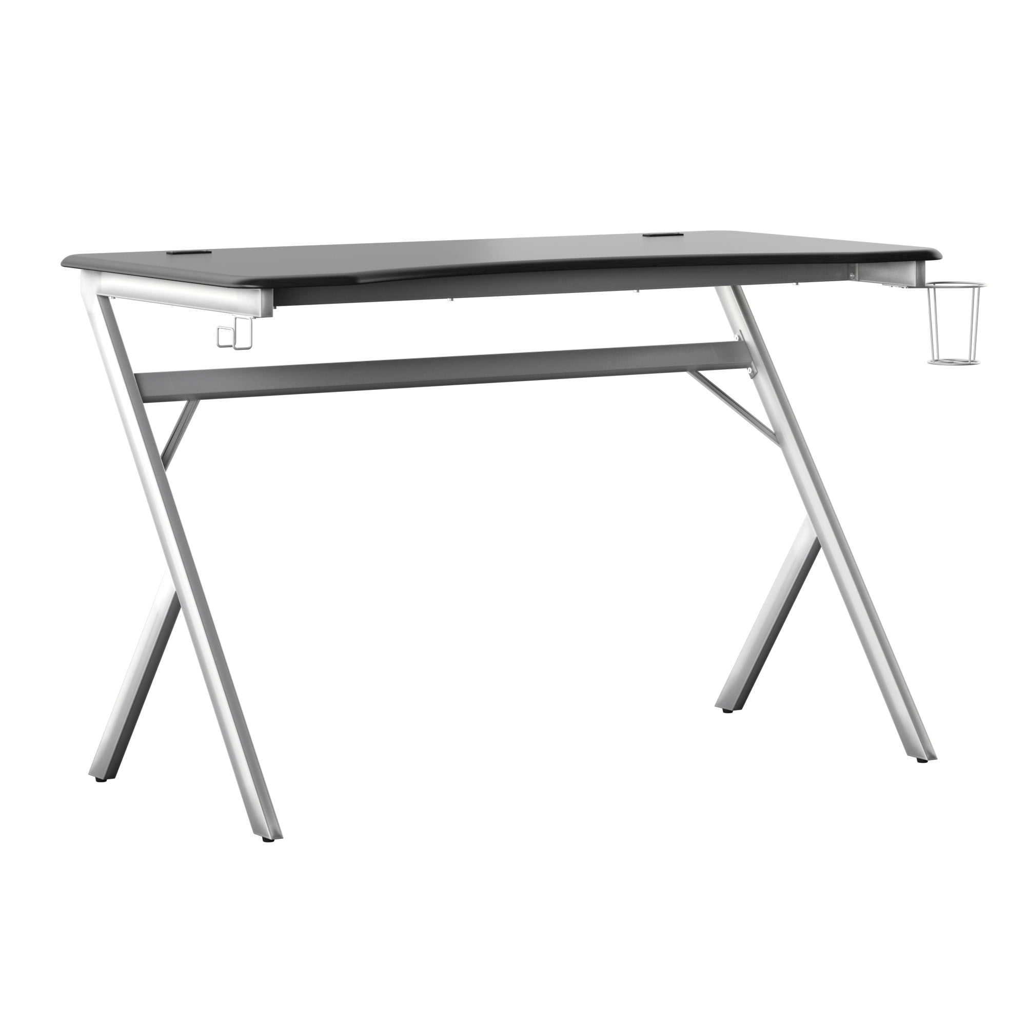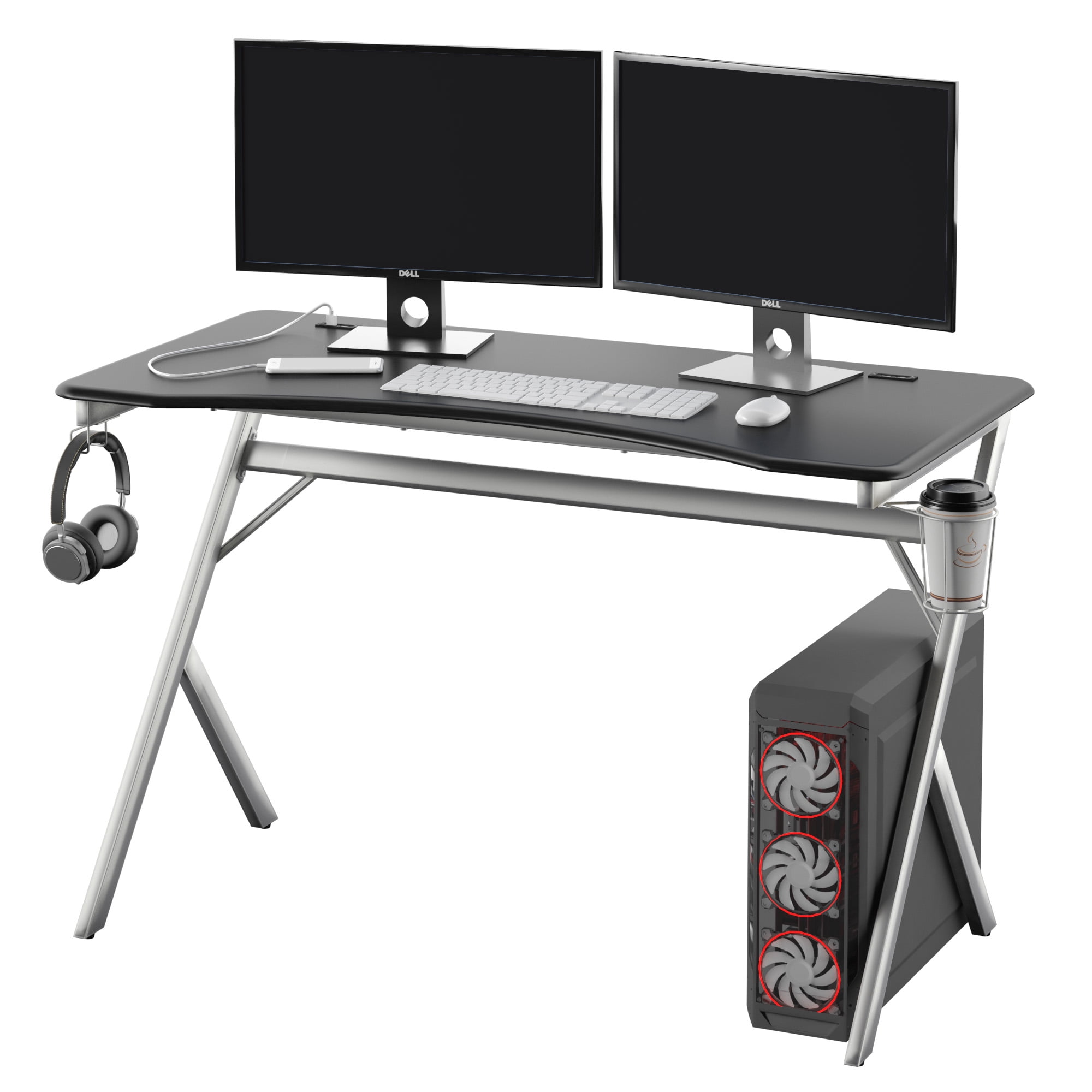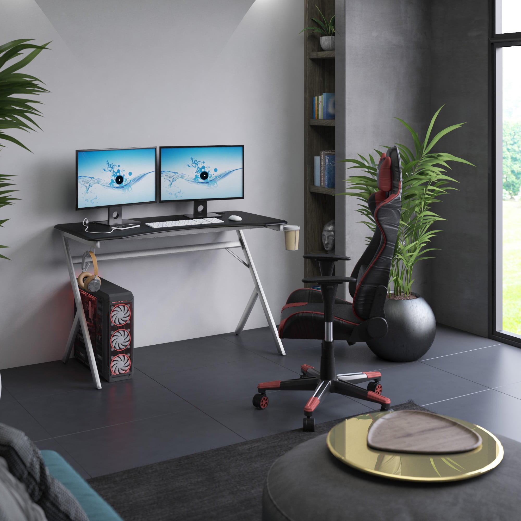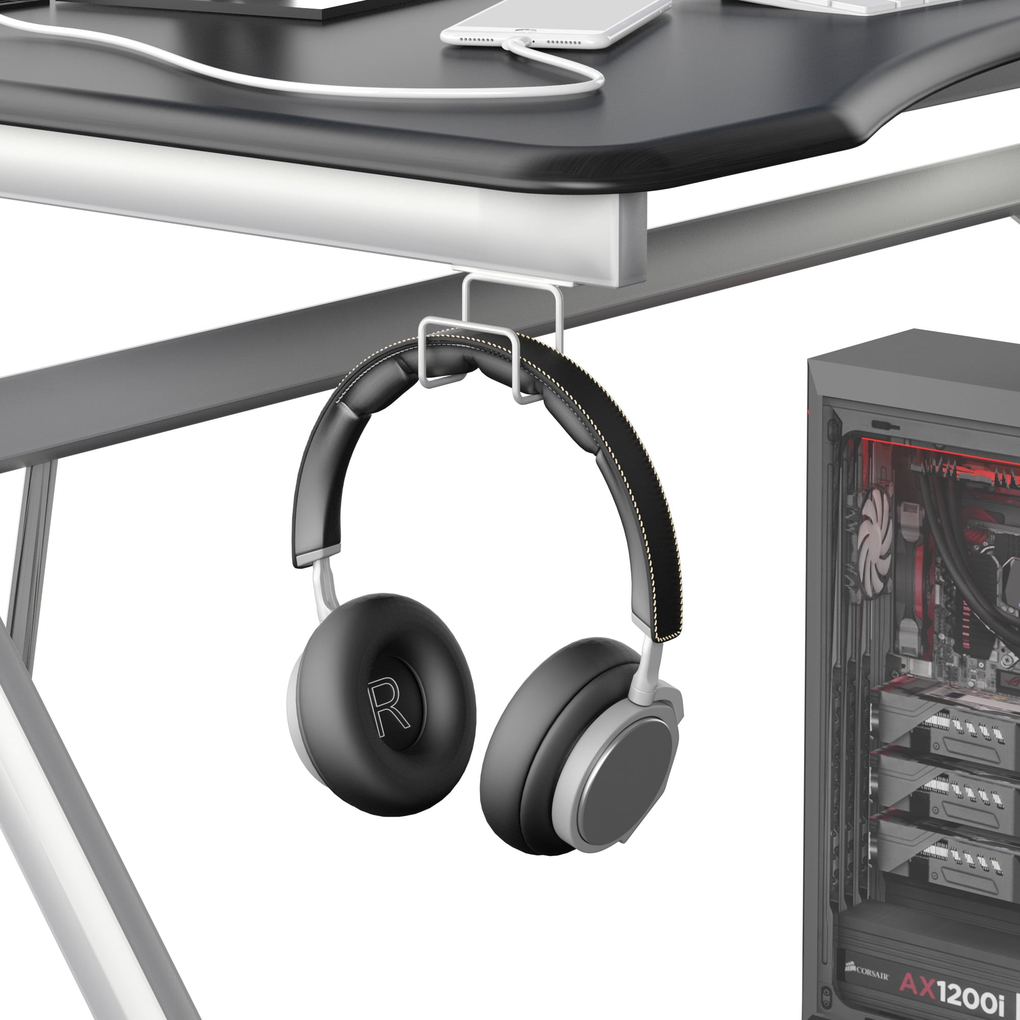 With innovative technology and a smart, functional design, this gaming desk has everything you need for your next video game binge or late work night. Two built-in USB ports on each end of the desk (four USB connections total) give you plenty of ways to charge mobile devices or game controllers and connect desktop gadgets. One side of the desk has a hook to keep your headphones handy. On the other side of the desk is a cup holder, that way you always have a beverage close by. Use this desk in any room to upgrade your gaming setup or prepare a much-needed at-home workspace.