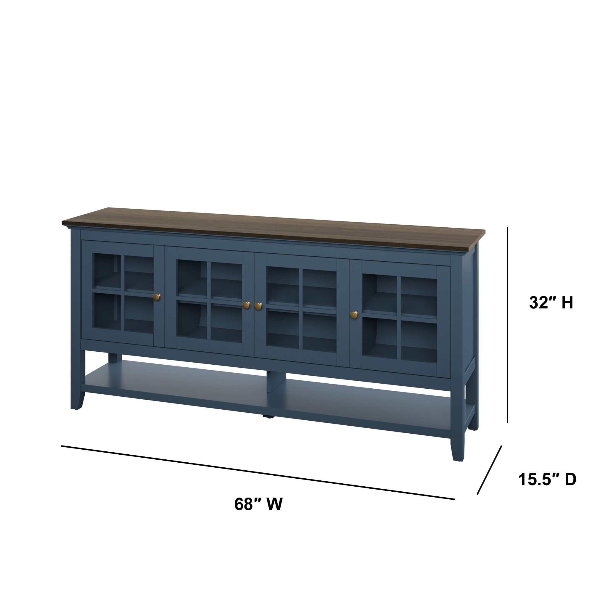 Complementary colors and a modern farmhouse look add rustic charm to your space Glass cabinet doors with adjustable shelves accommodate all your storage needs Back panel cutouts are perfect for managing wires and organizing cables Large, open lower shelf for media storage, décor, and more Tip-restraint hardware included Simple assembly and easy-to-follow instructions included