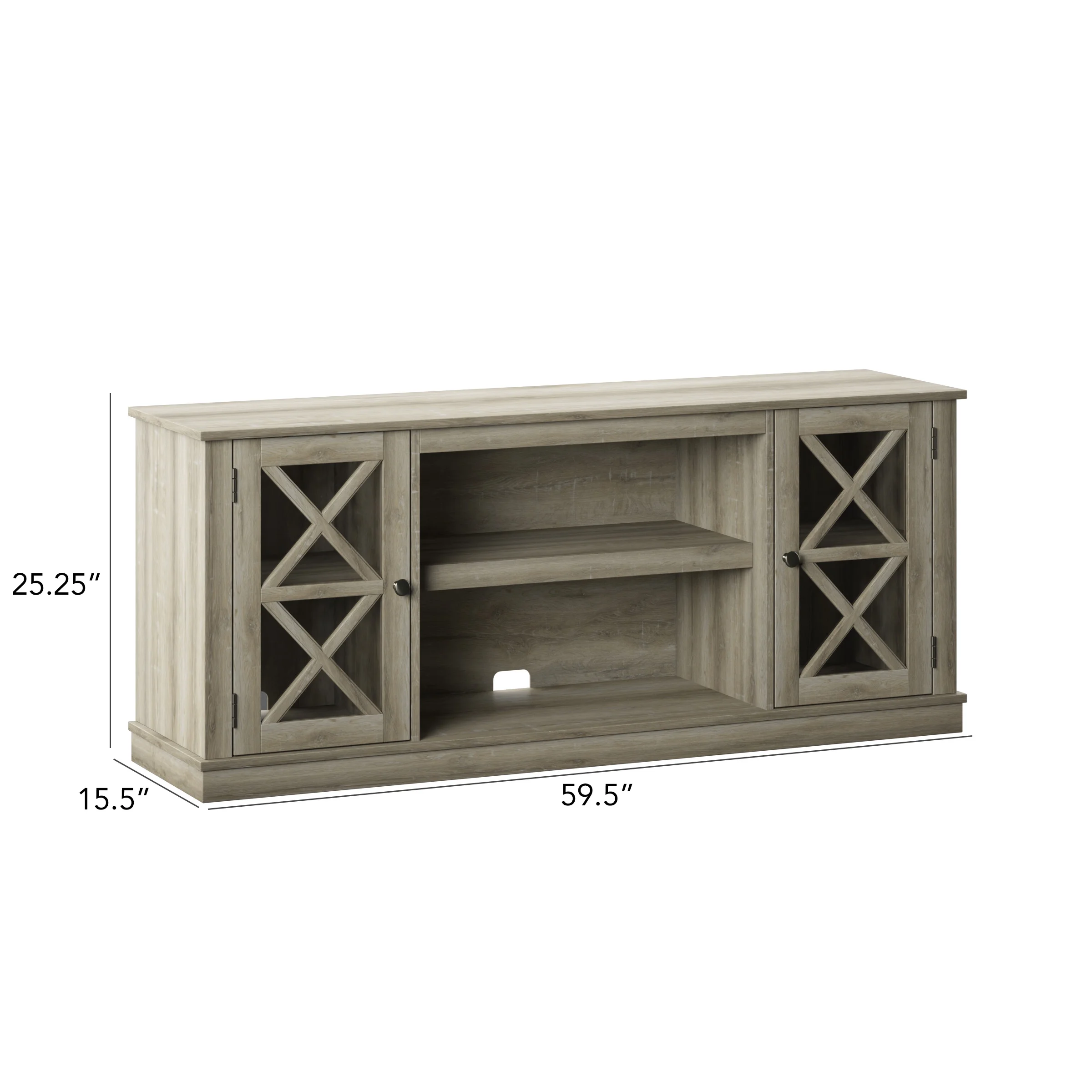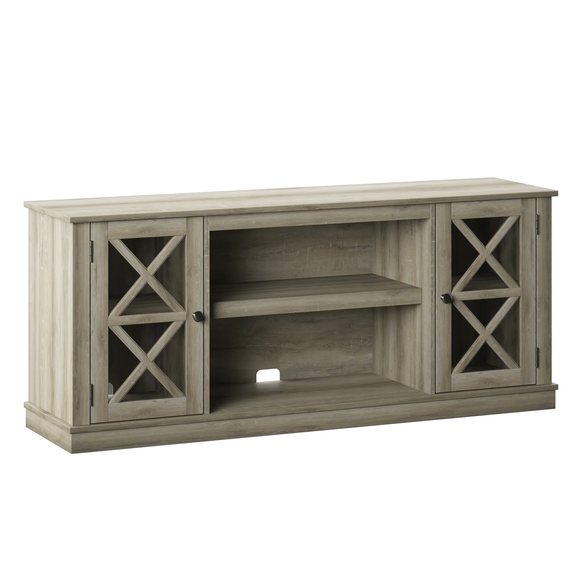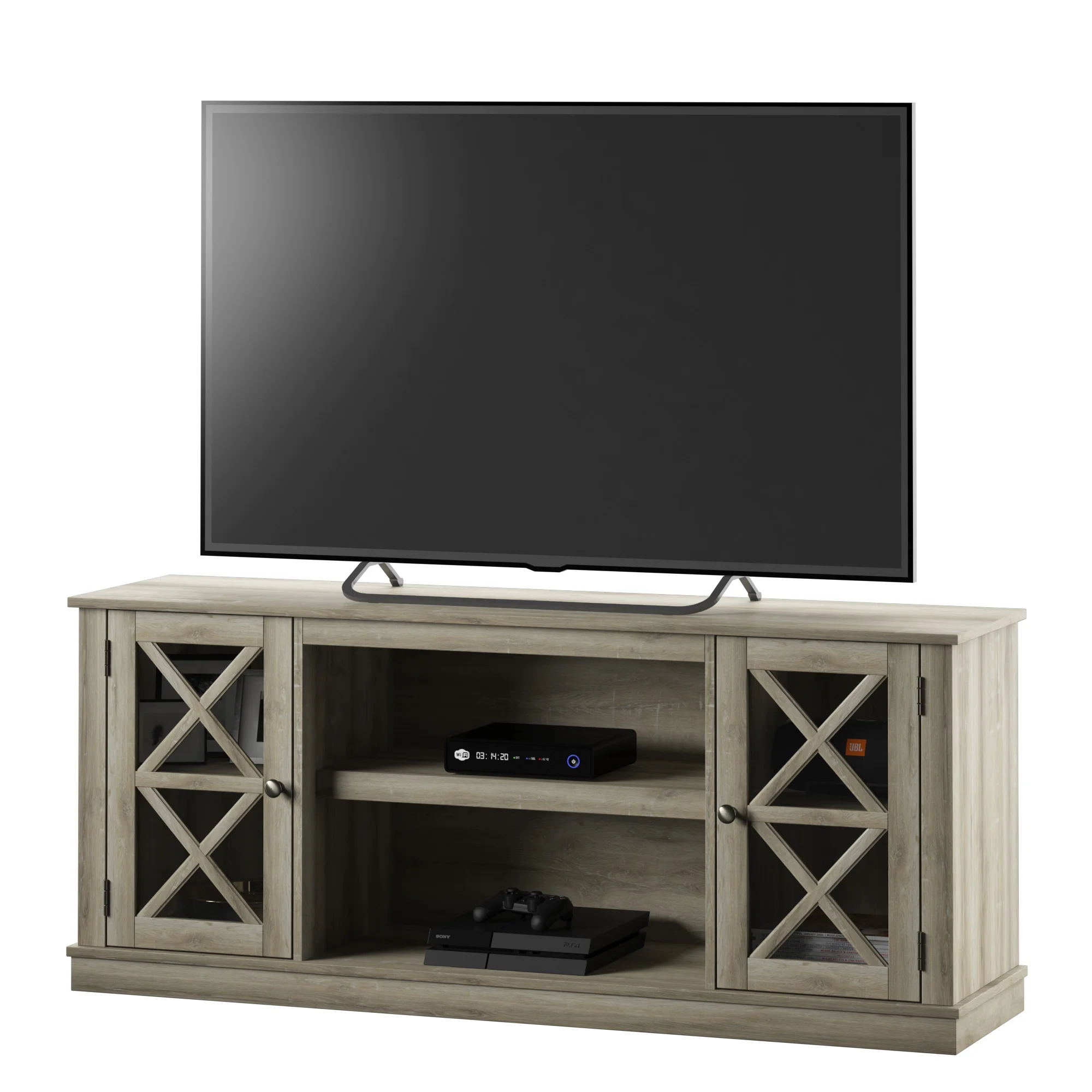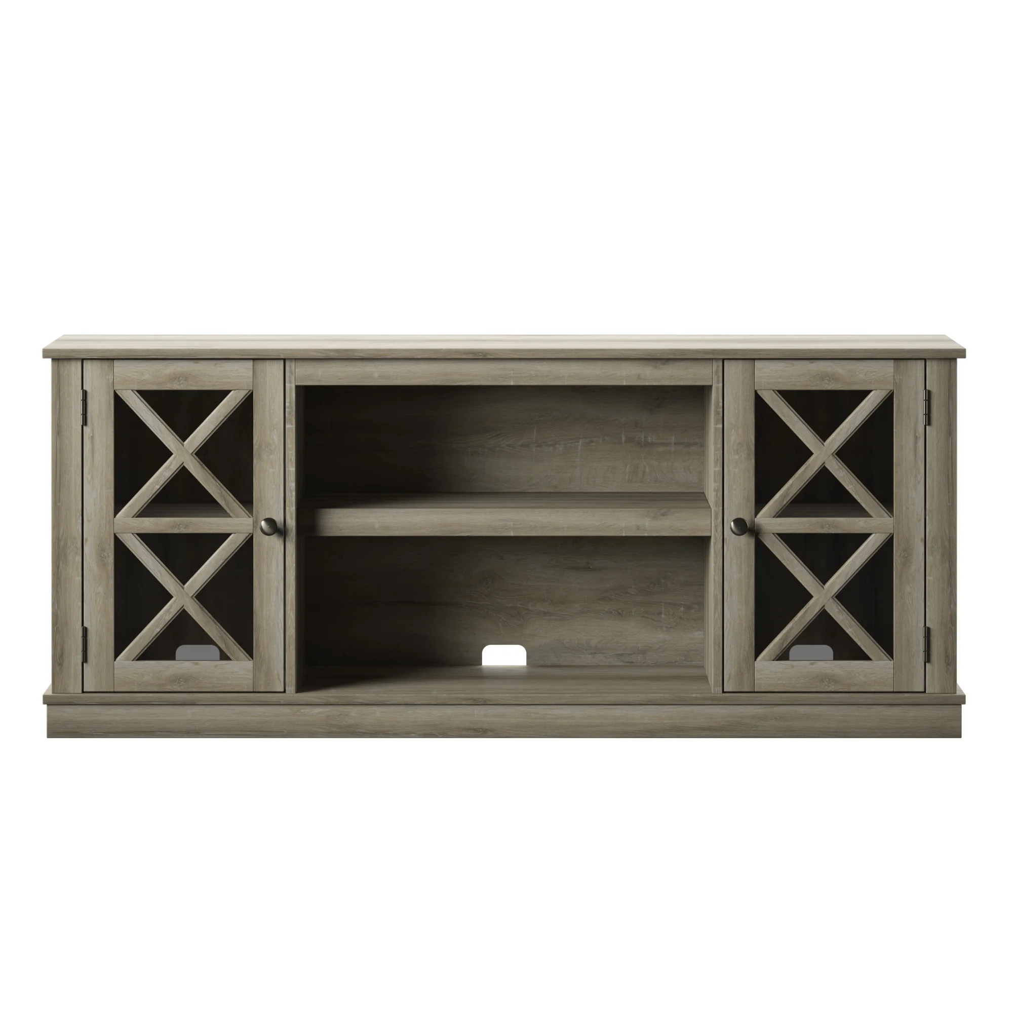 With rustic accents and modern farmhouse charm, this TV stand is the perfect upgrade for your living room. Its tempered glass doors allow remote control signals to pass through to electronics while back panel cutouts control messy cords. Adjustable shelves in each cabinet and the center storage area offer flexible storage for movies, throw blankets, remotes, gaming accessories, and more. Whether it’s movie night or game day, the stand holds most TVs up to 65 inches and 60 pounds so you can enjoy viewing with friends and family.