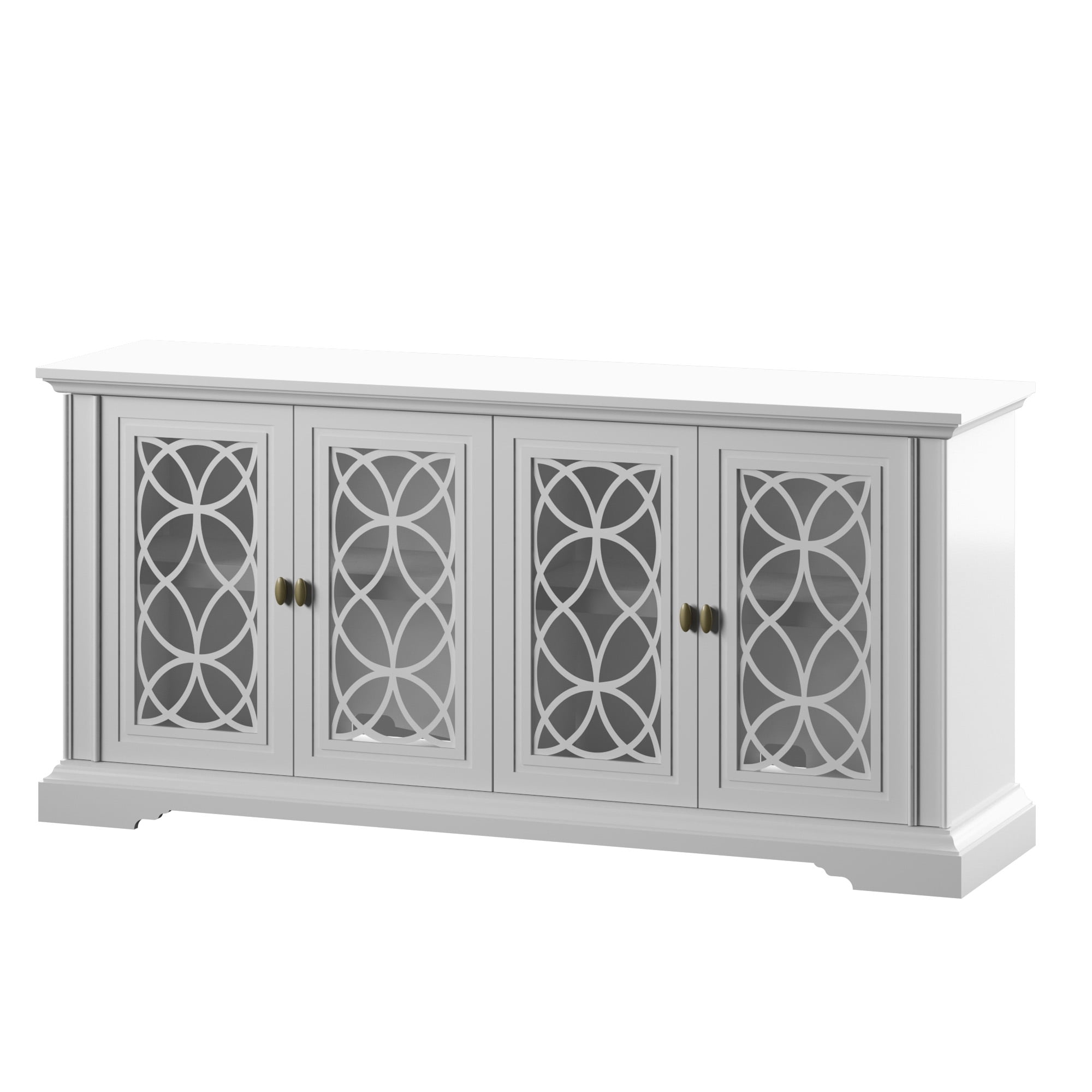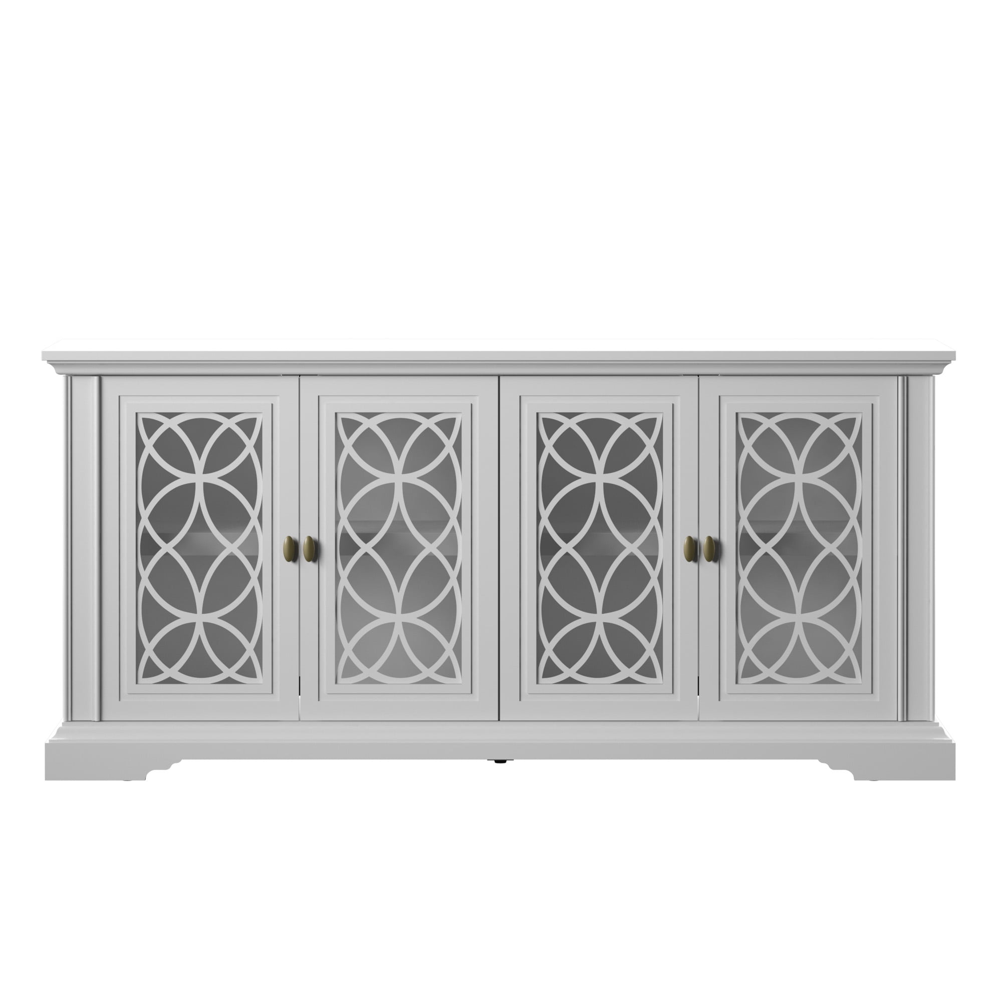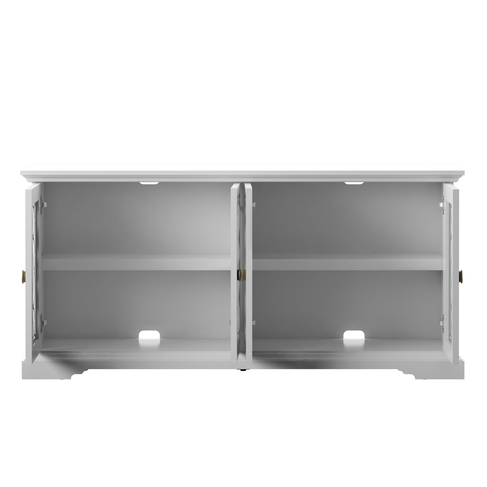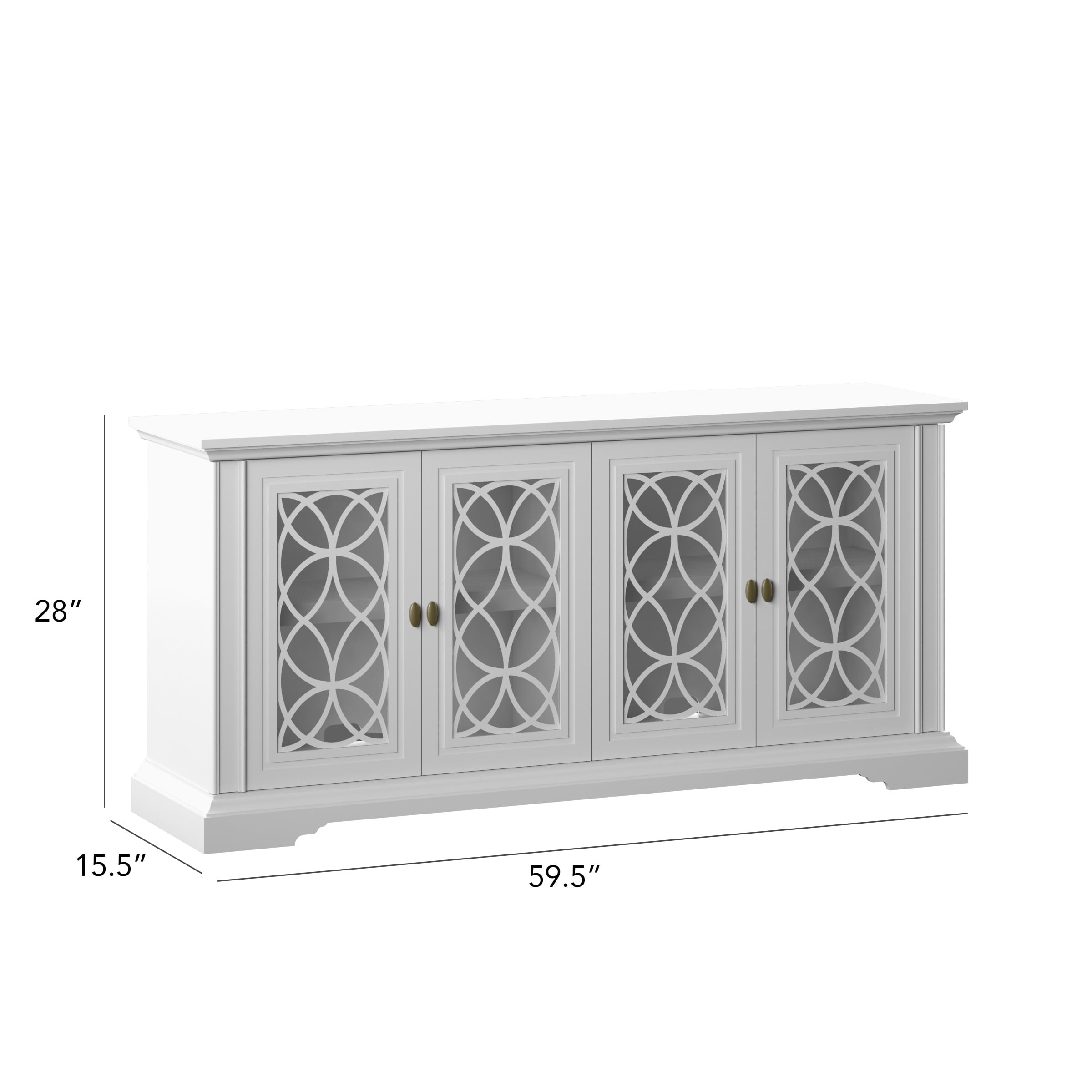 Classic style enhances any dining room or entertaining area Cabinet doors with tempered glass feature stylish screen-printed mullions Two double-door cabinets with an adjustable shelf inside each Euro hinges are hidden when doors are closed for a sleek, no-show look Pass-through cutouts on the back panel provide cord management and allow easy component storage Leveler makes it easy to achieve stable placement on uneven surfaces Versatile design allows use as a buffet table or sideboard Accommodates most flat-screen TVs up to 65″ and 60 lbs.