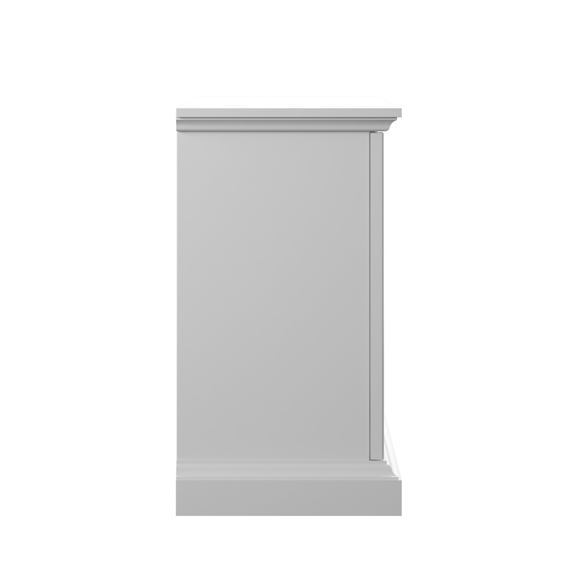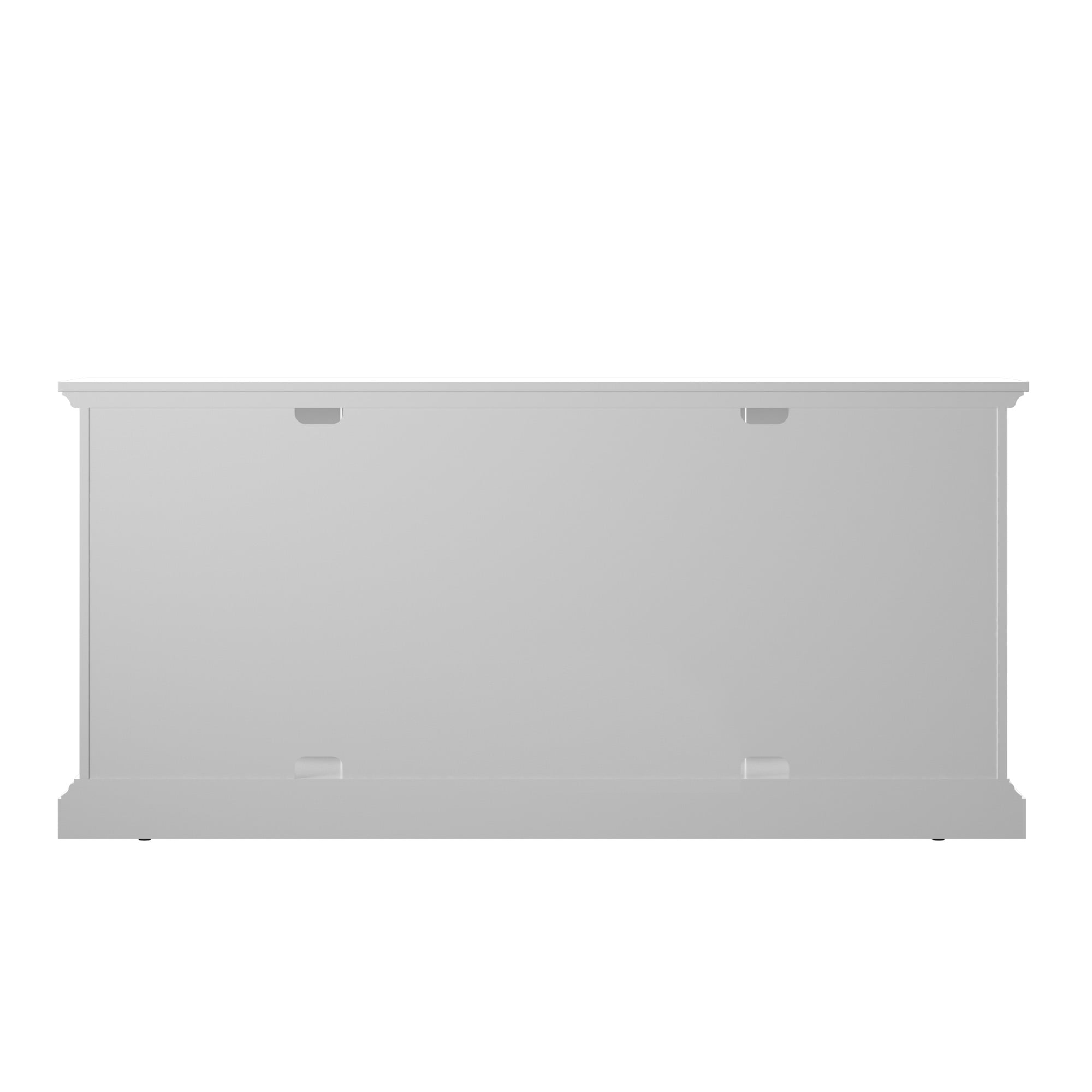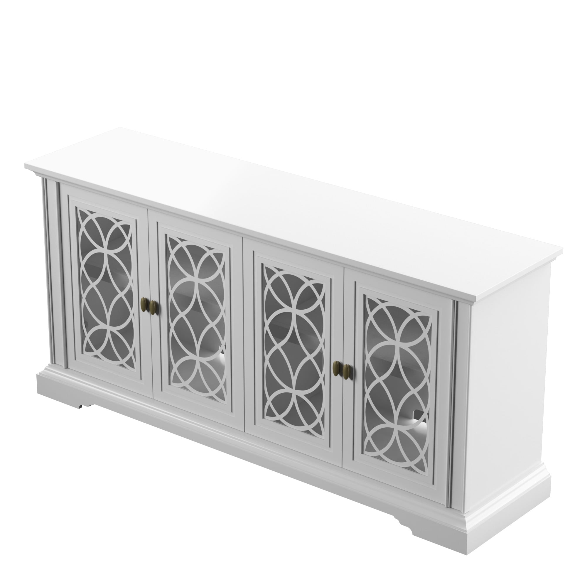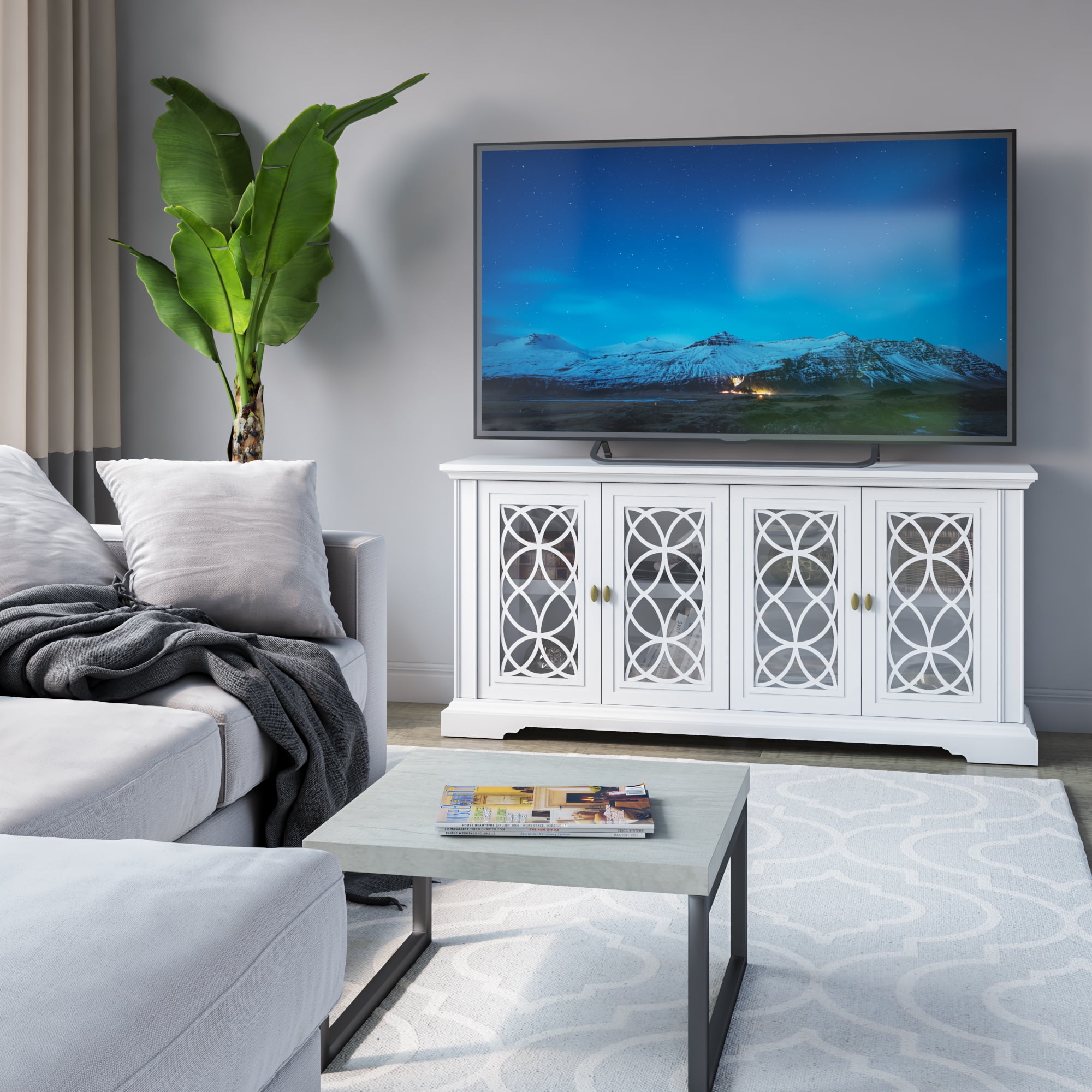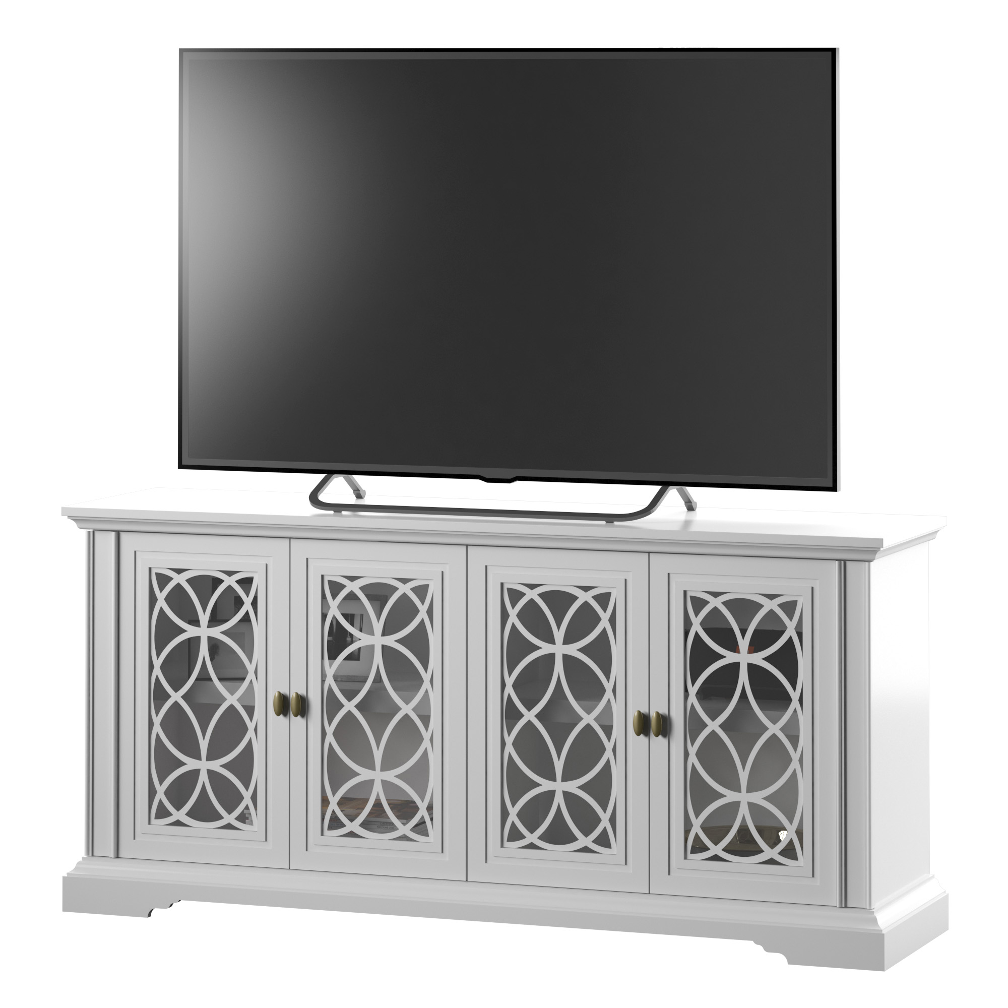 Classic style enhances any dining room or entertaining area Cabinet doors with tempered glass feature stylish screen-printed mullions Two double-door cabinets with an adjustable shelf inside each Euro hinges are hidden when doors are closed for a sleek, no-show look Pass-through cutouts on the back panel provide cord management and allow easy component storage Leveler makes it easy to achieve stable placement on uneven surfaces Versatile design allows use as a buffet table or sideboard Accommodates most flat-screen TVs up to 65″ and 60 lbs.