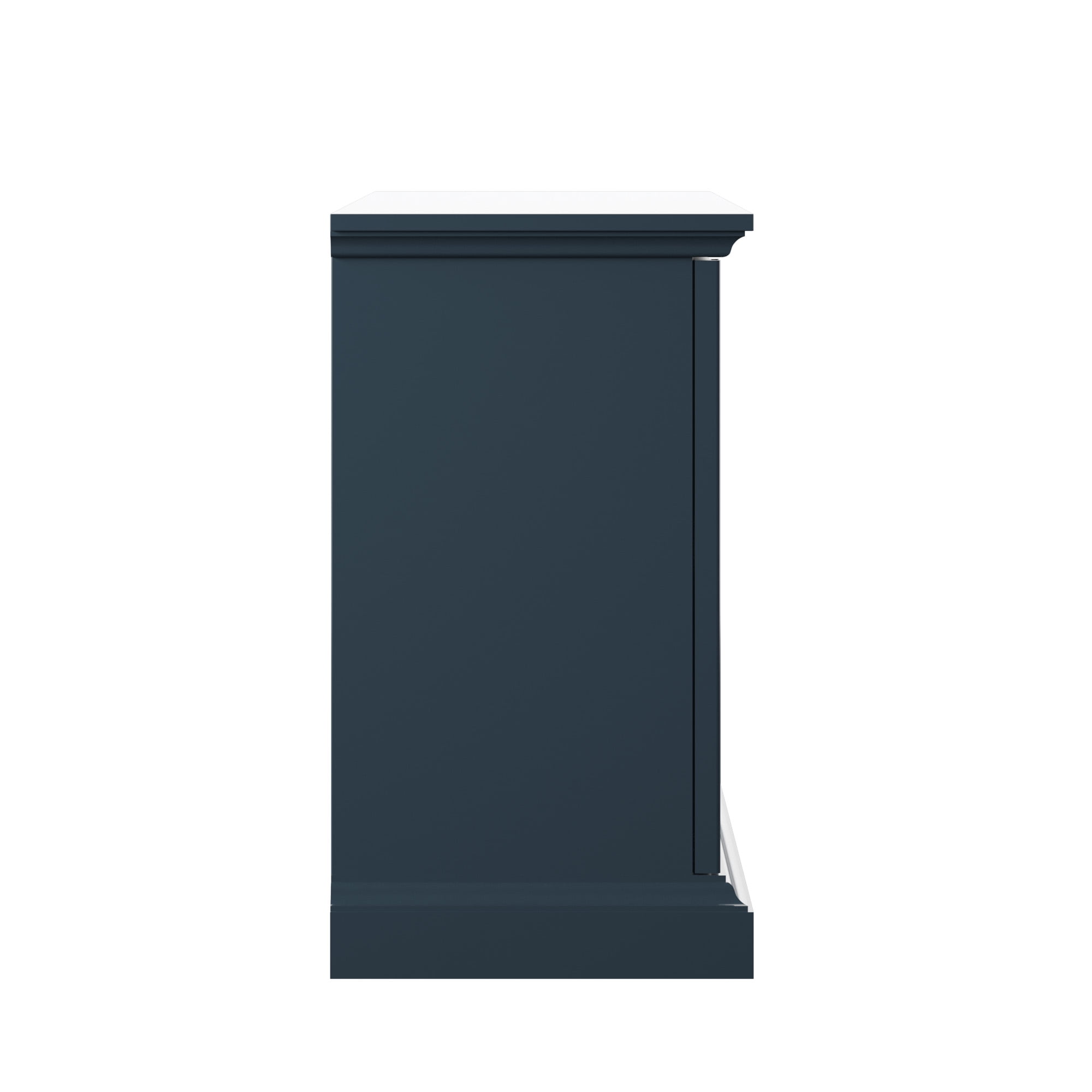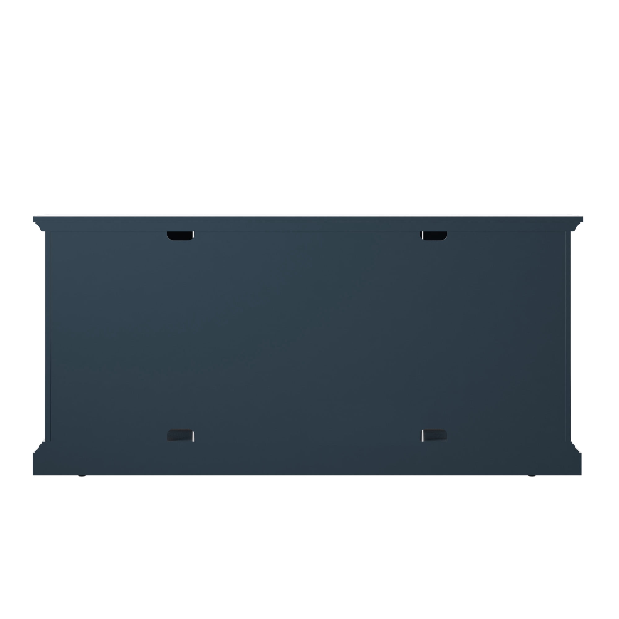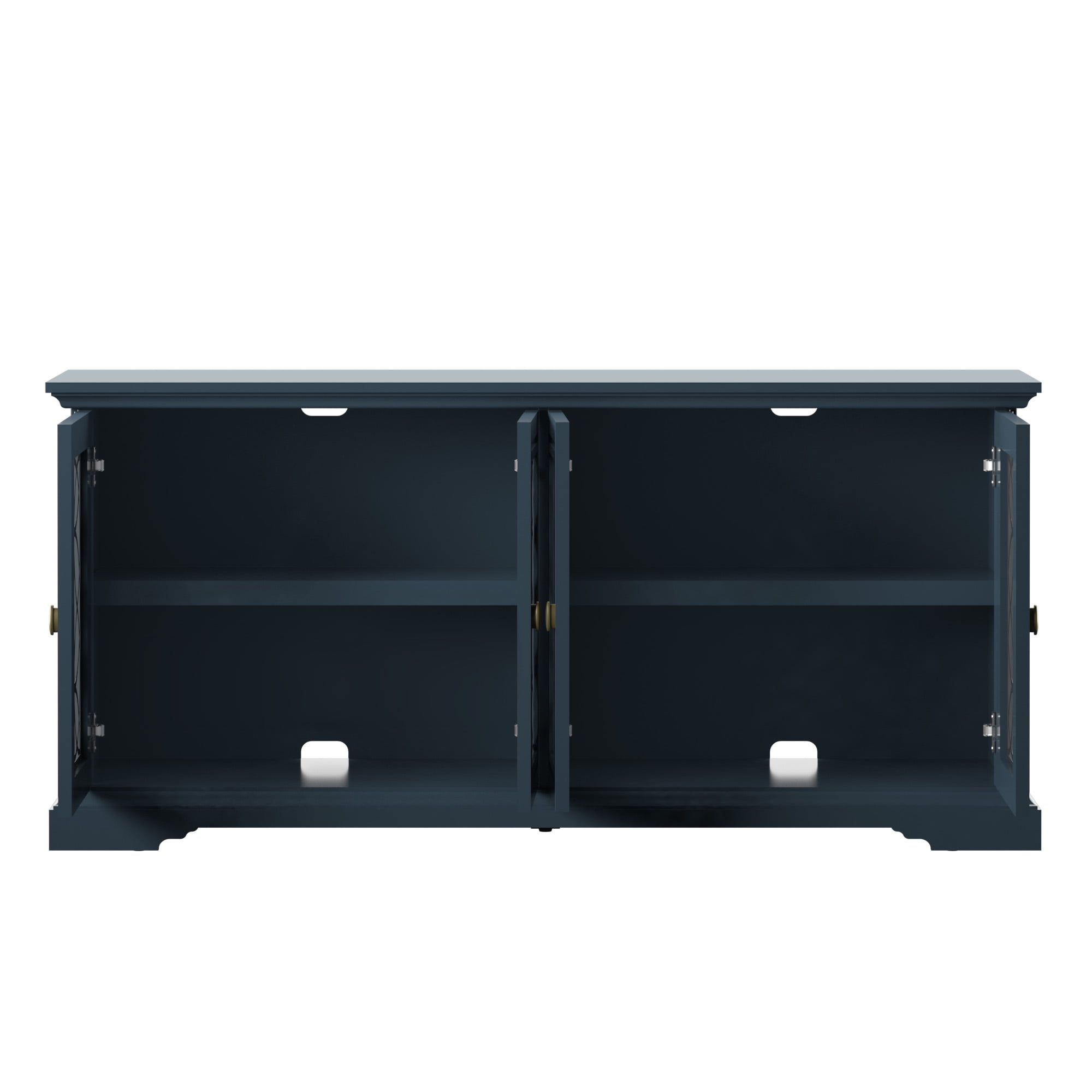 Classic style enhances any dining room or entertaining area Cabinet doors with tempered glass feature stylish screen-printed mullions Two double-door cabinets with an adjustable shelf inside each Euro hinges are hidden when doors are closed for a sleek, no-show look Pass-through cutouts on the back panel provide cord management and allow easy component storage Leveler makes it easy to achieve stable placement on uneven surfaces Versatile design allows use as a buffet table or sideboard Accommodates most flat-screen TVs up to 65″ and 60 lbs.
