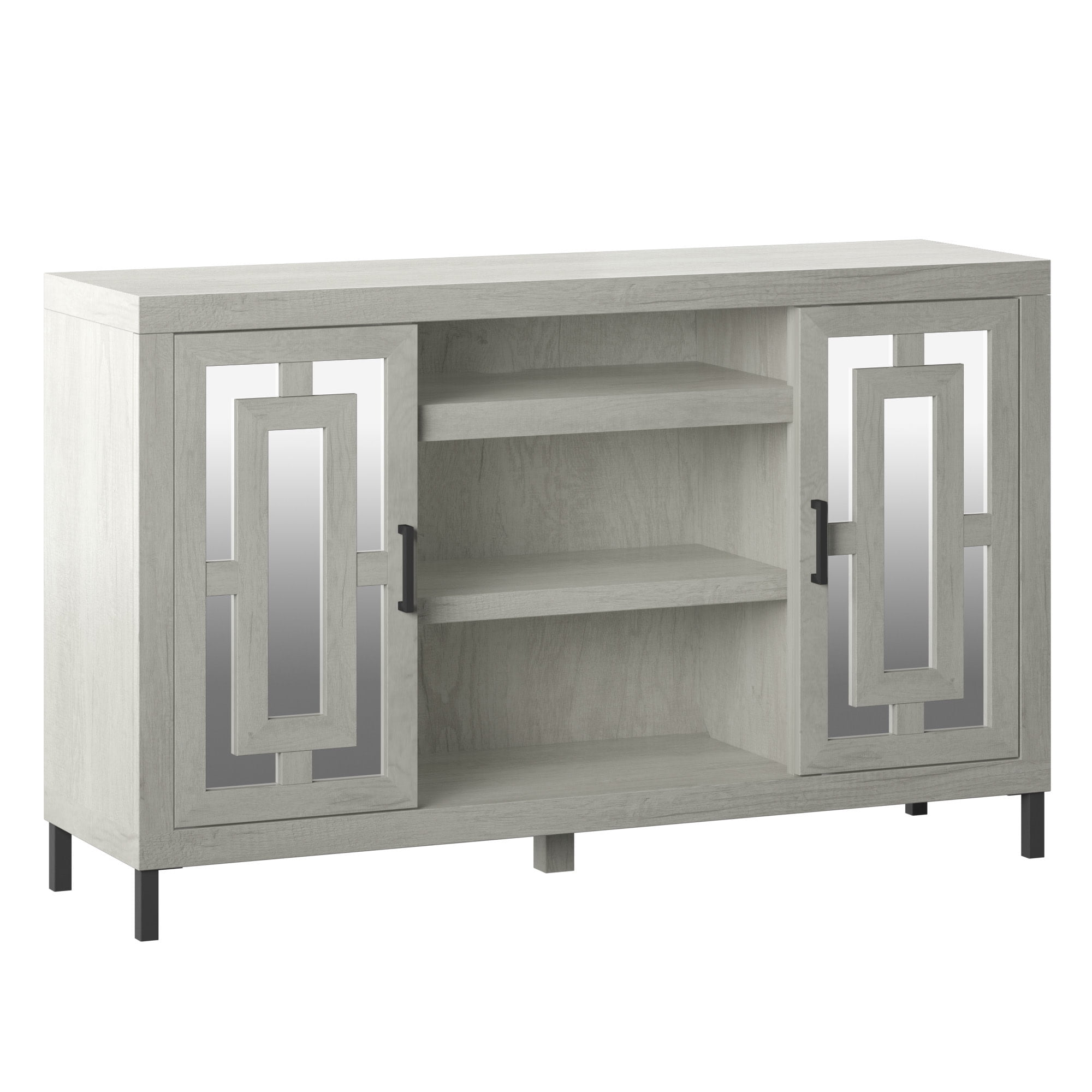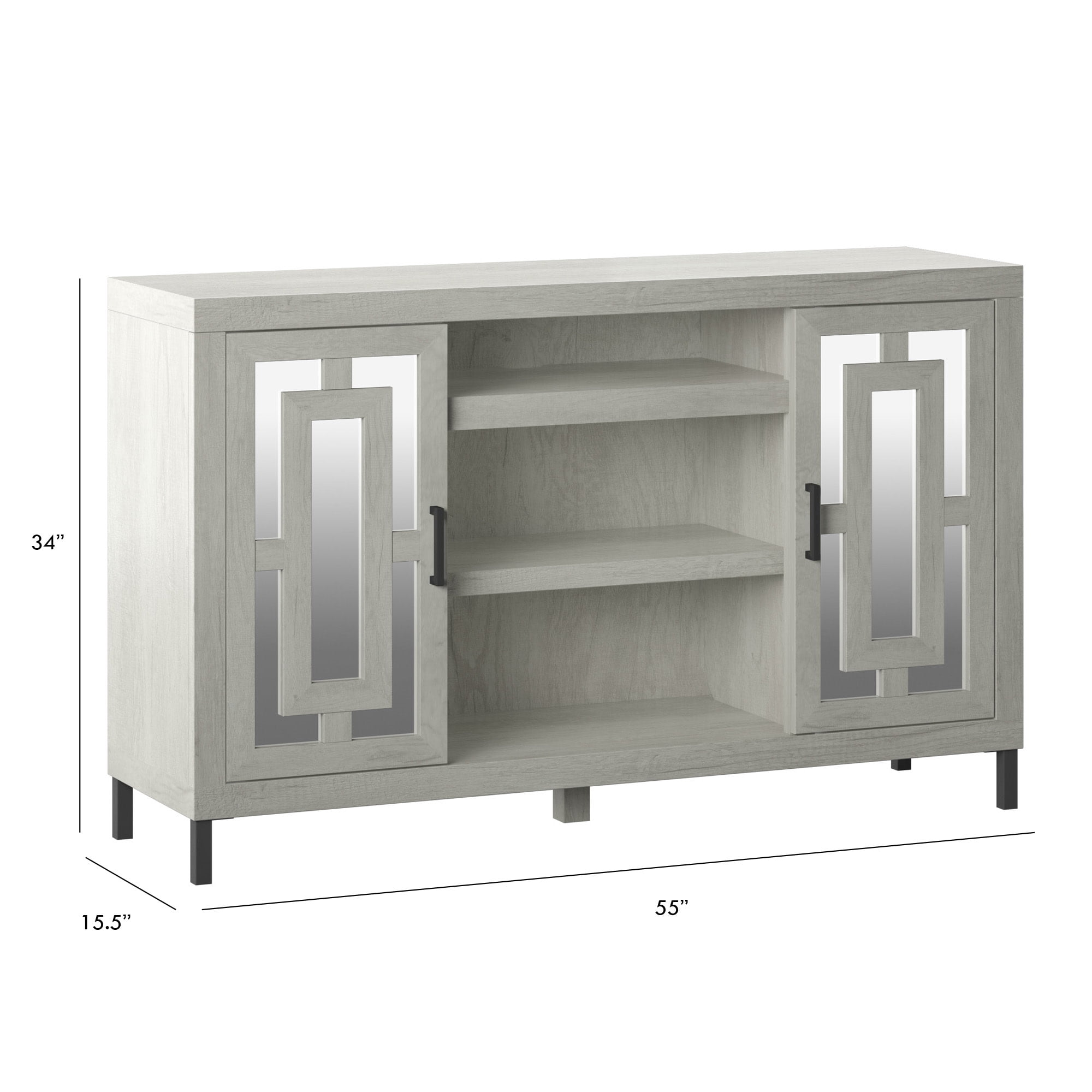 Accommodates most flat screen TVs up to 60” and up to 50 lbs. Mirrored cabinet doors with raised decorative mullions One adjustable shelf within each side cabinet, one fixed center media shelf, and one adjustable center shelf Pass-through cutouts on back panel help cord management and allow for easy component storage When purchased as a set, comes with a 23” 4,600 BTU electric fireplace insert that provides supplemental zone heating for up to 400 square feet to help you save money Flame effect can be operated with or without heat, providing the ambiance of a gentle rolling fire all year long Choose between contemporary fire crystals or a realistic log set and ember bed (both options included)