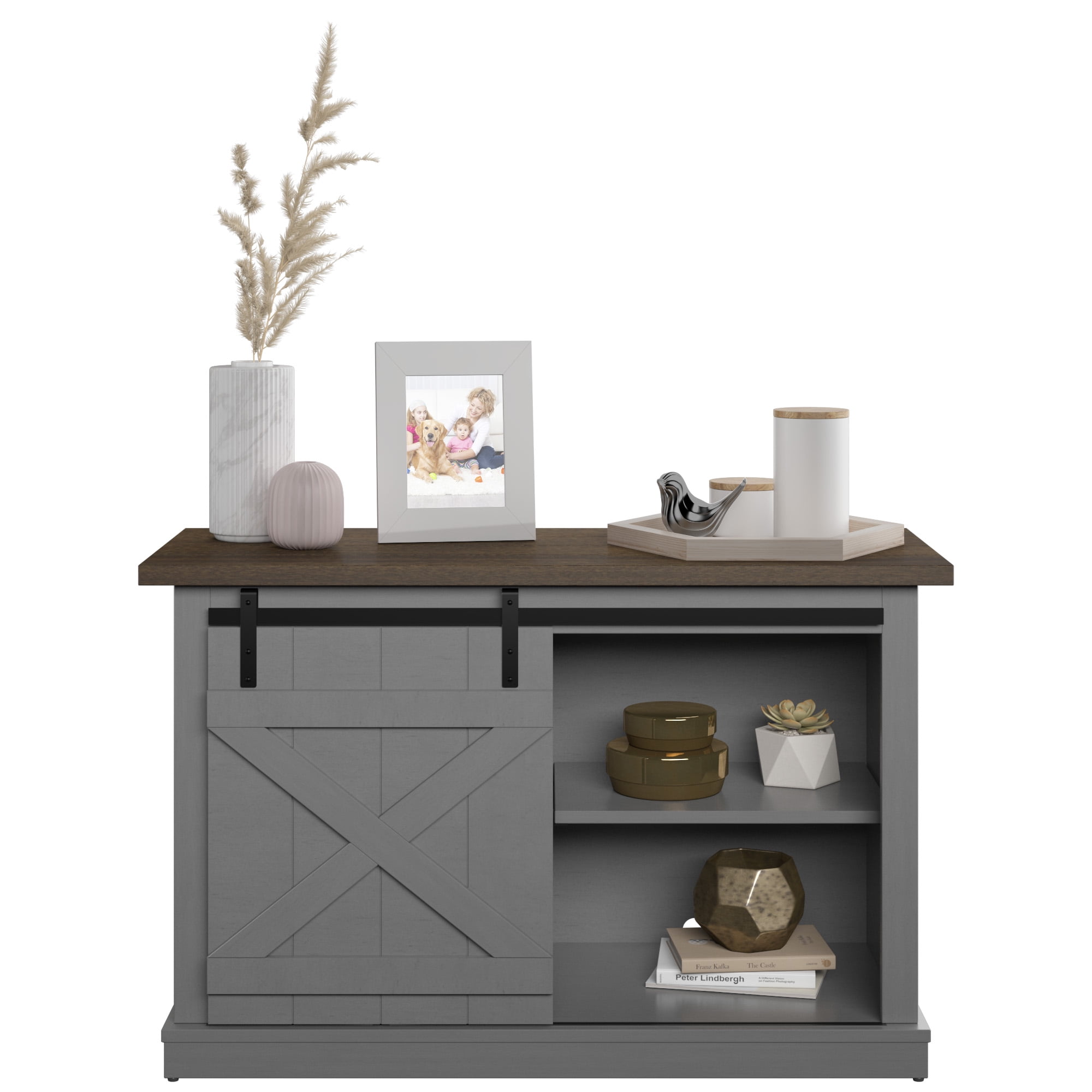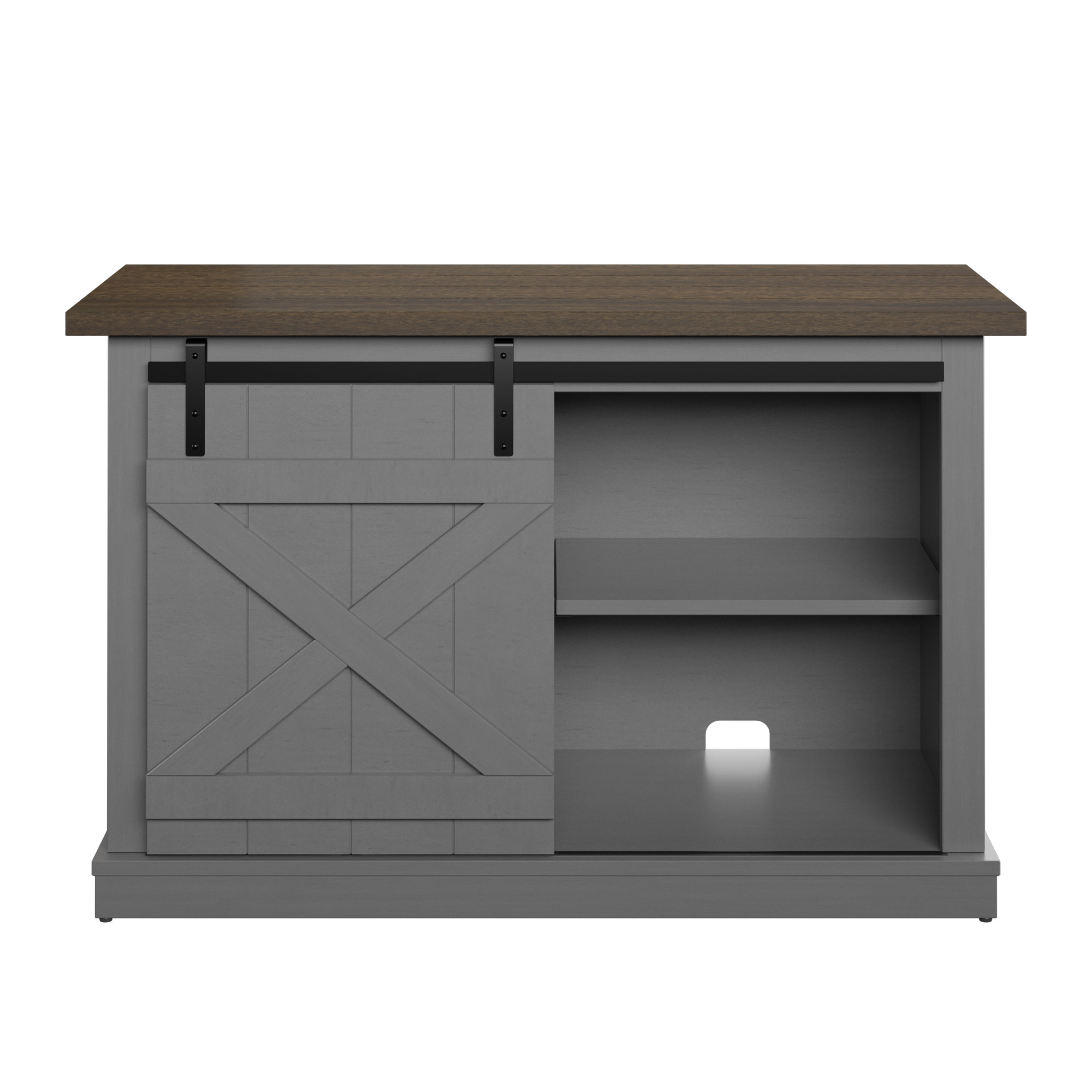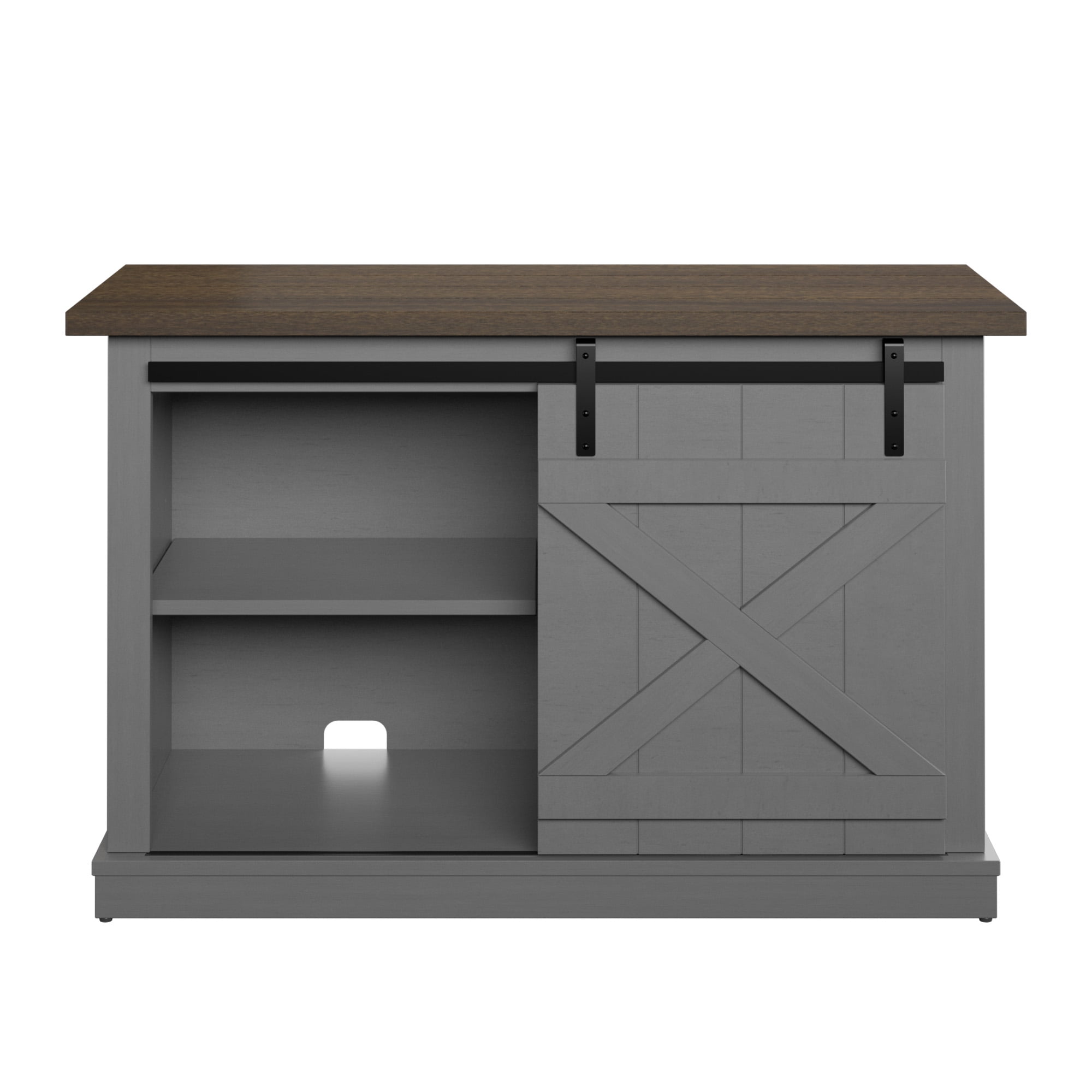 Accommodates most flat screen TVs up to 49″ and up to 35 lbs. Sliding barn door smoothly glides along metal rail hardware for one side of concealed storage One adjustable shelf on each side for customizable storage Back panel cutouts route cords and prevent tangles while providing ventilation for electronic components Multipurpose piece that can be used for added storage or displaying home decor accents in any room Planked sliding door features decorative X mullions Simple, hassle-free assembly with just a Phillips head screwdriver and easy-to-follow instructions Tip restraint hardware included