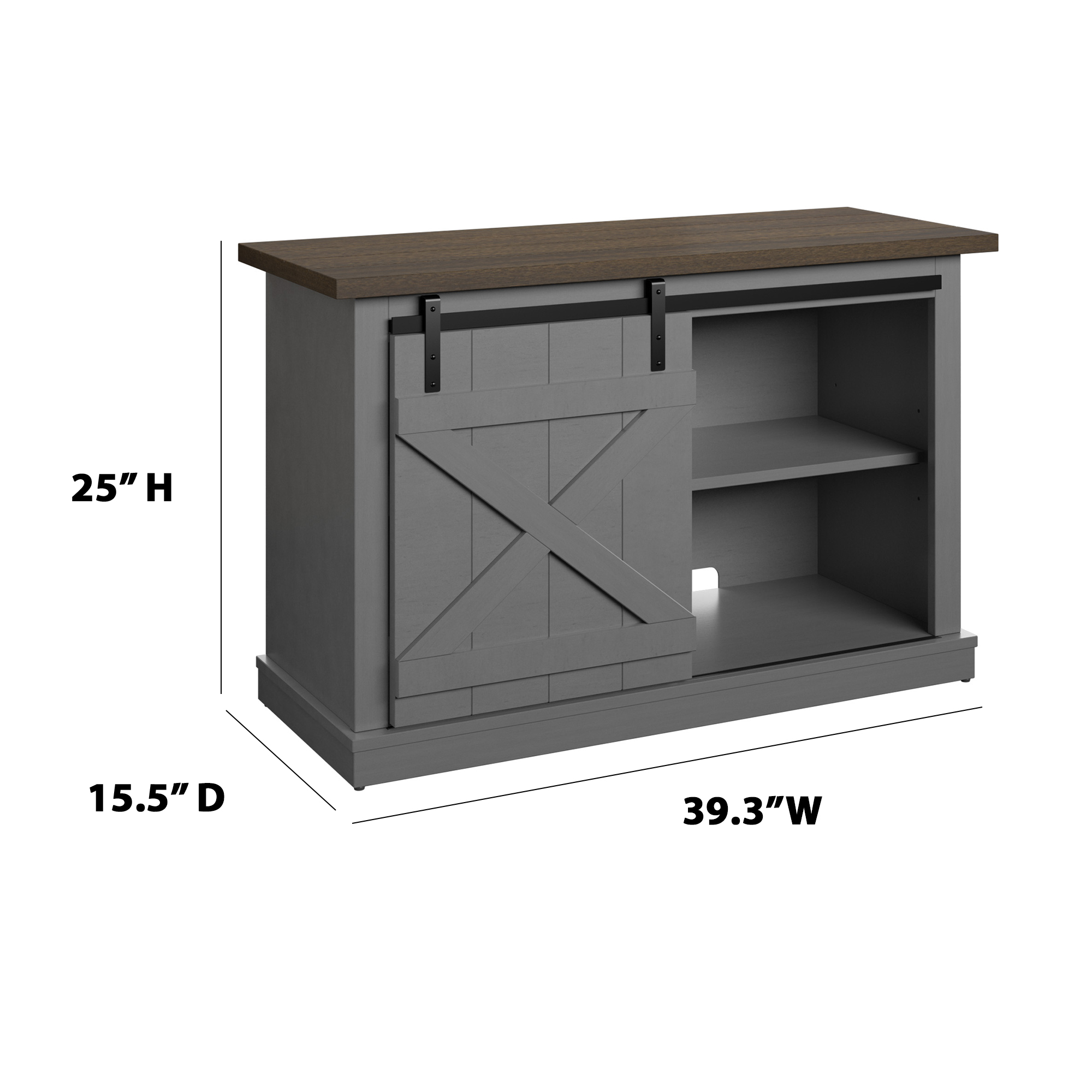 With this TV stand that can hold your flat screen TV of up to 49 inches and up to 35 pounds, you can enjoy modern farmhouse charm even in smaller living rooms. Its planked sliding barn door with rustic mullions offers modern farmhouse style that will be all your friends talk about after your next book club. Great for small space living, the sliding door glides across track hardware to save space and offer some concealed storage. Two adjustable shelves give you the freedom to customize how you store items and display home accents. To give your entire space a whole new look, get the matching coffee table, accent cabinet, side table with power, or storage bench (sold separately).