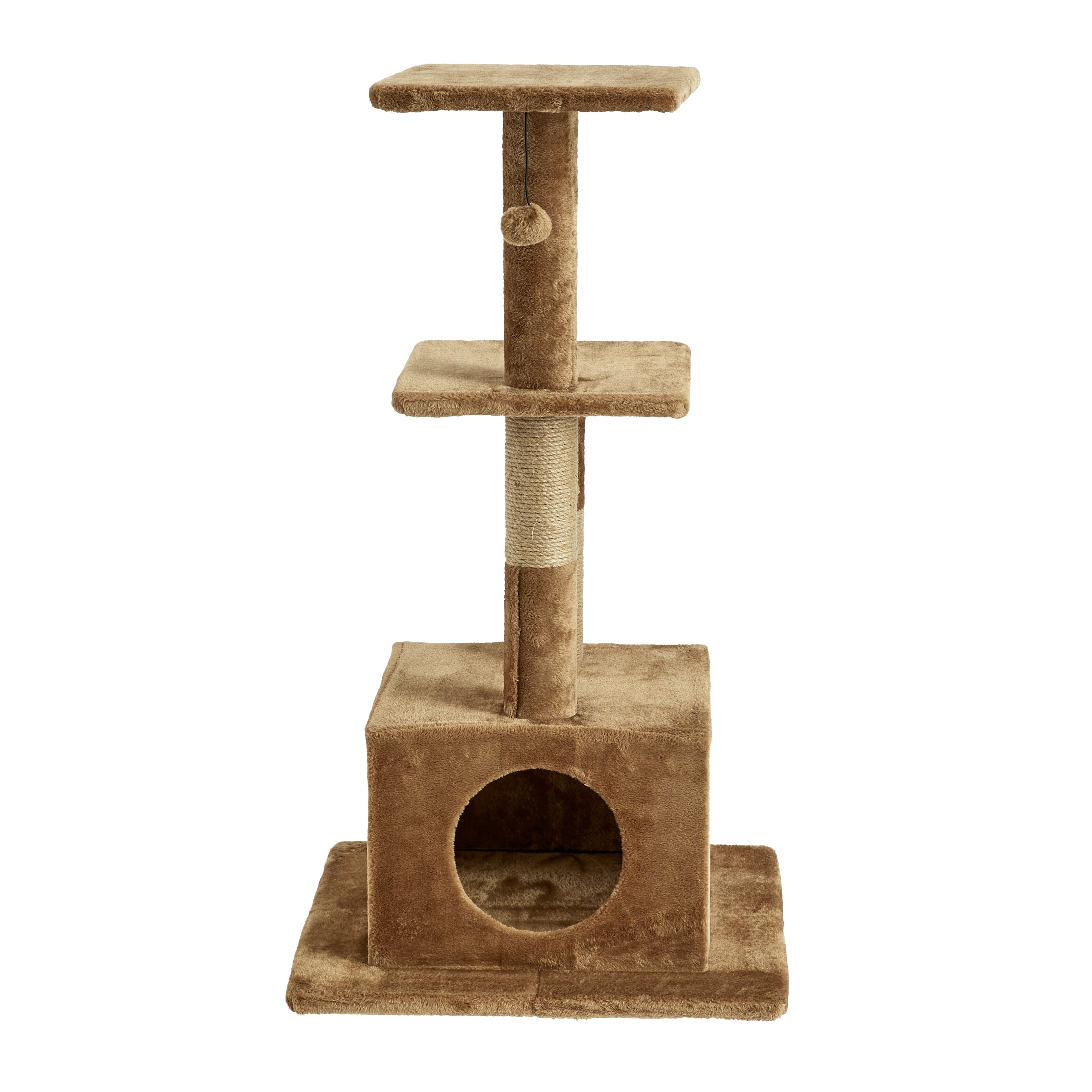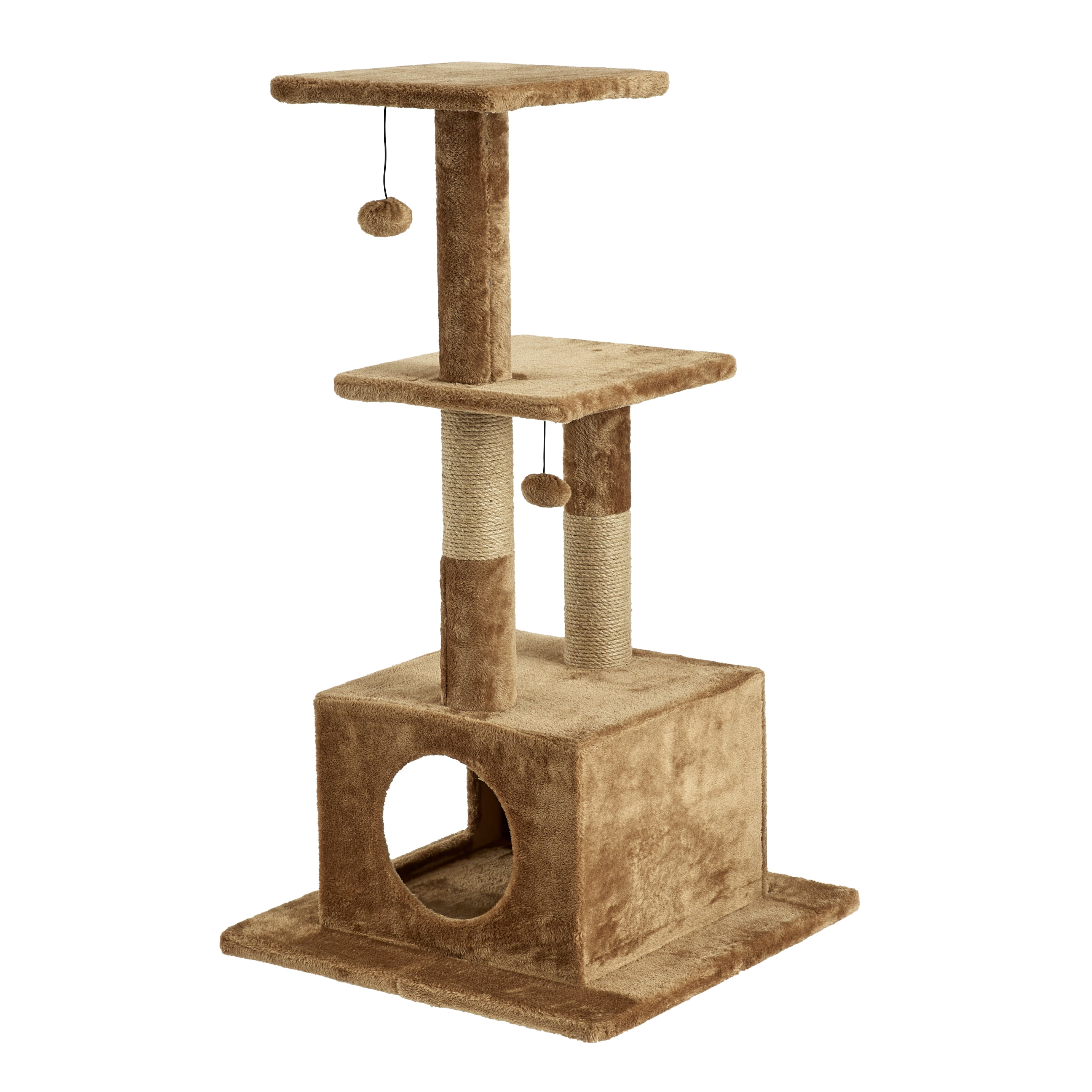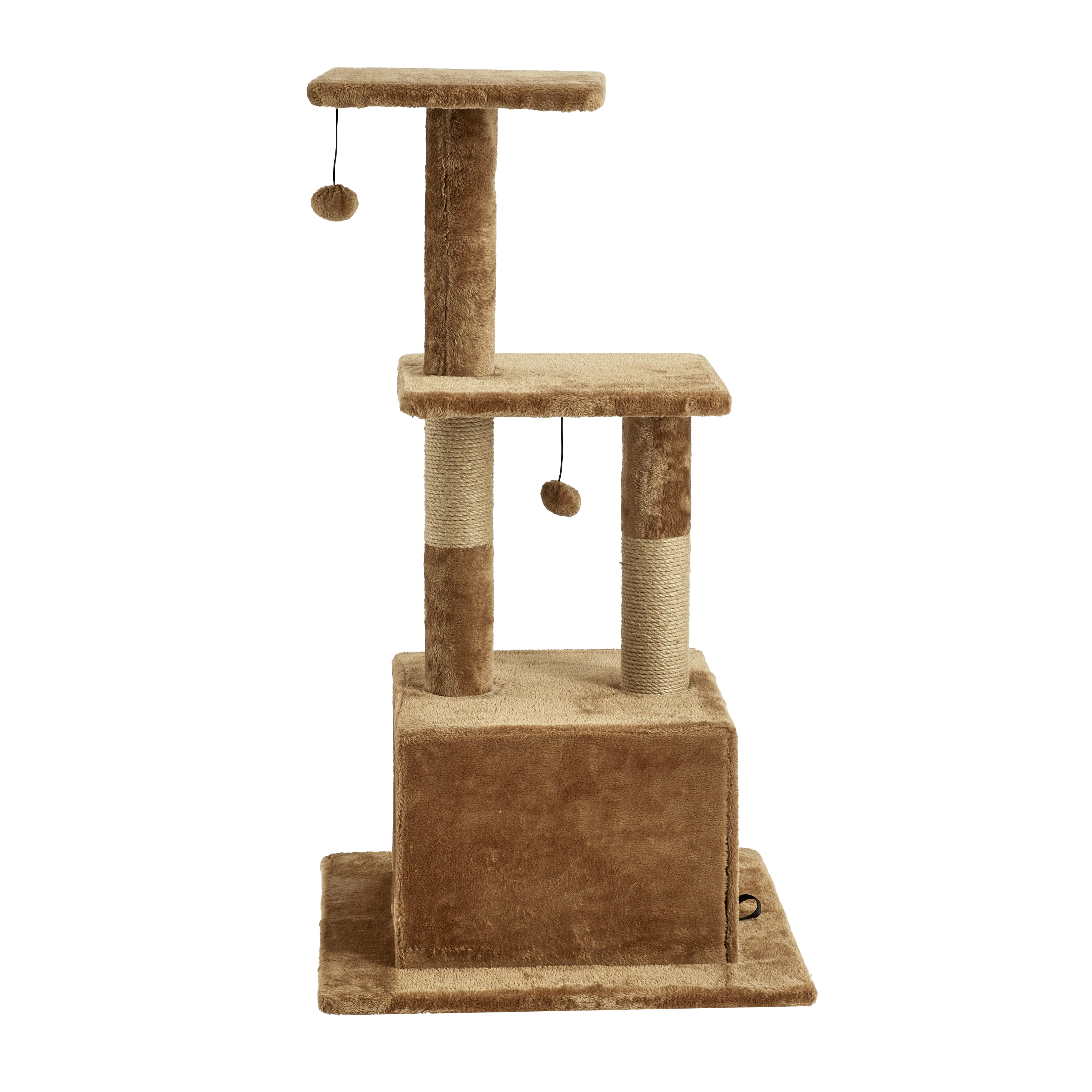 This versatile cat tree gives your cat options galore. Multiple jute-wrapped columns to scratch. Two platforms for perching. Two toys for playing. And a cozy condo for resting or sleeping. 43.7 inches tall. 23.6 inches wide. Lots of space for all kinds of cat activity. Plenty of room for multiple cats. Quick and easy assembly required. Two scratching posts Two platforms Two attached toys Attached cat condo 43.7 inches tall 23.6 inches wide Quick and easy assembly