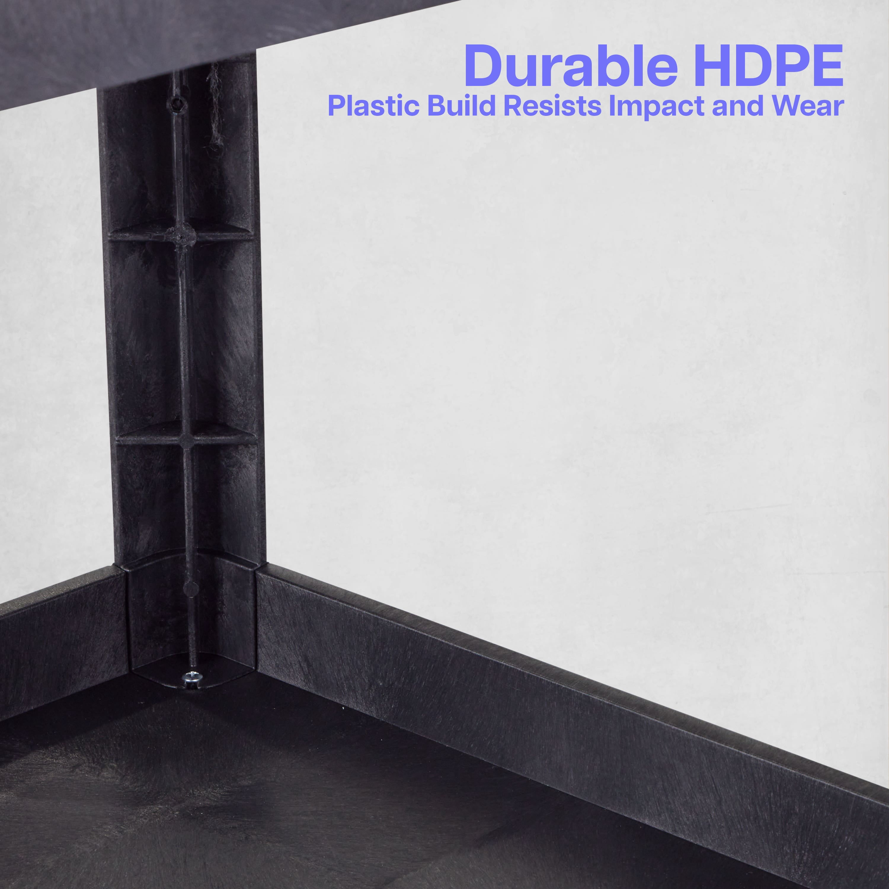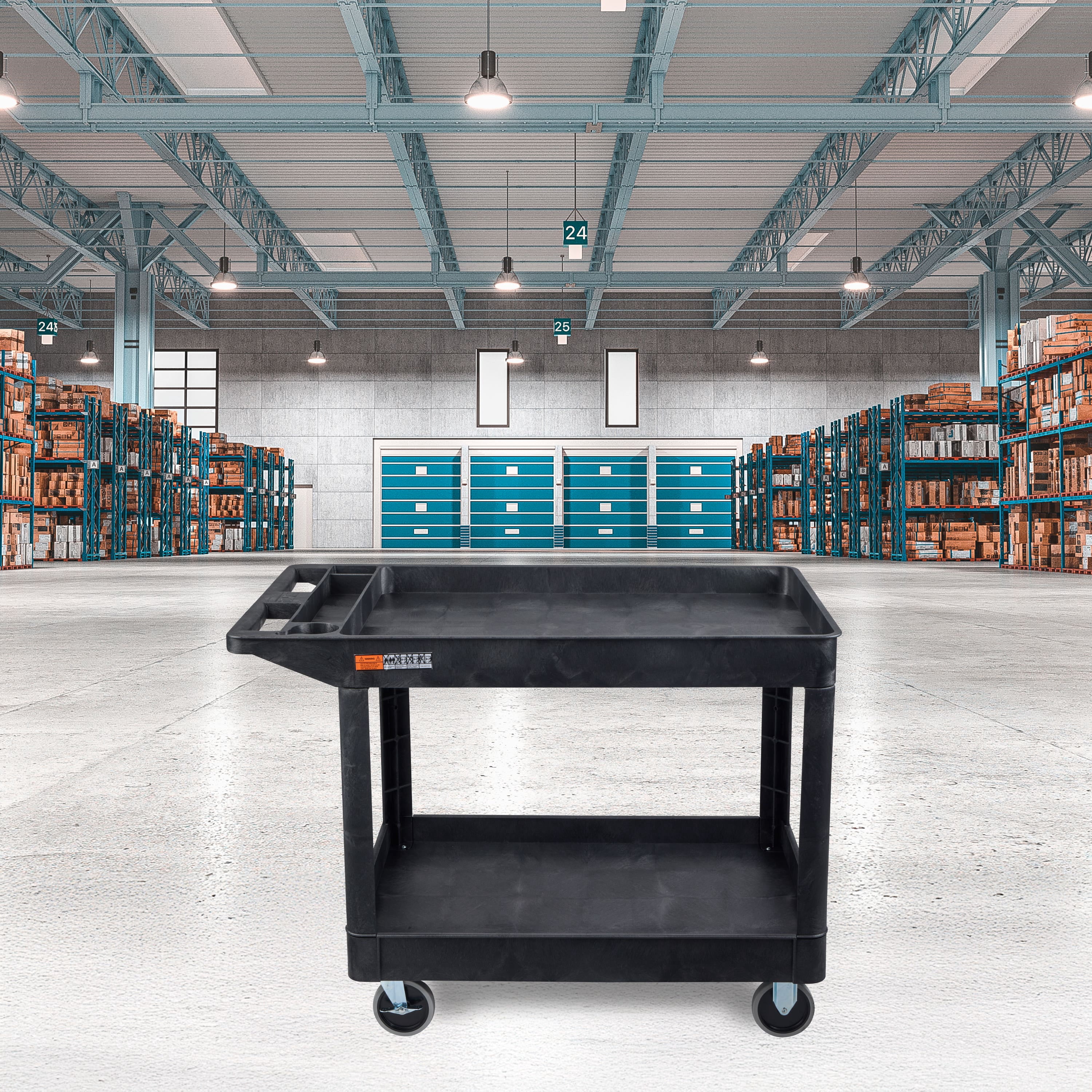 Two-Shelf Heavy-Duty Utility Cart XLC11-B The Luxor Two-Shelf Heavy Duty Utility Cart is a sturdy cart made of high-density polyethylene (HDPE), known for its incredible strength-to-density ratio, that enables this cart to hold and transfer loads up to 500 lbs. HDPE is a highly flexible, resilient material with heat resistance up to temperatures of 180 degrees, making this an unyielding utility cart that’s built to last. Both lightweight and sturdy, this rolling utility cart is ideal for restaurants, garages, offices or anywhere requiring durability and strength. FEATURES: Constructed of an injection-molded thermoplastic resin that will not stain, scratch, dent or rust 2.5″-deep tub shelves keep items secure Legs constructed as corner pieces rather than hollow legs to create maximum shelf space Built to smoothly transfer loads weighing up to 500 lbs. (evenly distributed). 5″ heavy-duty casters. Assembly required Meets ANSI/BIFMA Standards DIMENSIONS: Overall dimensions: 24.5″W x 45.5″L x 33″H Shelves: 2.5″D x 37″L x 24.5″W Clearance between shelves: 2