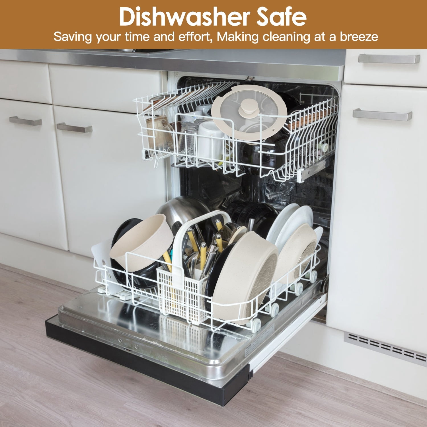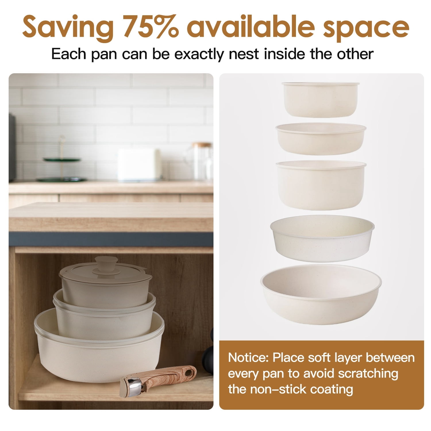 9-Piece Cookware Set: Includes 7.48″, 8.26″, and 10.62″ saucepans, 8.26″ and 10.62″ frying pans, 2 detachable handles, and 2 matching lids. All essential cookware in one package for daily cooking needs. Non-Stick Granite Coating: Advanced toxic-free coating ensures food doesn’t stick, enabling healthier cooking with less oil. Space-saving design allows pans to nest together; add a soft layer between pans to protect the coating. Detachable Handles & Versatile Lids: Detachable handles support up to 22 lbs, providing convenience and easy storage. Durable tempered glass and food-grade silicone lids fit perfectly and allow for cooking monitoring. Fast & Even Heating: Energy-efficient aluminum alloy base ensures quick and uniform heat distribution. Heat resistant up to 480℉ and dishwasher safe for effortless cleaning. Wide Compatibility: Suitable for induction, gas, electric, and ceramic stovetops. (Handles are not oven-safe.) Detachable handles allow for seamless table serving. Perfect gift for family and friends.