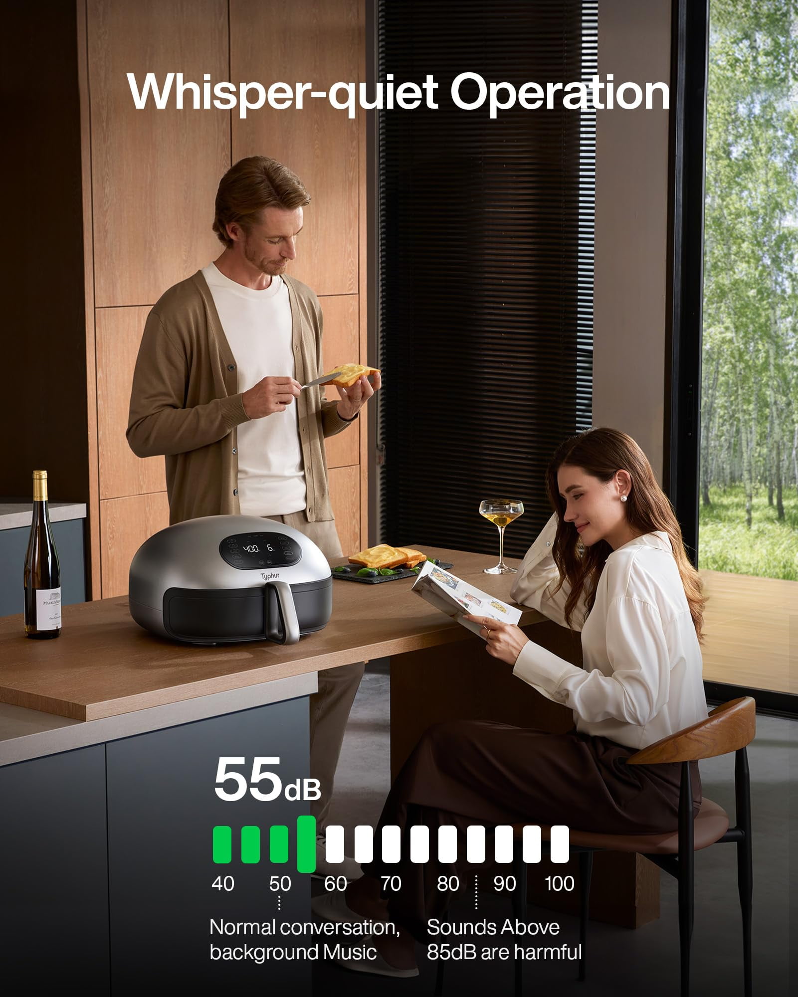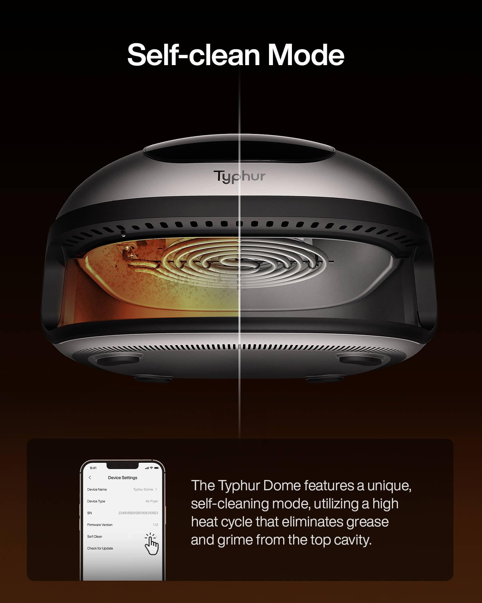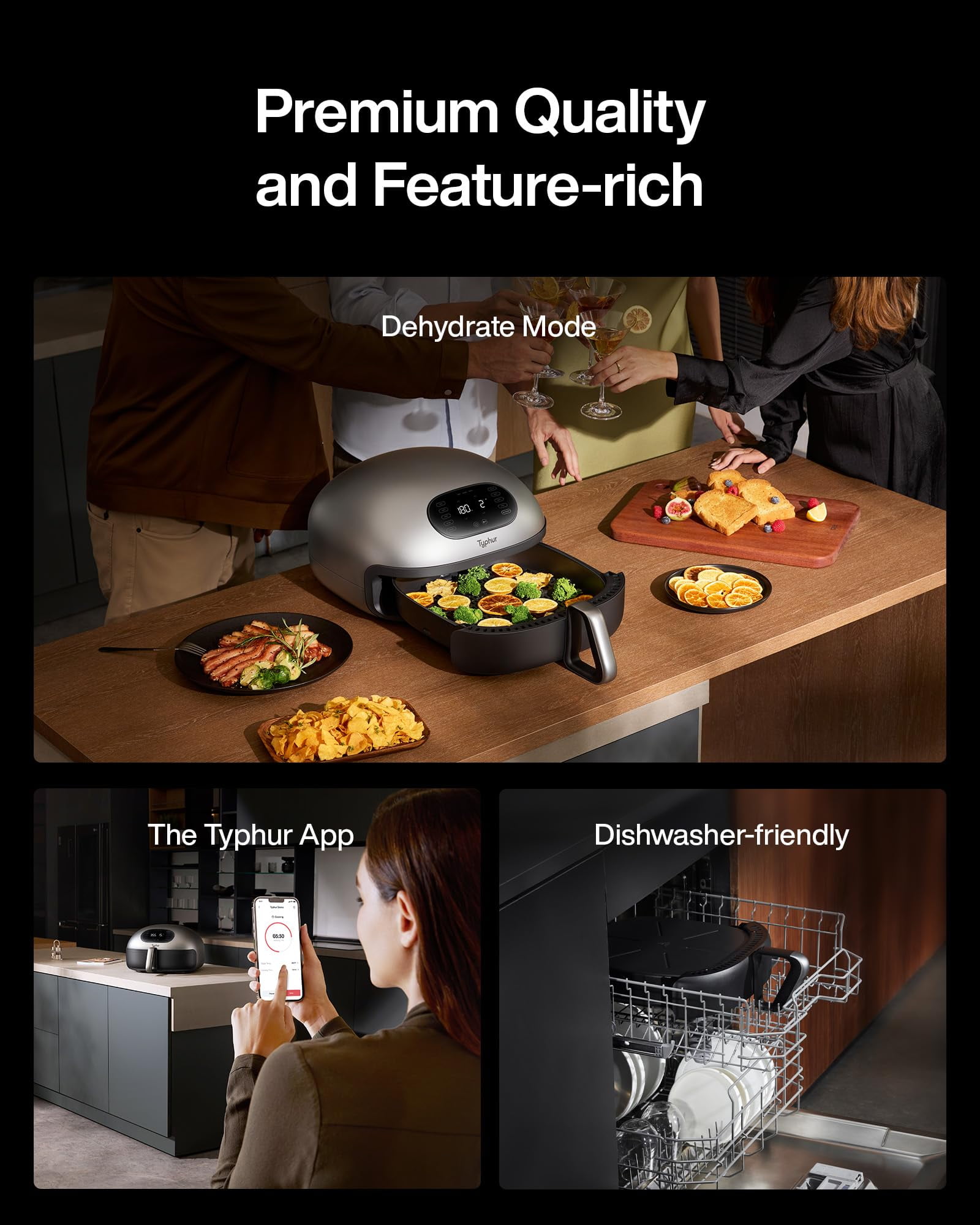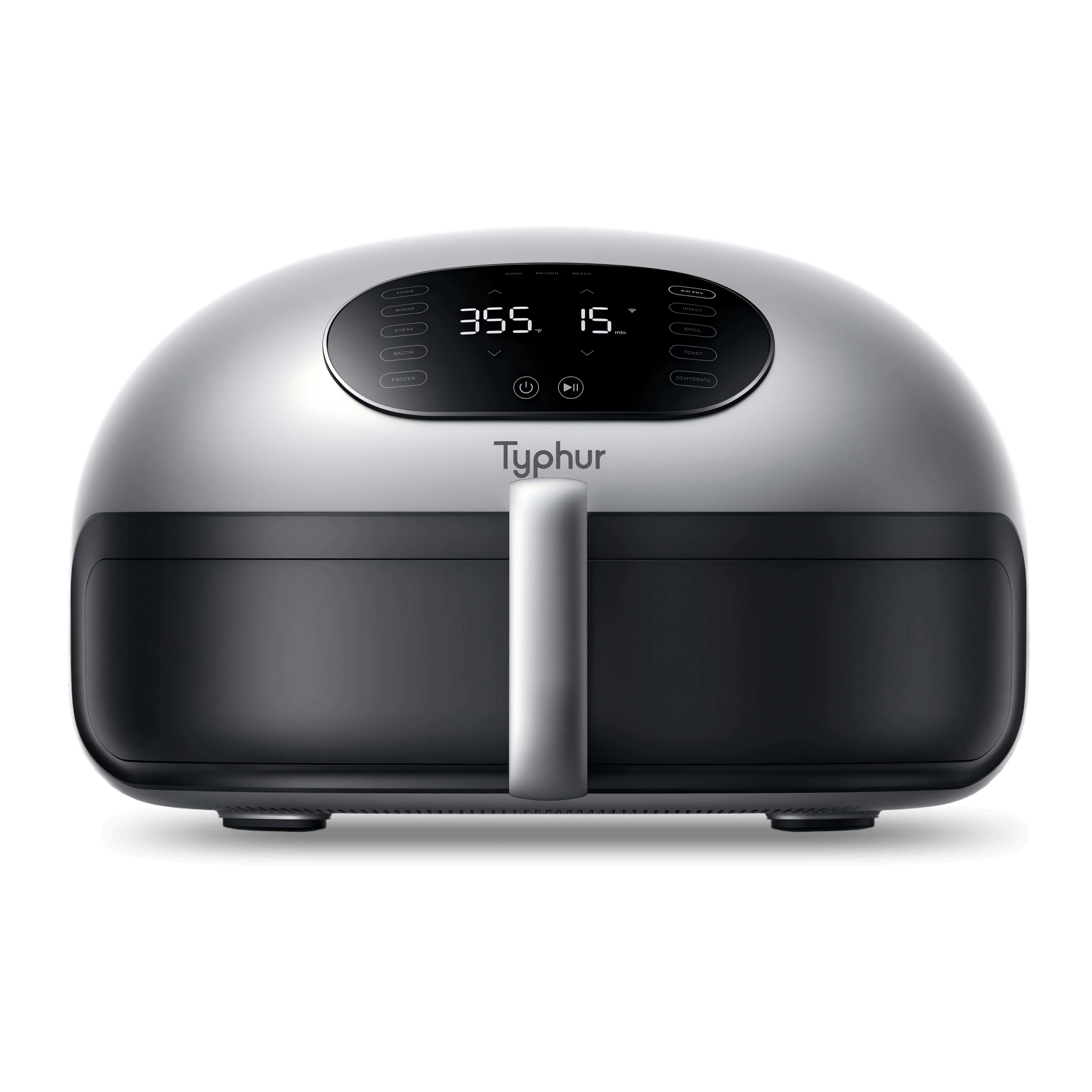 #???? ???????? ???????????????????????????? ????????????????????: Dome Air Fryer cooks food 30% faster than traditional air fryers. Cook 32 chicken wings in 14 minutes, 2 steaks in 8 minutes, or 10 pieces of bacon in 10 minutes. ????????????????????????????-???????????????????? ????????????????????????????????????: Enjoy cooking with minimal noise. The Typhur Dome is quiet, operating at 55dB. This means you can cook delicious, crispy food without having to shout over the noise. ???????????????????????? ????????????????-???????????????????????????????? ????????????????: Typhur Dome’s self-cleaning function removes oil and stains form the top cavity in 2 hours, leaving your appliance spotless. Activate on the app once a month. ???????????????????? ???????????? ????????????????-???????????????????????????????? ????????????????????????: With 10 pre-set modes, you can cook delicious food with the push of a button. The Typhur app lets you monitor and adjust your cooking settings from your phone, with pre-set modes and 50+ recipes for easy cooking. ????????????-???????????????????? ???????????????????????????? ????????????????????: Experience effortless cooking with the Typhur Dome Air Fryer’s non-stick ceramic basket coating. Enjoy the convenience of a non-stick and non-toxic surface without unnecessary details. ▶ SPECIFICATIONS: Grill Plate Area 12 x 12 in Power Supply AC 120V, 60Hz Rated Power 1750w Temperature Range 105°F~450°F Capacity 5.6 qt. Weight 20.5 lb. Dimensions (Including Handle) 19.7 x 15.7 x 9.6 in Dimensions (Not Including Handle) 15.6 x 15.6 x 9.6 in