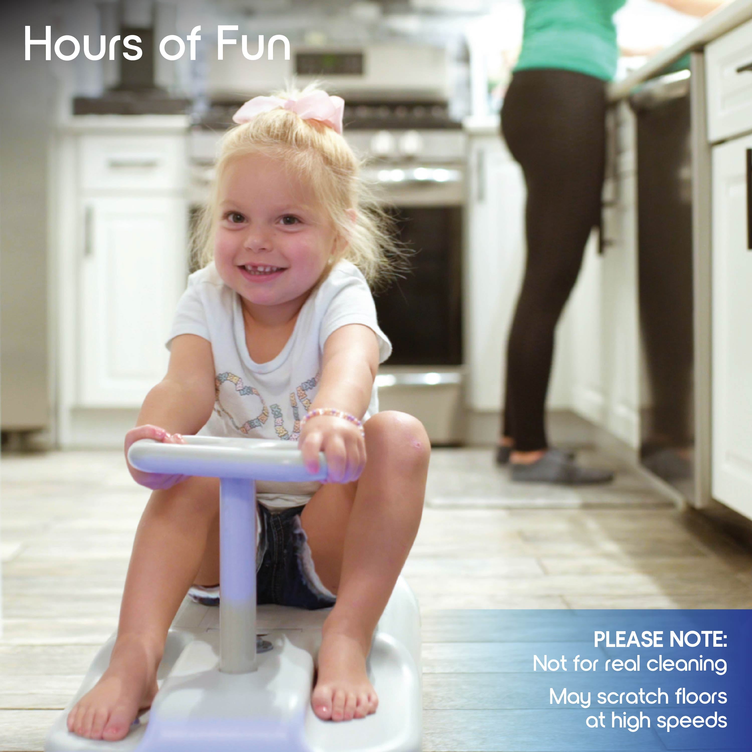27″ x 13″ x 13″ electric cart Comfortable, anti-slip seats with widened wheelbase and 360-degree steering for smooth, safe riding Adjustable speed options from 1 to 6 mph Up to 2 hours of continuous play on a single full charge Optional mop attachment for efficient cleaning while still having fun Supports kids 3+, and up to 66 lbs Includes charging cable and 20-pack of replacement dry floor cleaning pads