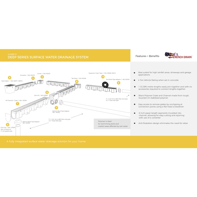 Because of their high-profile design, the Deep Series Trench Drains are perfect for high water flow areas in landscape water drainage projects. Steel grates manufactured from double dipped pressed galvanized steel. Not recommended for areas of salt, salted snow, salt, or chlorinated swimming pools. Applications include – Driveways, patios, walkways, or high-end landscaped yard areas adjacent to homes or at the bottom of sloped areas; Trench Drains provide flexible drainage solutions. Commercial water drainage systems allow safe and efficient drainage for office buildings, property, or factory interiors and pedestrian traffic areas. The Trench Drain is visually appealing due to its sleek, yet sturdy, construction and adds an aesthetic touch to its surroundings. Available accessories, 90° corners, T pieces, Slim Pits, end caps, adaptor pieces, convertor pieces and storm water catch basins.