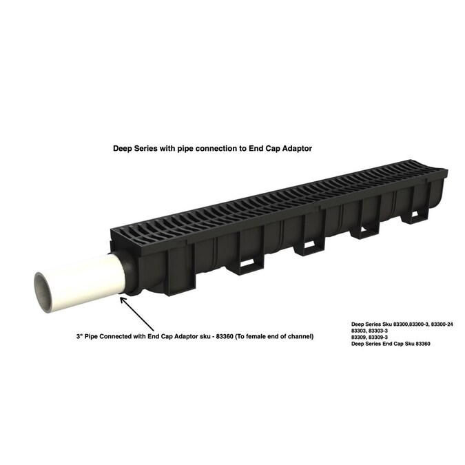 - Built in bottom outlets at one end of the trench drain to easily connect 3 in sewer and drain pipe, or, installing end cap adapter in reverse and honing out the internal section to connect to 3 in pipe