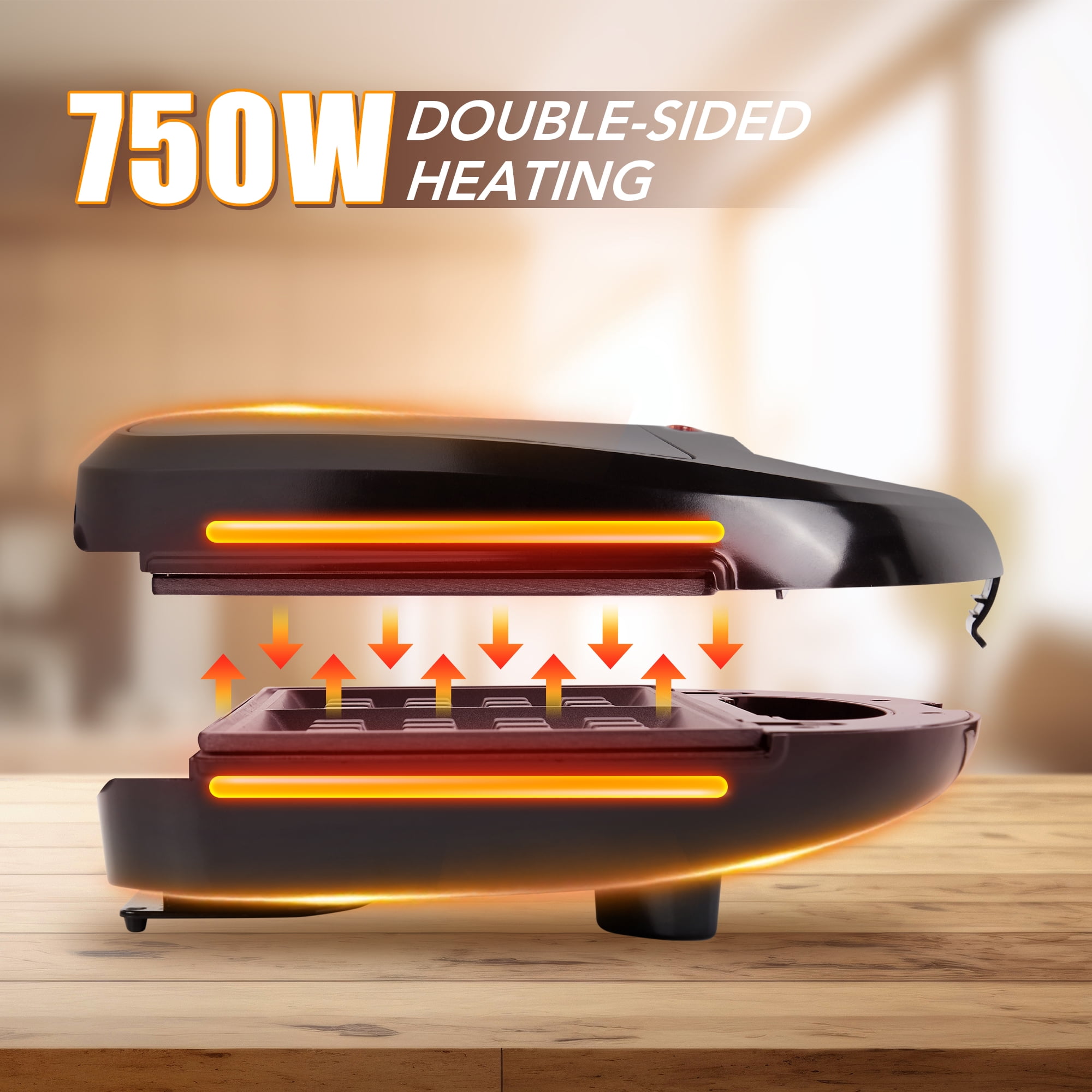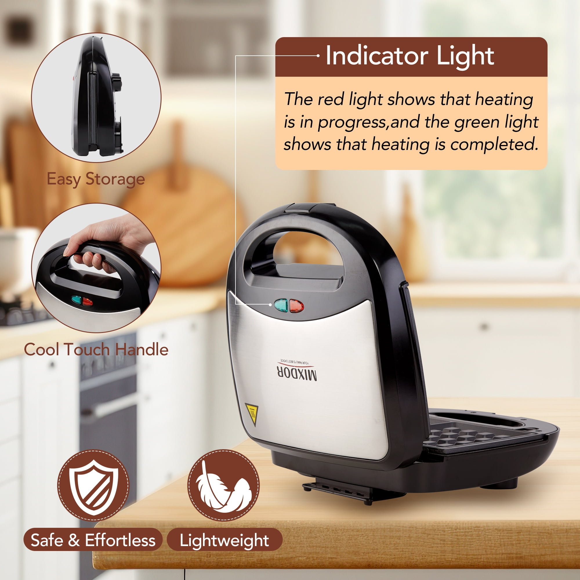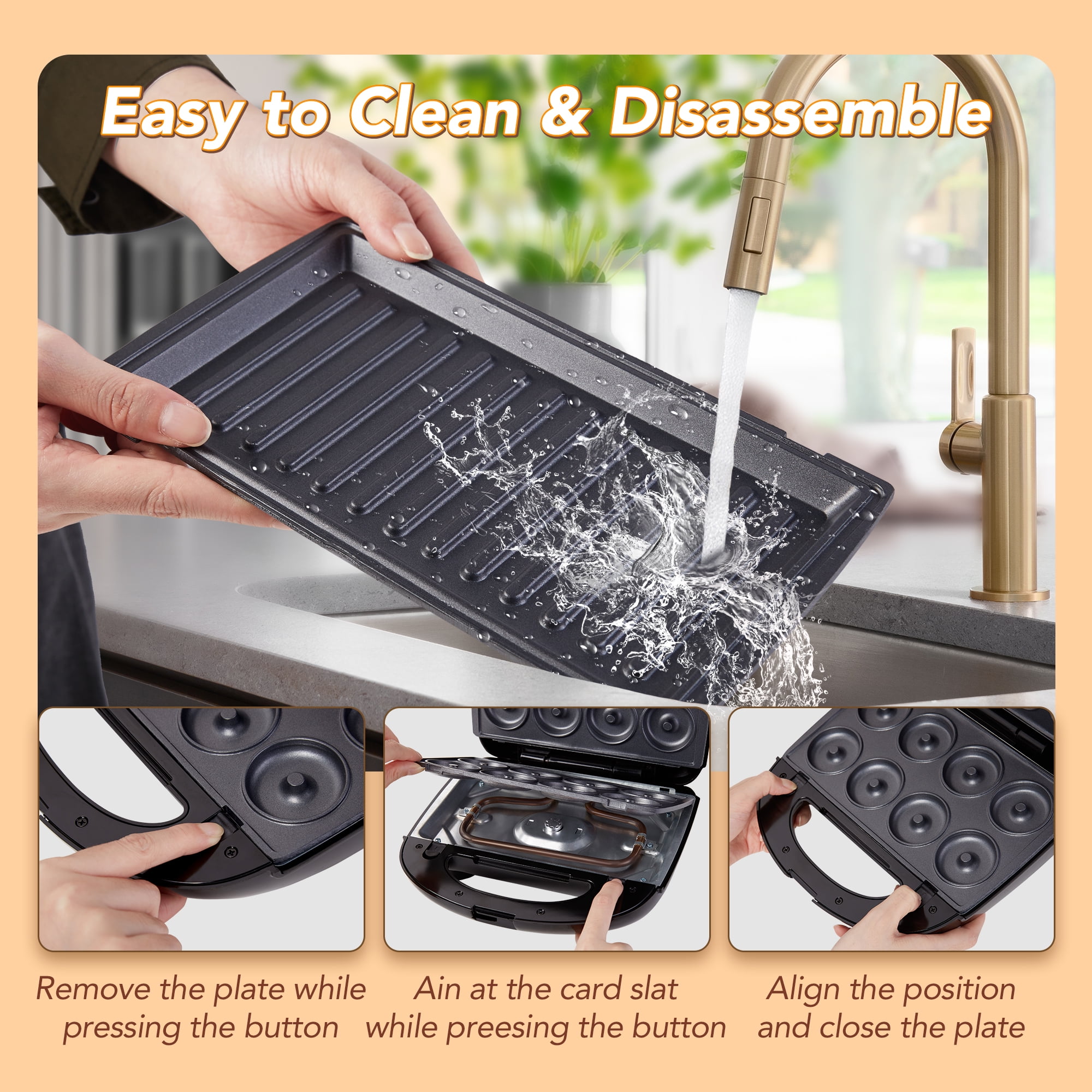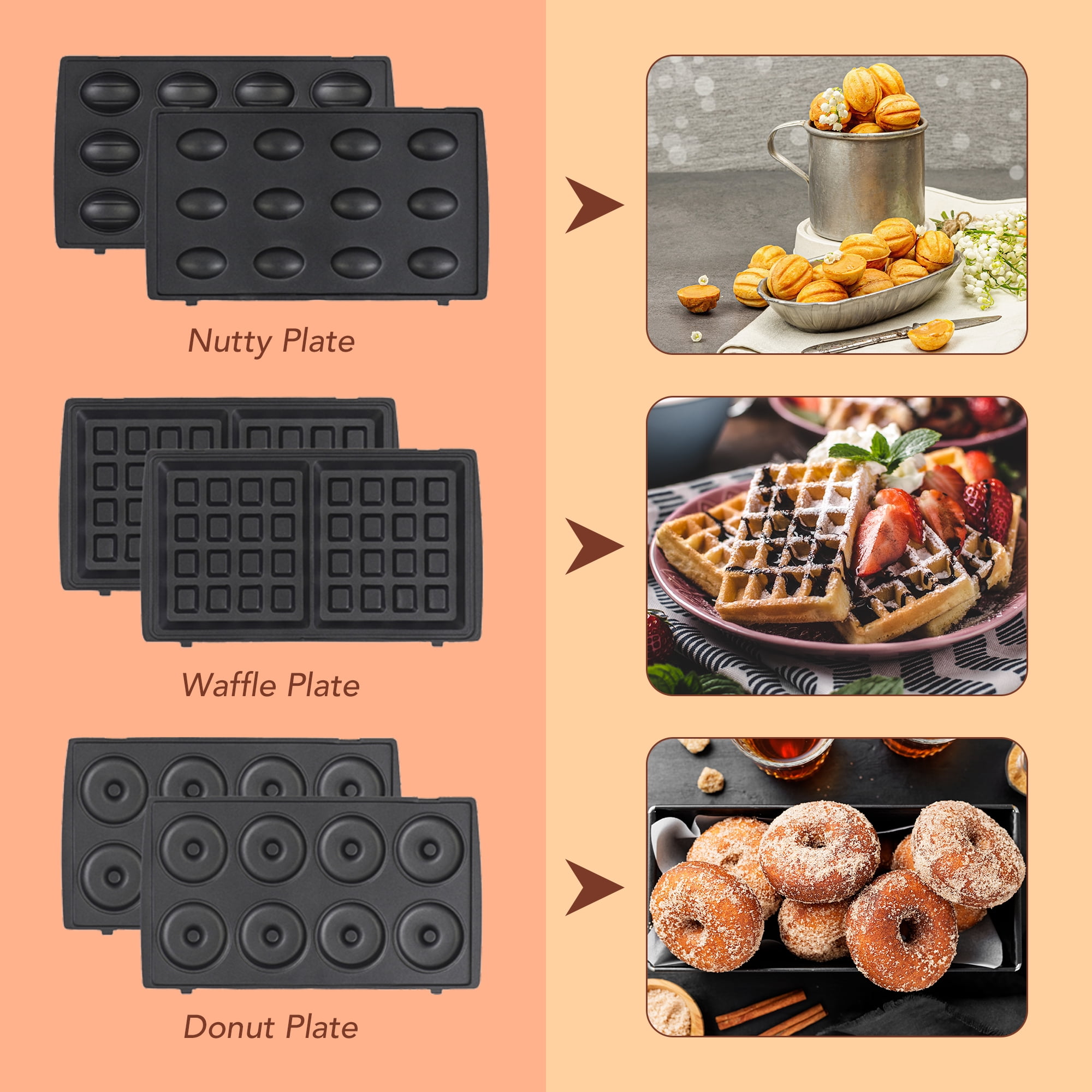 Maximize Your Culinary Creativity:Unleash your kitchen potential with 6 detachable plates for sandwiches, waffles, donuts, paninis, nuts, and madeleines. Save space, money, and elevate your cooking versatility. Effortless Cleanup, Endless Convenience:All plates feature a non-stick coating, ensuring easy cleaning after crafting your favorite treats. Removable plates make cleanup a breeze, enhancing convenience for busy kitchen enthusiasts. Safety First, Always Assured:Embrace worry-free cooking with a stainless steel shell, non-slip feet, and a cool-touch locking handle. The automatic temperature control system prevents burning, ensuring safe operation. The power indicator and preheat light add an extra layer of safety awareness. Crispy Delights Every Time:Experience superior heating efficiency with our double-sided temperature control system. Your creations will be irresistibly crispy, setting our sandwich maker apart from the rest. Elevate your meals with a delightful crunch. Compact Marvel for Any Kitchen:Embrace portability and convenience with our compact 6-in-1 sandwich maker. Perfectly sized at 10 * 12.5 * 6 inches, it’s ideal for dorm rooms, small apartments, and kitchens of any size. A stylish addition to your countertop, it stands upright for minimal cabinet space usage. Upgrade your kitchen setup effortlessly.