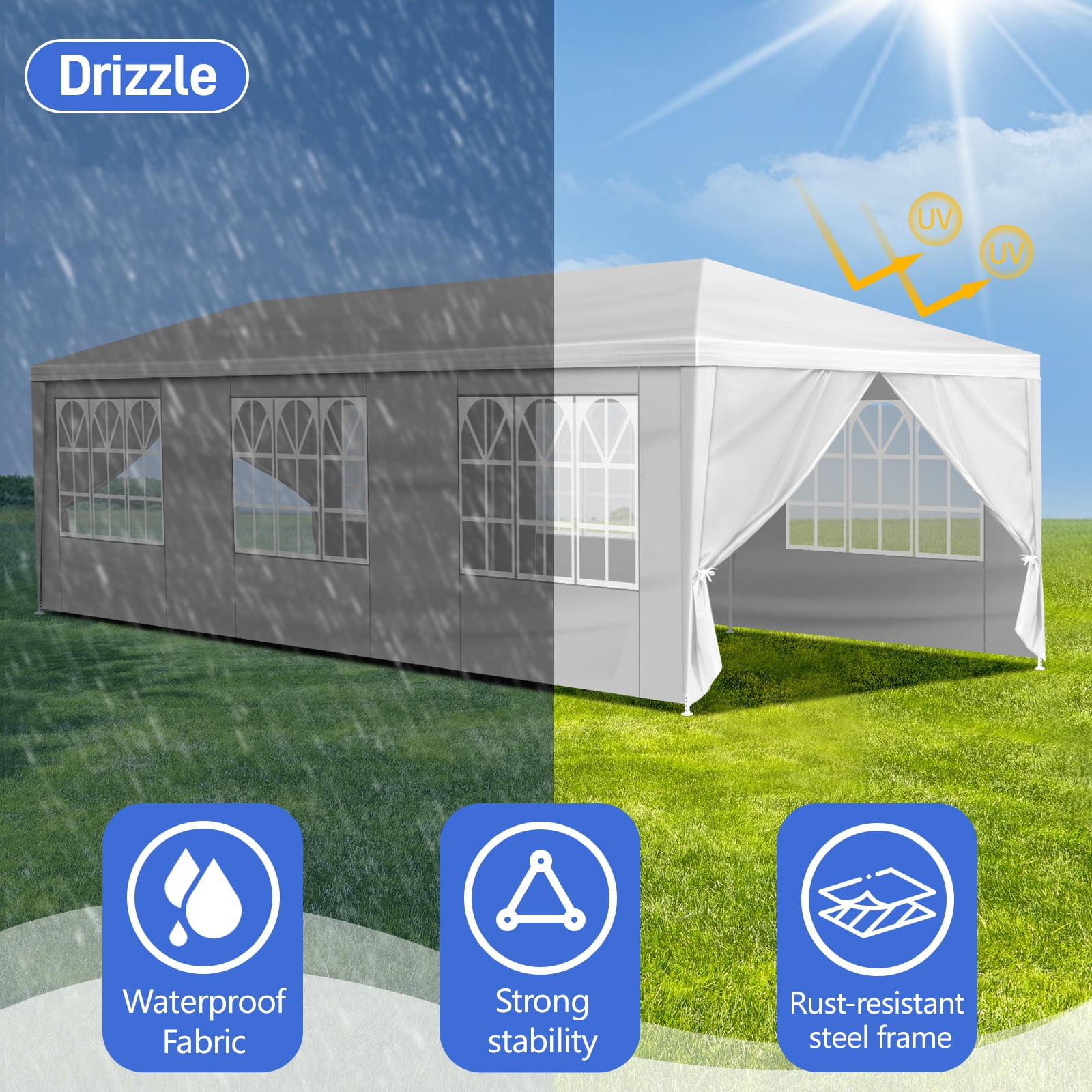Features: WELL-VENTILATED: Removable sidewalls for cross ventilation and venting on hot days. The other removable sidewalls could also be wind tight once the weather is suddenly changed. Also 2 zip-up doorways could be adjusted by you easily. And big transparent PVC church window on each sidewall could bring you unforgettable sunshine falling down on your face. MULTIFUNCTIONAL TENT : This party tent is ideal for any outdoor events, such as shows, weddings, parties, barbecues. You can also install it in your backyard as a large, lovely sunshade retreat for your family and guests. Also can be used as a temporary garage for extra storage. You can store your car, garden furniture, or tools. SOLID STRUCTURE : The frame is made of painted steel which is rust-resistant and lightweight. The roof and the removable side panels are made of polyethylene tarp, which is tear-proof, waterproof . This party tent will guarantee you years of quality service. Please be reassured to buy it. Specifications: 1. Material: Iron Tube & PE Cloth 2. Color: White 4. Top Cloth Material: 90G/M2 PE 5. Dimensions: (118.11 x 354.3)” / (300 x 900)cm(L x W) 6. Weight: 41lbs / 19 kg 7. Waterproof: Yes 8. Door Quantity: 2 9. Tent Structure: Single Tent 10. Suitable for: Household, Wedding, Party, Parking Shed Package Includes: 1 x Tent 1 x User’s Manual
