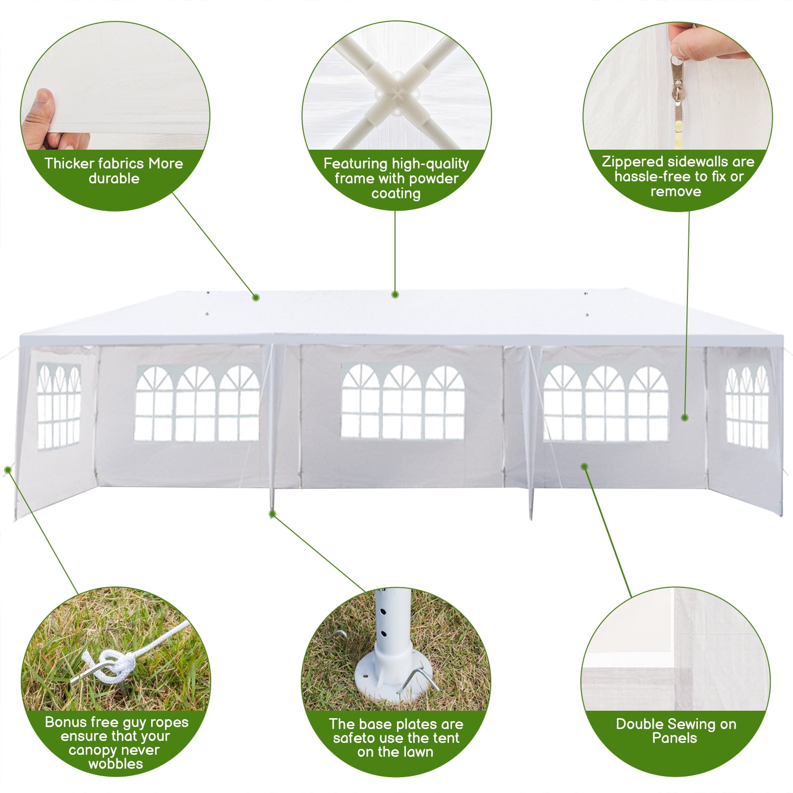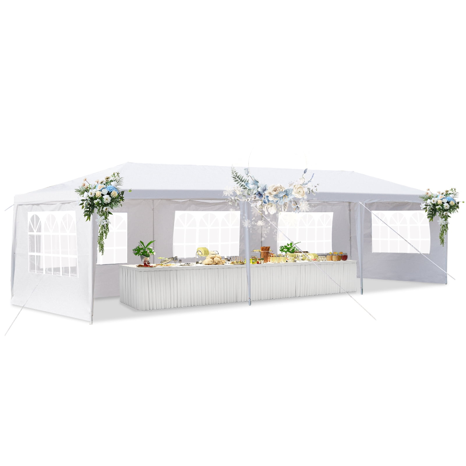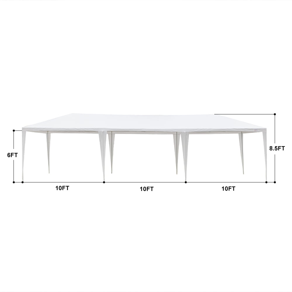Features: EASY TO ASSEMBLE : The party tent is easy to?assemble. You’d better to have an assistant to help, no additional tools of the canopy tent are required, just keep the frame steady when assemble the wedding tent steel tube and cover. MULTIPLE USAGE : The party tent is perfect for wedding, party, meeting, camping and so on. And you can used the wedding tent for backyard barbecue with your friends, or the canopy tent is the best choice for your birthday party as well. BIG SIZE : The party tent size is 10 x 30 x 8.5ft (LxWxH) ;made with 5 sides walls with window provide the canopy tent more shade. The wedding tent can hold up to an estimated 50 people for dining or party. ATTENTATION: We advise customers to never leave canopy tent up overnight or under bad weather conditions. We will not be responsible for such weather damages. It is up to customers decision to determine the correct weather condition when you choose the party tent. Warning: Polyethylene Fabric of party tent is not fire proof, pls be away from sources of fire. Please assemble the tent with you your friend or who can help. UBesGoo Product Description: Material: Iron Tube & PE Cloth Color: White Top Cloth Material: 90G/M2 PE Dimensions: (118.11 x 354.3)” / (300 x 900)cm(L x W) Weight: 47.4 lbs / 21.5 kg Waterproof: Yes Tent Structure: Single Tent Suitable for: Household, Wedding, Party, Parking Shed Package Includes: 1 x Tent 1 x User’s Manual