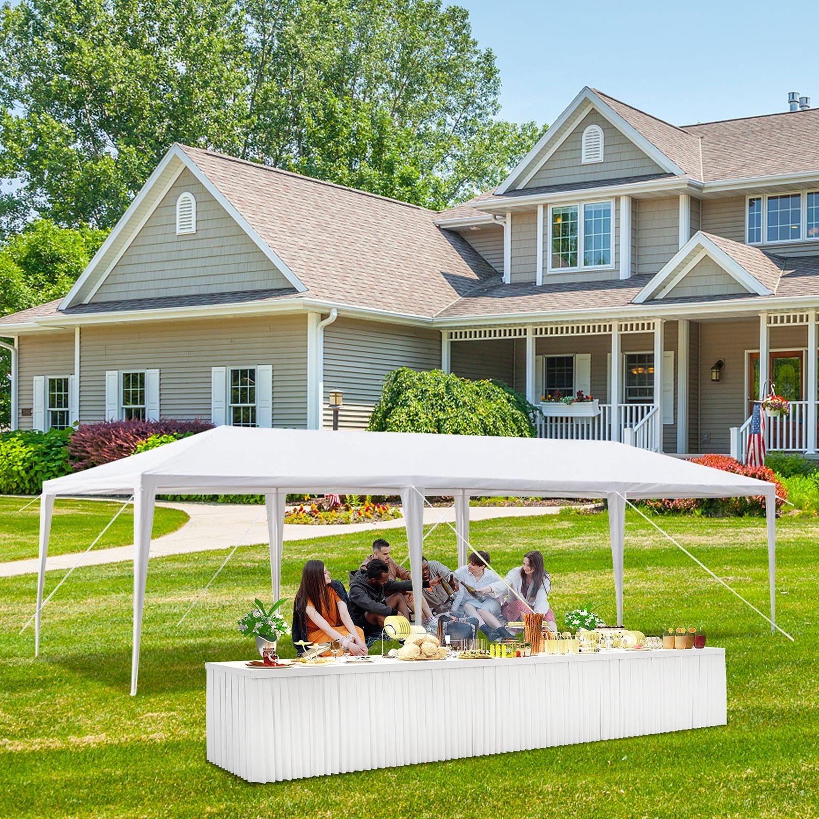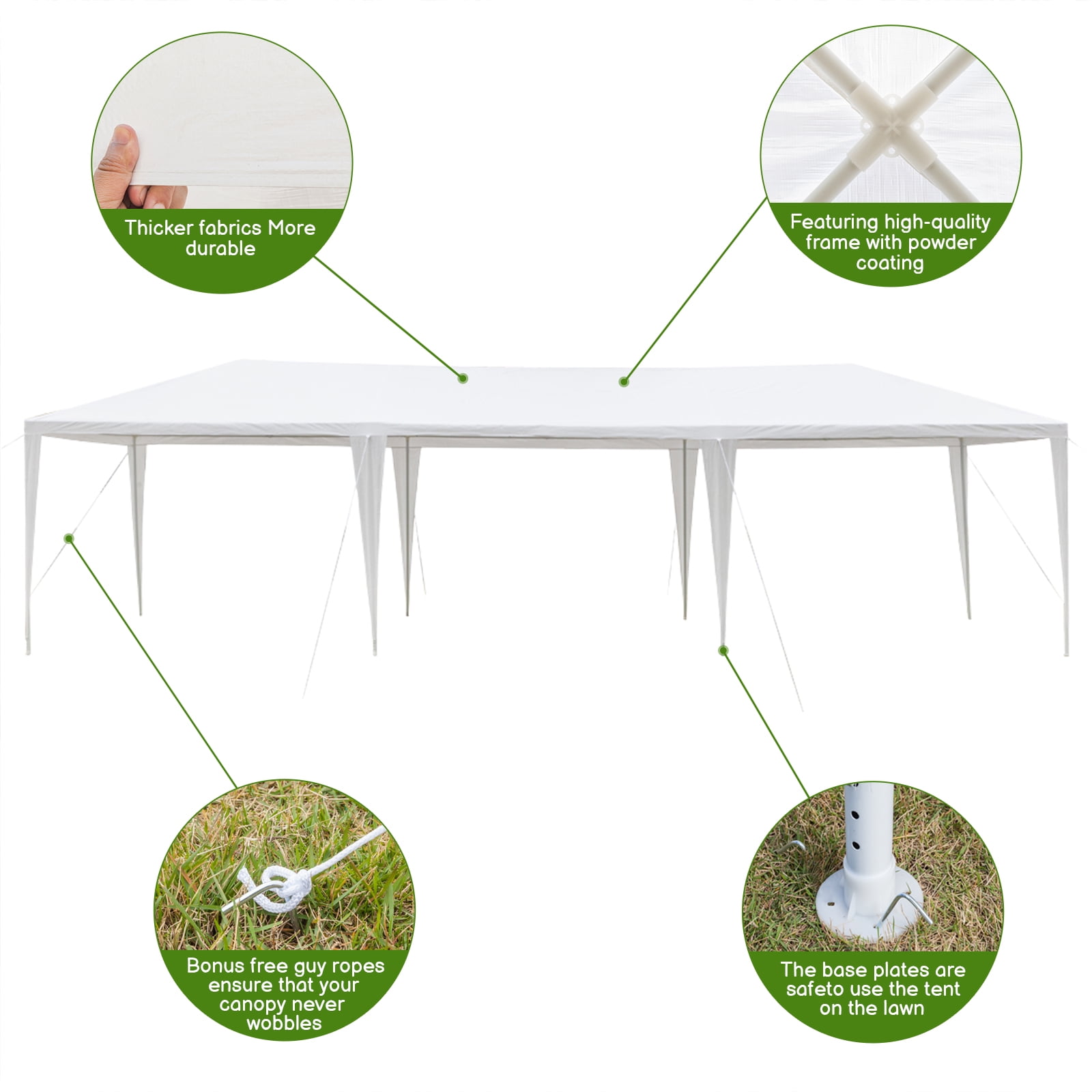 Warm Note: We advise customers to never leave canopy up overnight or under bad weather conditions. This canopy tent can ensure you guys have a lot of fun in such large space Multifunctional Outdoor Use: This outdoor canopy event tent features various of outdoor use, it is perfect for outdoor patio leisure events, commercial business, outdoor parties, birthday, sporting events, picnics, BBQ, carport and so on Waterproof Material: This party tent can hold about 30-50 people, durable water-resistant polyethylene cover blocks up to 90% of the sun UV rays. Material: The canopy is made of polyethylene, which is water and UV resistant. The metal frame is coated with anti-rust and anti-corrosion powder to ensure the longevity of the party canopy