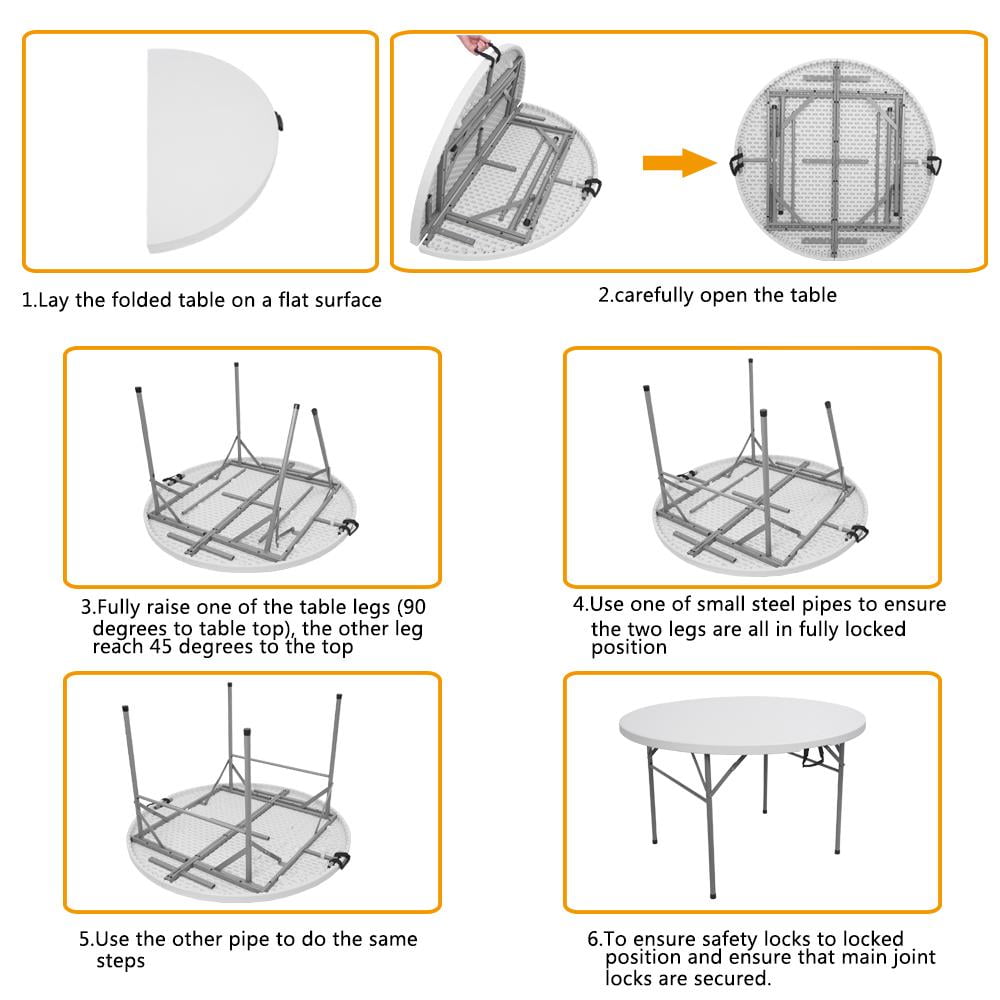 Features: Foldable and Lightweight Design: This table is designed with foldable top and legs. When you are not in need, you can put it in the corner and it does not take up much space. With the light weight, it is also very easy for you to remove. MDF and Steel Material: It is made of sturdy material, which is very durable and stable. The max loading weight capacity of the table is 400kg. It will be enough for daily life. Easy to Clean: The top of the table is made of aluminum, which is waterproof, scratchproof and not easy to get rusty. Because of this feature, it makes much easier for you to clean after use. No assemble needed: This table is not needed for assemble. It can be easily set up and folded within several minutes. Multifunctional Use: This portable table is a good choice for family reunions, picnics, camping trips, buffets or barbecues. It is perfect for both indoors and outdoors use. Specifications: Material: HDPE & Steel Color: White Table Top and Gray Plastic-Sprayed Steel Pipe Dimension: (48.03 x 48.03 x 29.13)” / (122 x 122 x 74)cm (L x W x H) Fold Dimension: (48.03 x 24.02 x 3.54)” / (122 x 61 x 9)cm (L x W x H) Weight: 30.86lb / 14kg Load Capacity: 881.85lb / 400kg Package Includes: 1 x 48inch Round Folding Table 1 x Manual