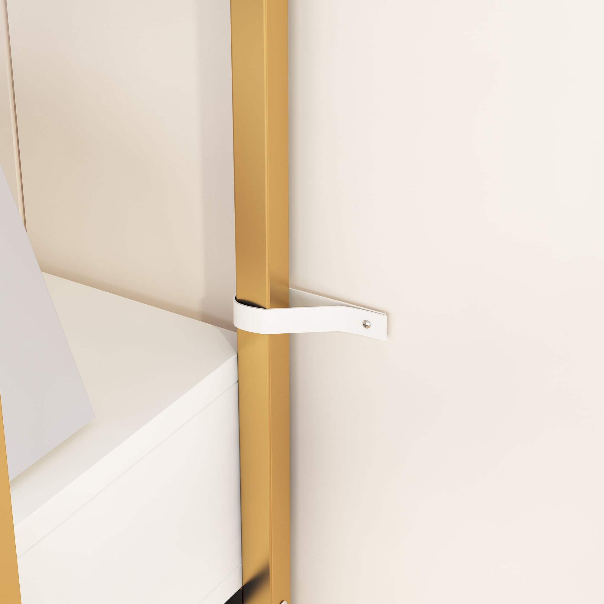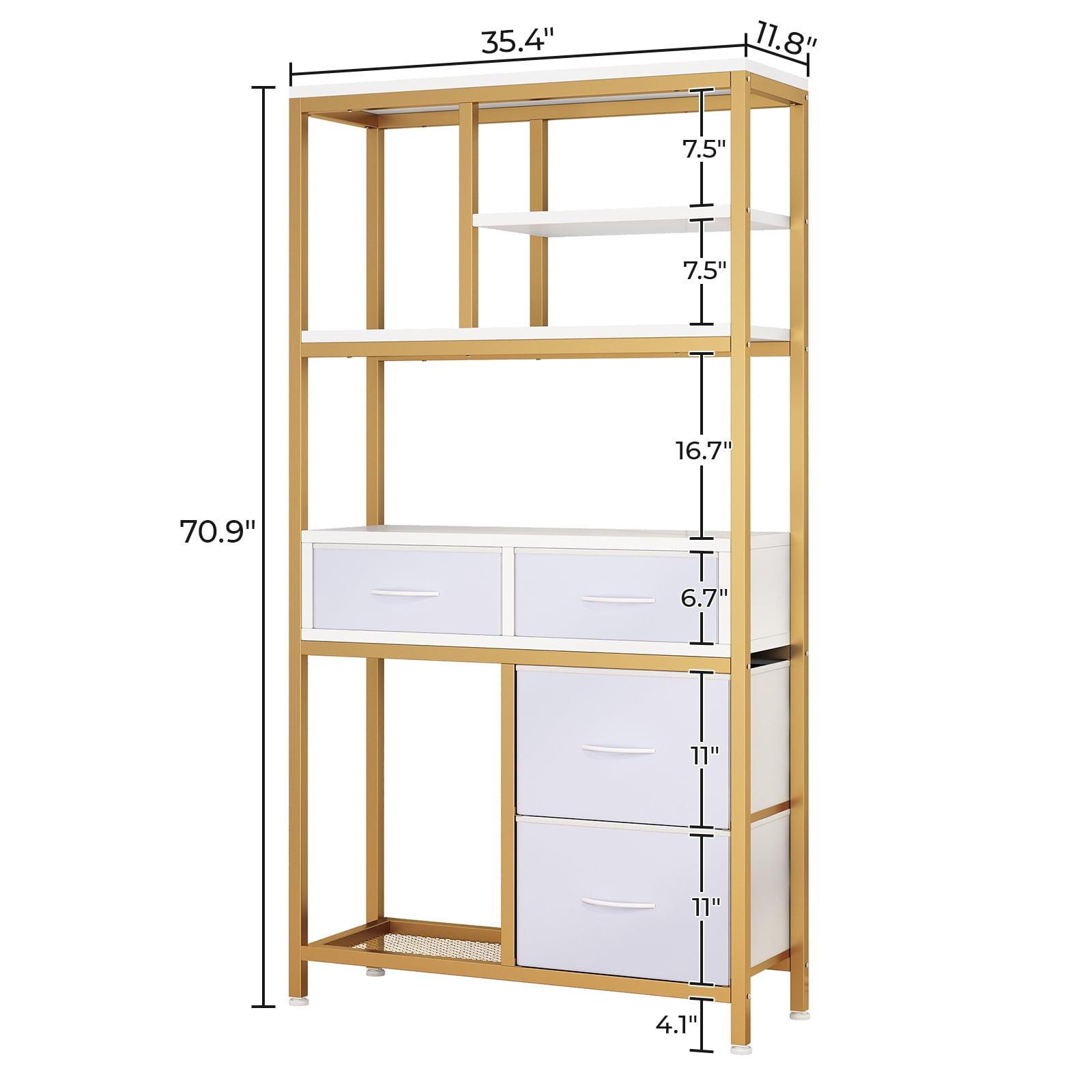 UBesGoo Accent Open Display Shelves Bookcase for Office, 35.43″x11.81″x68.50″, Metal Gold, 57.32 lb Metal frame construction ensures a sturdy bookshelf that can withstand significant weight Thickened board with waterproof coating provides excellent durability and is easy to clean Open shelves allow for easy visibility and access to all stored and displayed items Includes 3 fabric drawers for convenient organization of photos, books, and collectibles Designed with a golden frame and particle board, adding a touch of luxury and minimalism to your space