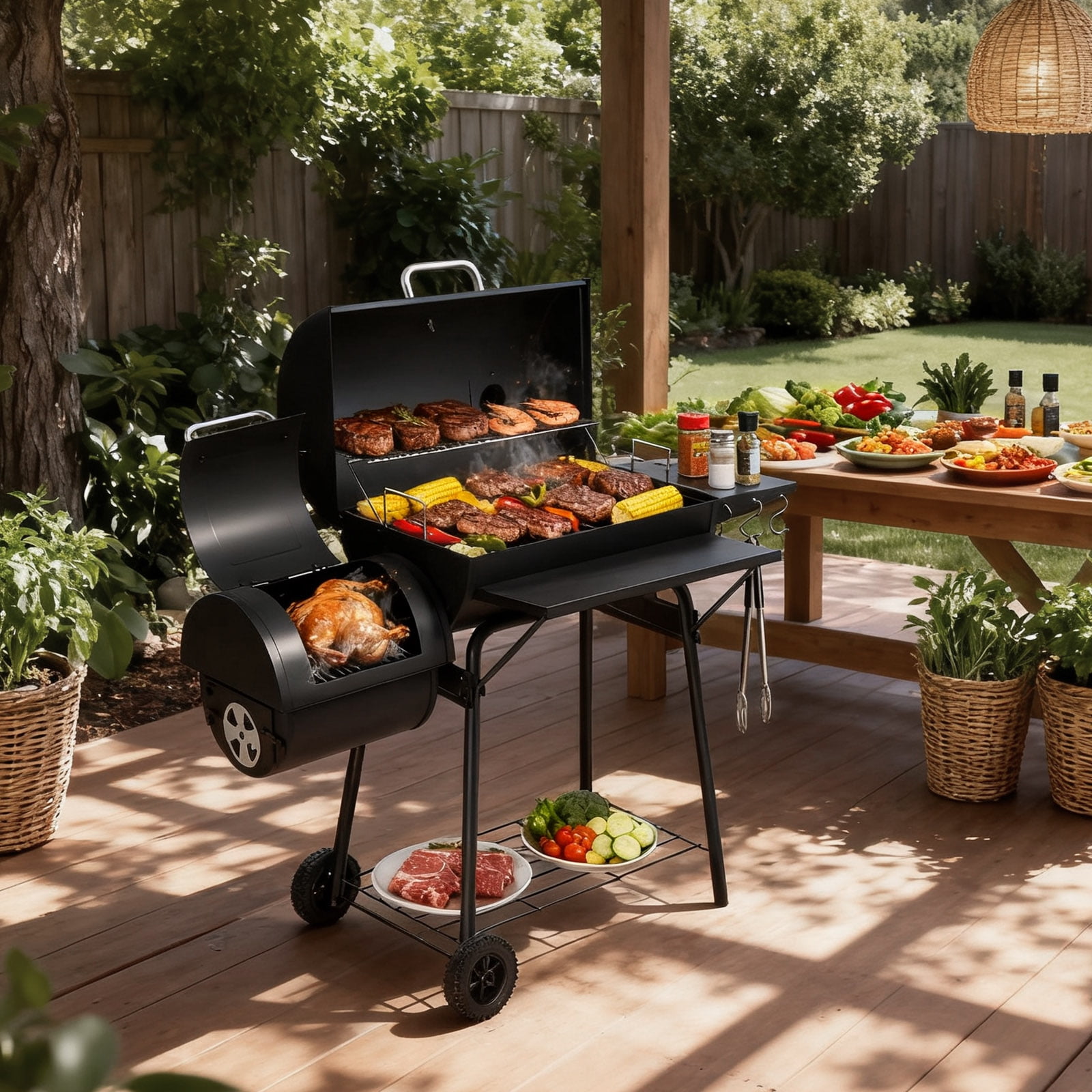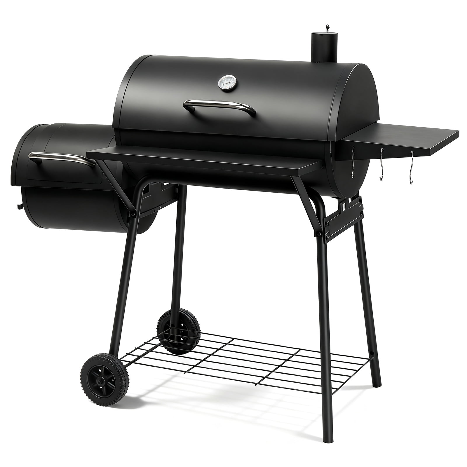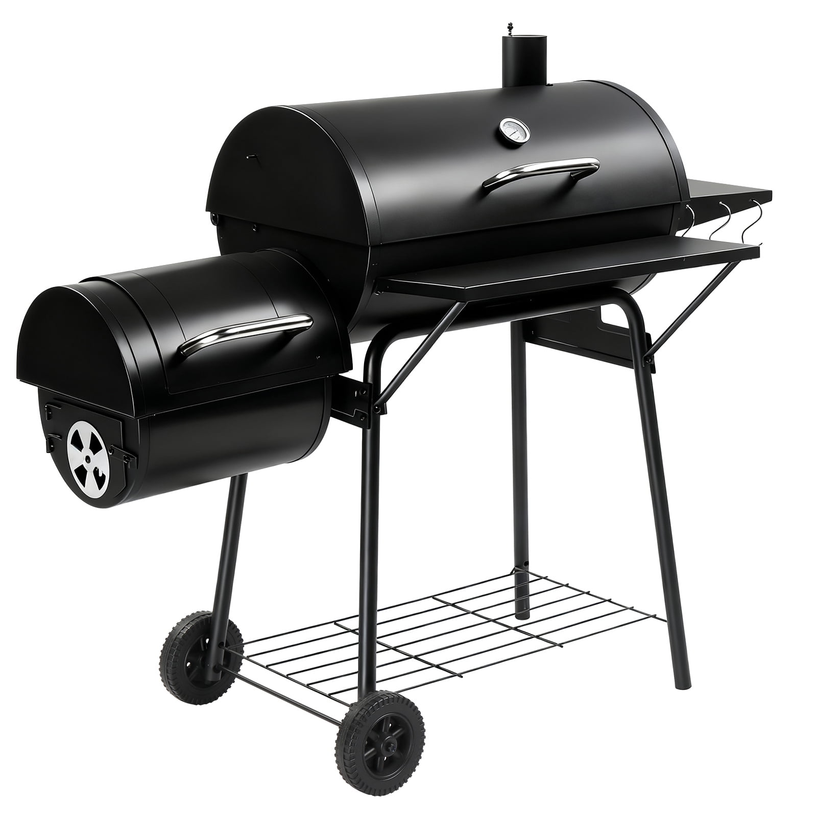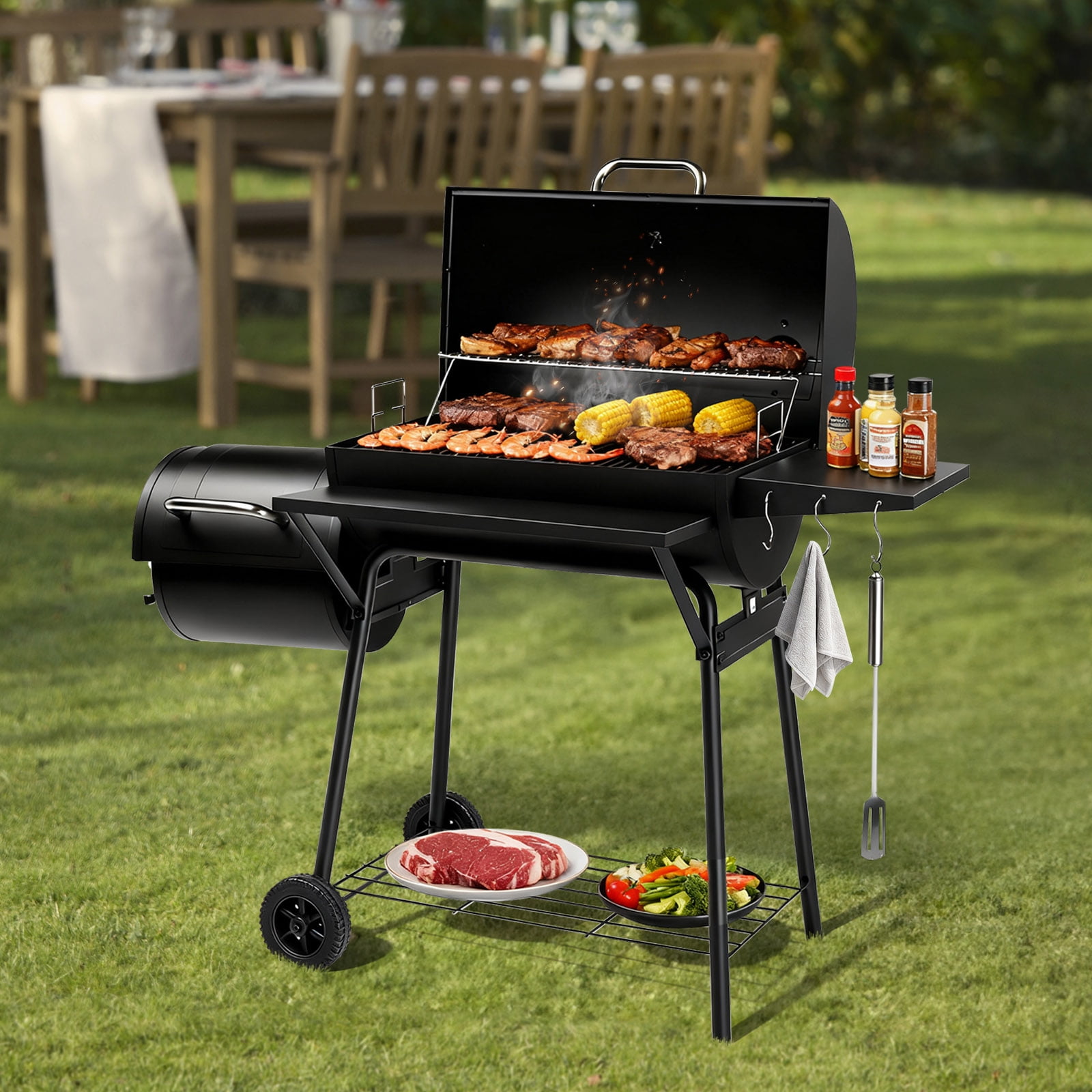 UBesGoo Charcoal Grill Portable BBQ Grill and Offset Smoker Steel BBQ Pit Outdoor for Camping, Black With the 2-in-1 Combination Grill, you can unlock a world of culinary possibilities. Experience both smoking and grilling with this versatile and efficient cooking system. This grill provides ample cooking space to cater to all your grilling needs. You can easily cook for a small family gathering or a large backyard party. Say goodbye to overcrowded grills and enjoy hassle-free cooking with this spacious grill. Keep track of the internal temperature of your grill with the built-in temperature monitor. This convenient feature allows you to monitor the heat levels and make necessary adjustments to ensure that your food is cooked to perfection every time. Say goodbye to guesswork and achieve consistent results with precision temperature monitoring. The adjustable built-in damper provides you with complete control over the heat distribution in your grill. Whether you prefer low and slow smoking or high-temperature grilling, this grill allows you to easily adjust the airflow and maintain the ideal temperature for your cooking style. Achieve deliciously flavorful results with precise heat control. Despite its robust construction, this grill is designed for easy mobility. Featuring durable wheels and a sturdy handle, you can effortlessly move the grill from one location to another. Whether you want to set it up in your backyard or take it on a camping trip, mobility is never a concern with this conveniently portable grill.