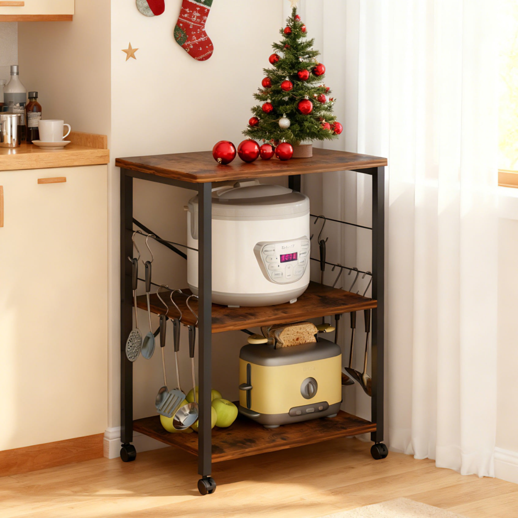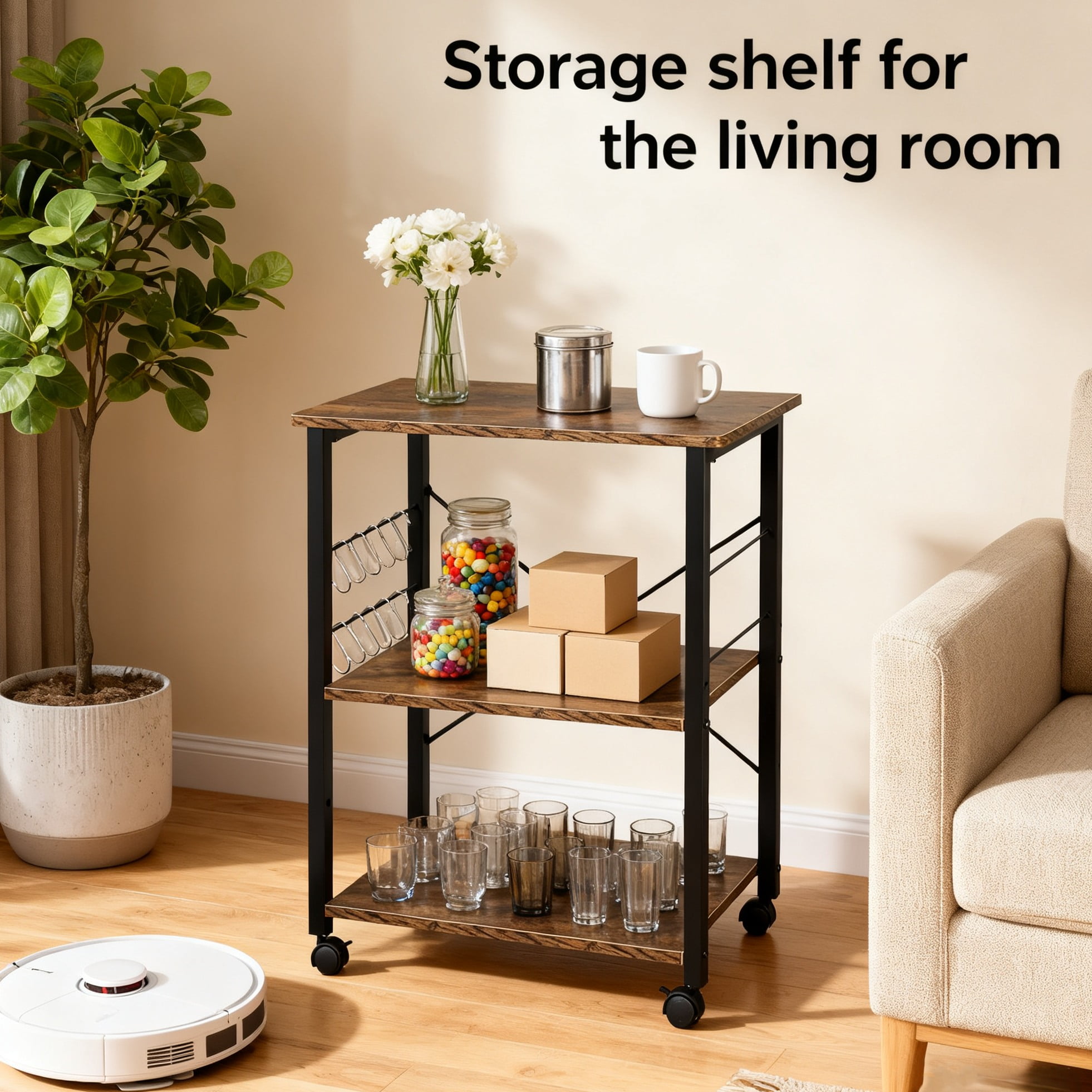 1. Mobile kitchen storage rack–This kitchen cart is equipped with 360-degree swivel wheels, which is easy to use and can be switched according to your needs. A bar cart on wheels can be moved wherever you want. With foot pads, the table will not move easily. 2. Sturdy and durable structure–The kitchen storage cart is a perfect combination of matte metal and vintage brown wooden boards, presenting a refined wooden appearance. Bread racks are not only practical, they can also be used to decorate your room. 3.3-Tier Storage Rack–The wheeled kitchen cart provides plenty of storage space and you can layer items as needed. 4. Multifunctional use–This industrial utility cart with side metal hooks can be used anytime and anywhere, such as it can be used as a living room table, study bookshelf, bar cart, cafe or kitchen cart, office printer stand , storage racks, bathroom or balcony storage, etc. 5. Quick assembly and space saving–This small bread rack comes with complete accessories and is easy to assemble. You no longer have to worry about tripping over items in your home. This cafe cart provides compact, organized and space-saving storage of household items.