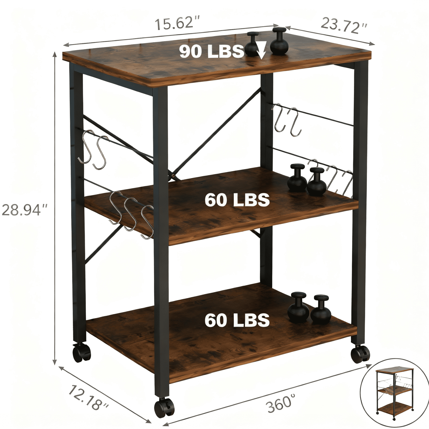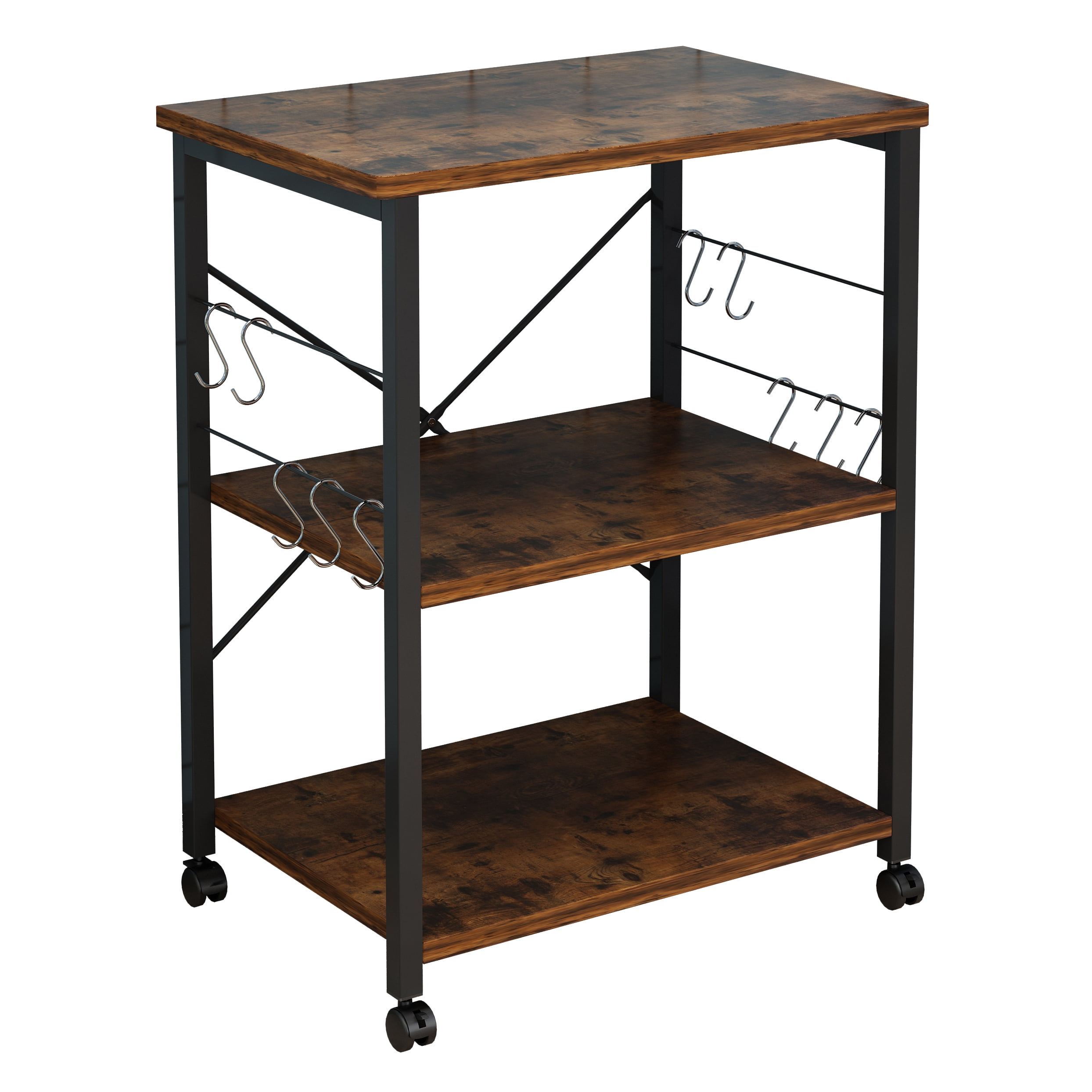 Features: Mobile kitchen cart with wheels Use 3-tier shelves and side metal hooks 15mm thick durable chipboard kitchen utility durable trolley Black metal frame storage cart Microwave oven rack X-shaped design provides more support Kitchen cart table comes with numbered parts and detailed instructions Space-saving organizer is easy to assemble Modern simple fashion Can be used as a kitchen storage rack, shelf, tableware storage rack, microwave rack or other kitchen utensils Specifications: 1. Color: Vintage / Black 2. Material: P2 MDF 3. Size: (23.62 x 15.75 x 28.94)” / (60 x 40 x 73.5)cm(L x W x H) 4. Weight: 22lbs Package Includes: 1 x Baker’s Rack