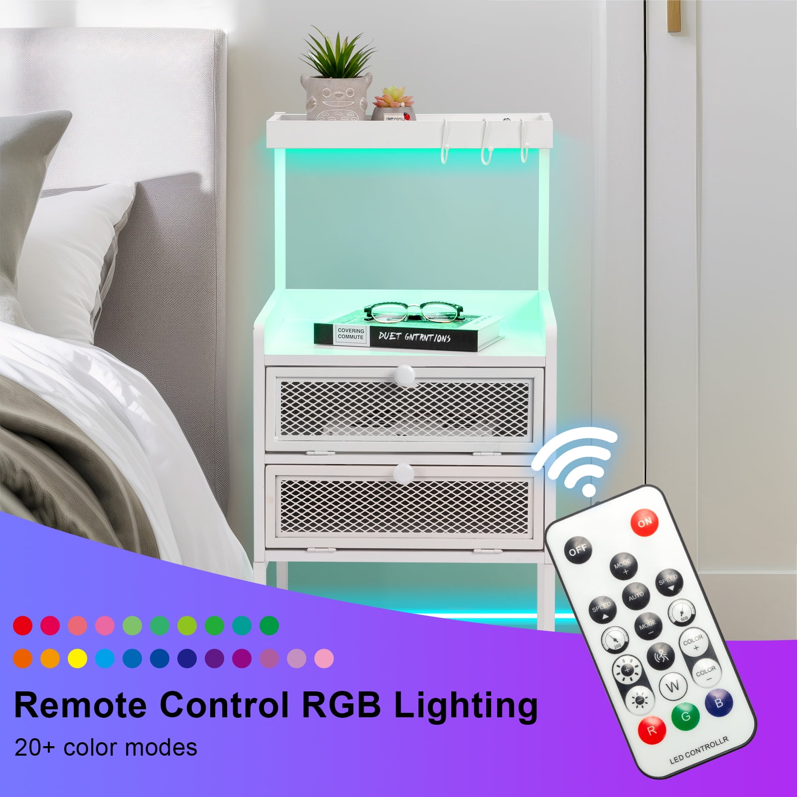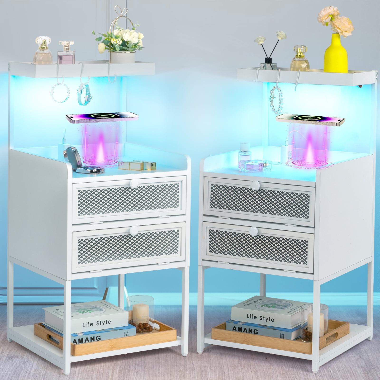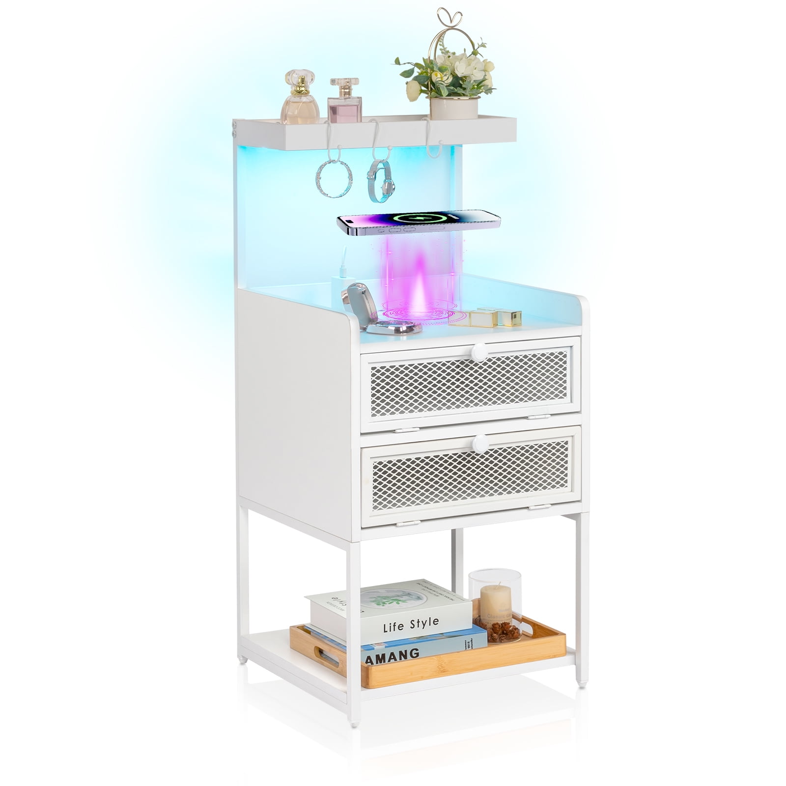 UBesGoo Nightstand with Wireless Charging Station, Night Stands for Bedroom with LED Light, Bedside Table with 2 Drawer, End Side Table, White