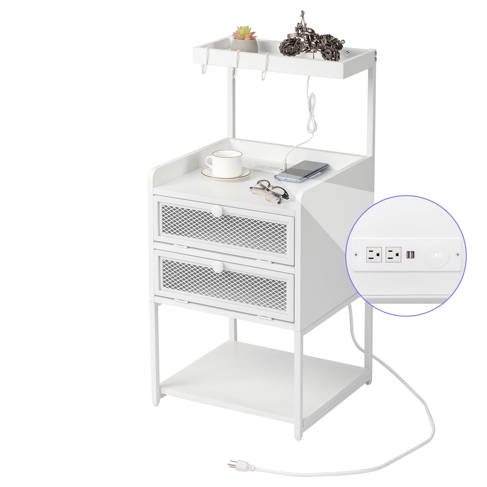 Multifunctional Design: The nightstand isn’t just a bedside table; it’s your ultimate bedside companion. Equipped with wireless charging capabilities, two USB ports, and two standard plug outlets, it ensures your devices stay powered up and within reach, all through the night. Illuminating Ambiance: With a remote-controlled LED light, the nightstand lets you set the perfect mood with just a click. Whether you prefer a soft glow for late-night reading or a gentle radiance for winding down, this feature ensures your bedside ambiance is always just right. Innovative Storage Solutions: Organize your essentials effortlessly with two drawers featuring iron mesh faces, adding a touch of industrial charm while keeping your items visible. The sturdy metal frame ensures durability, providing a reliable storage solution for years to come. Robust Construction: Built to withstand the test of time, the nightstand boasts a robust metal frame that guarantees stability and longevity. Rest easy knowing your bedside essentials are securely supported by this durable piece of furniture. Ample Storage Capacity: Never compromise on storage space again. With two drawers, two shelves, and three hooks, the nightstand offers ample room for your nighttime necessities. From books and electronics to personal trinkets, everything finds its place effortlessly within arm’s reach.
