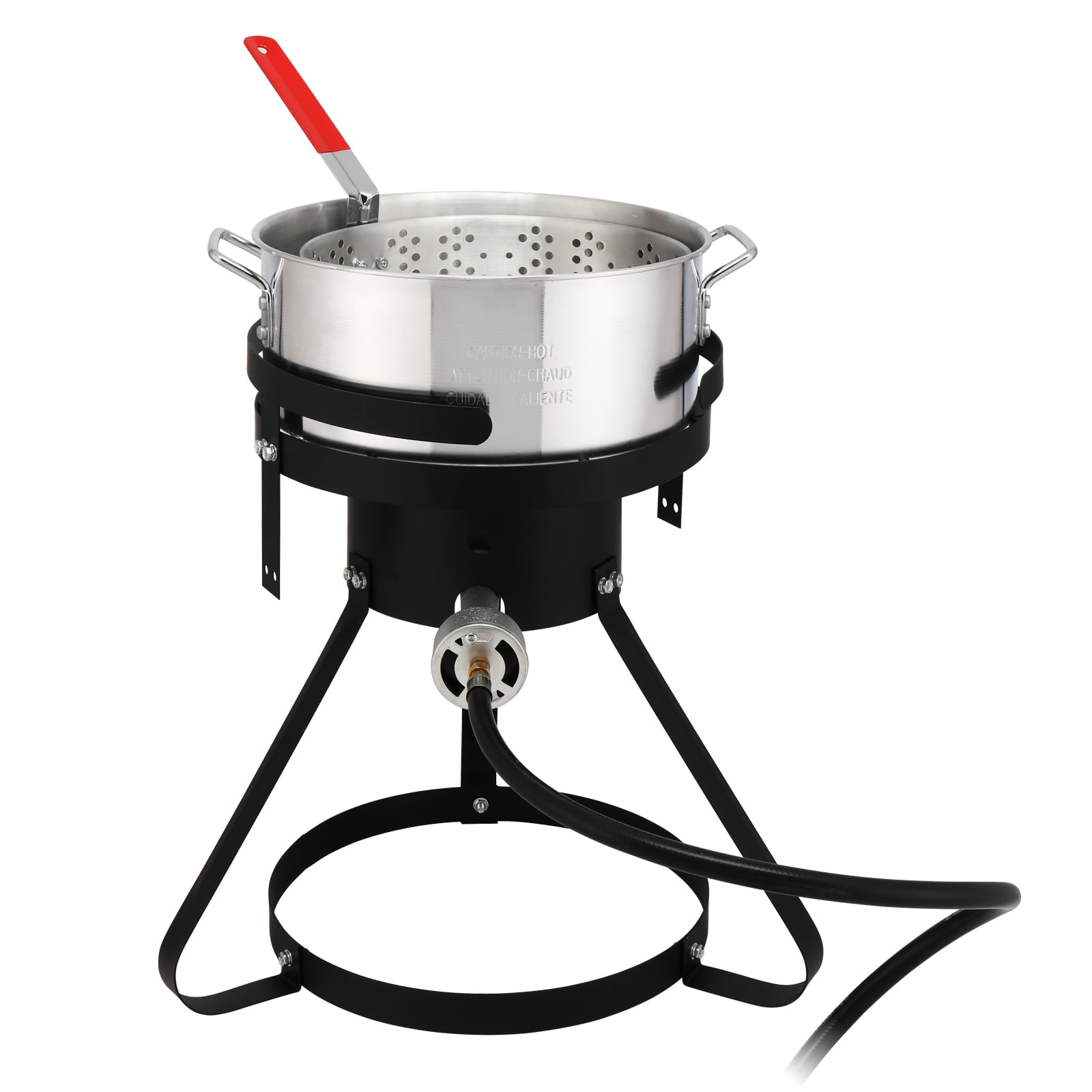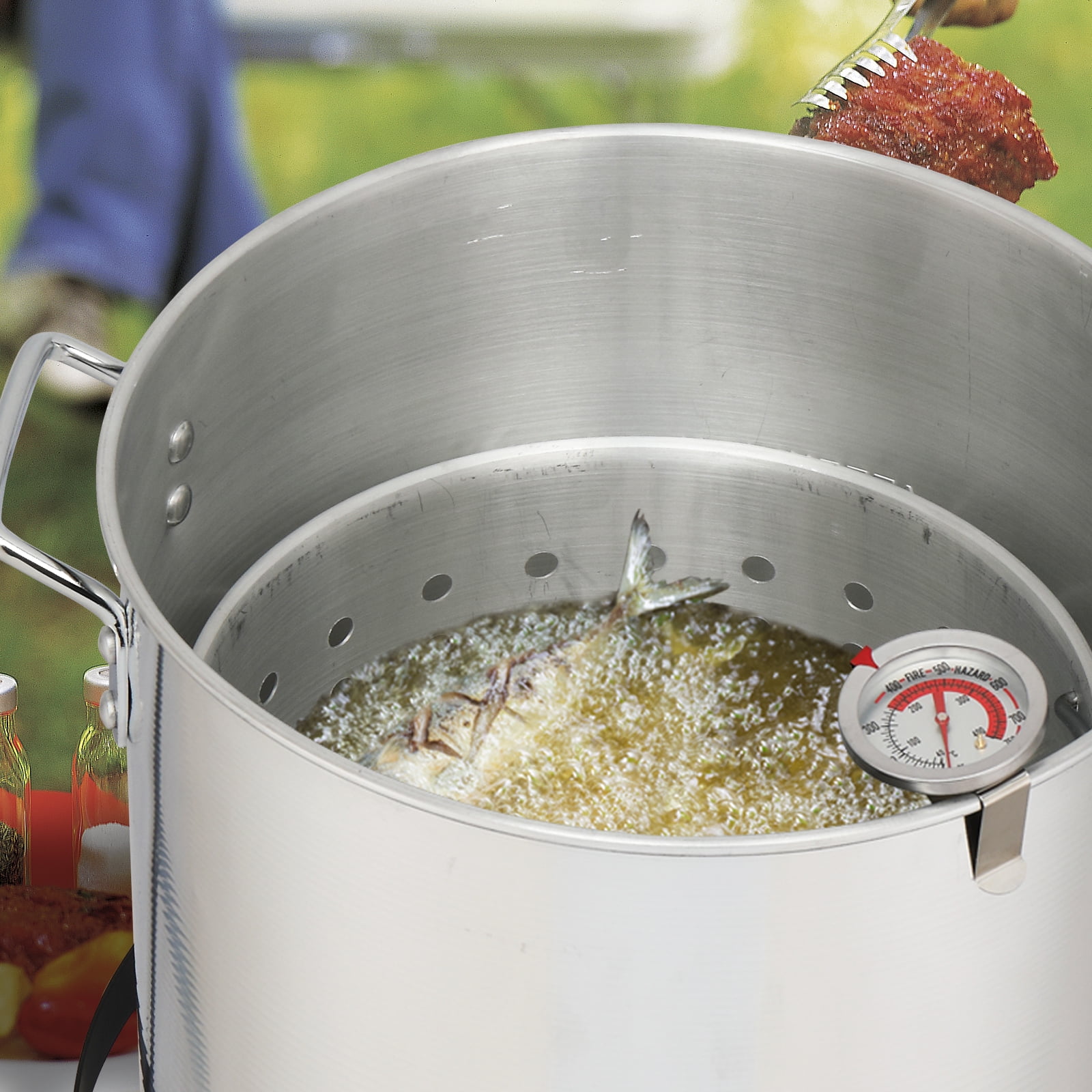 UBesGoo Outdoor Propane Fryer Pot Boiler 30qt Aluminum Turkey Fryer Outside w/ Injector Thermometer A reliable burner for diverse cooking, a great tool for turkey frying, crab boiling, Cajun cooking, and other types of outdoor cooking Marinade injector that adds the different flavor is hassle-free for turkey preparation. Instant read long probe thermometer helps check desired oil temperature in real-time. The lifting handle can hook the top of plated turkey rack easily after deep frying. And dual riveted heat-resistant handles make move the hot pot easily. Perfect for outdoor use, you can cook different food outdoors.You can put food in the basket, which can drain quickly and prevent food from falling